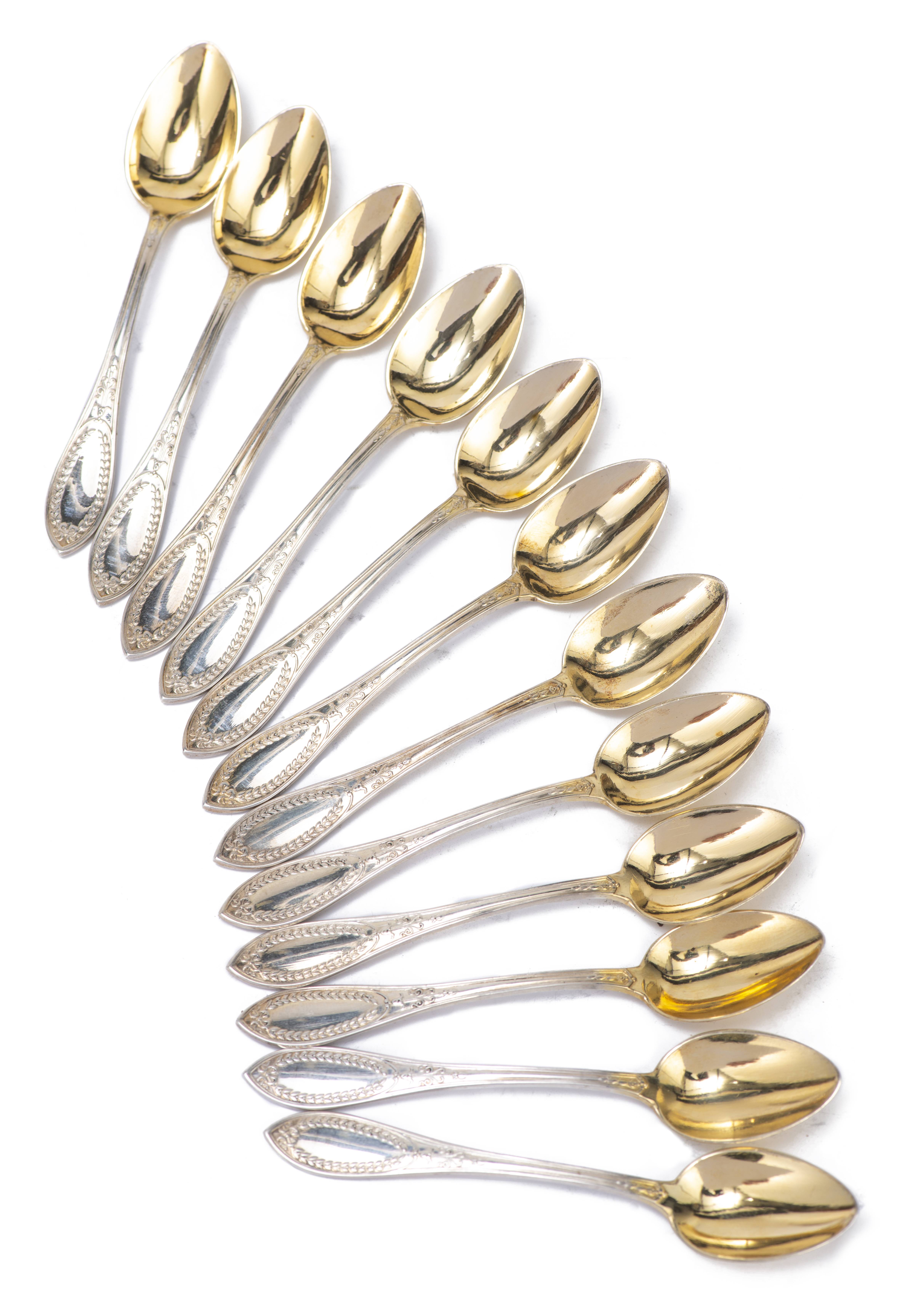 12 cuillères à moka en argent .800, à cuilleron en vermeil, et décor d'une couronne à rubans.