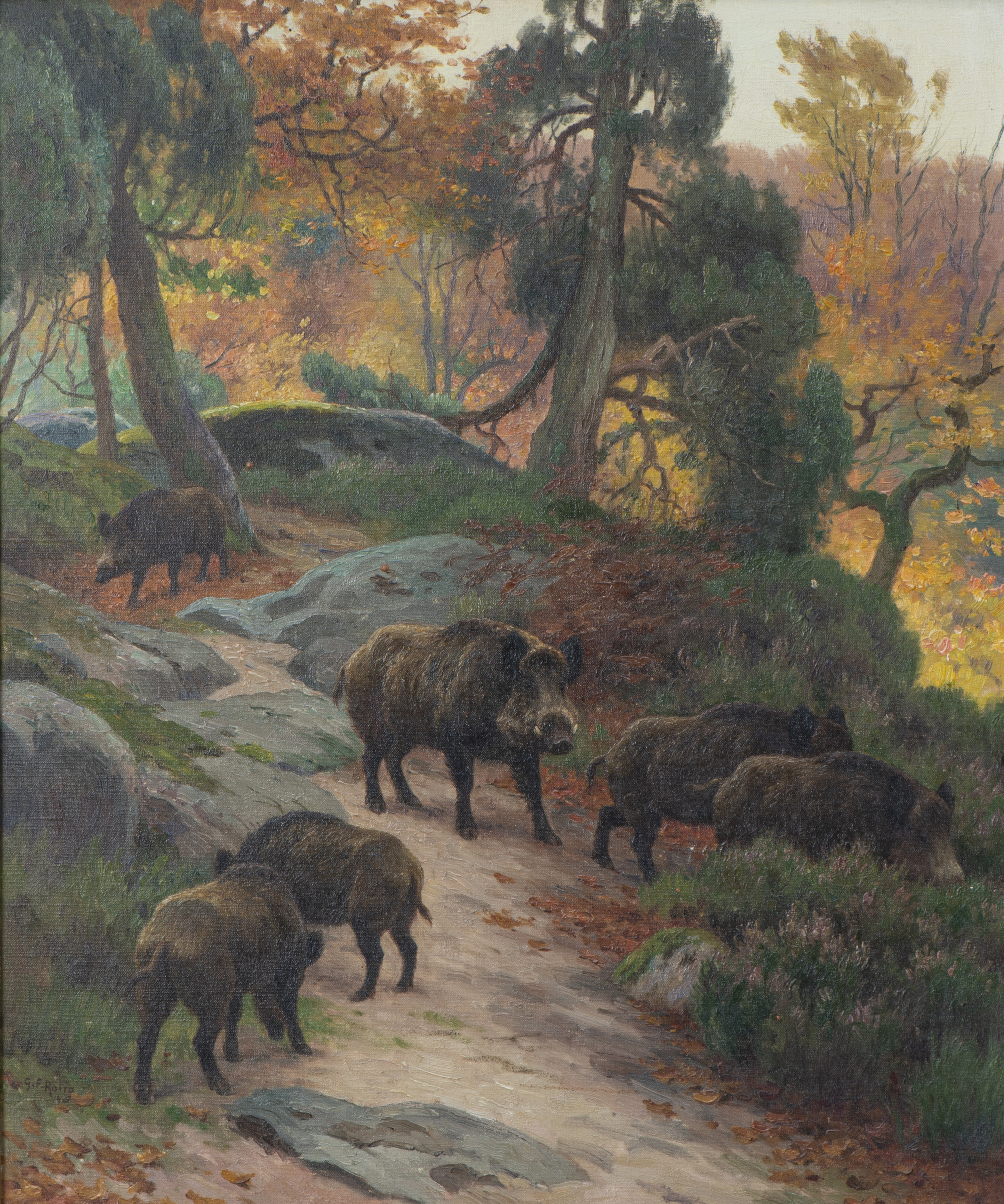 Georges Frédéric RÖTIG (1873-1961), "Sangliers dans les Vosges", huile sur toile, signé en bas à gauche et numéroté 140 sous la signature. Porte une étiquette au dos "N° PL N° 1887".