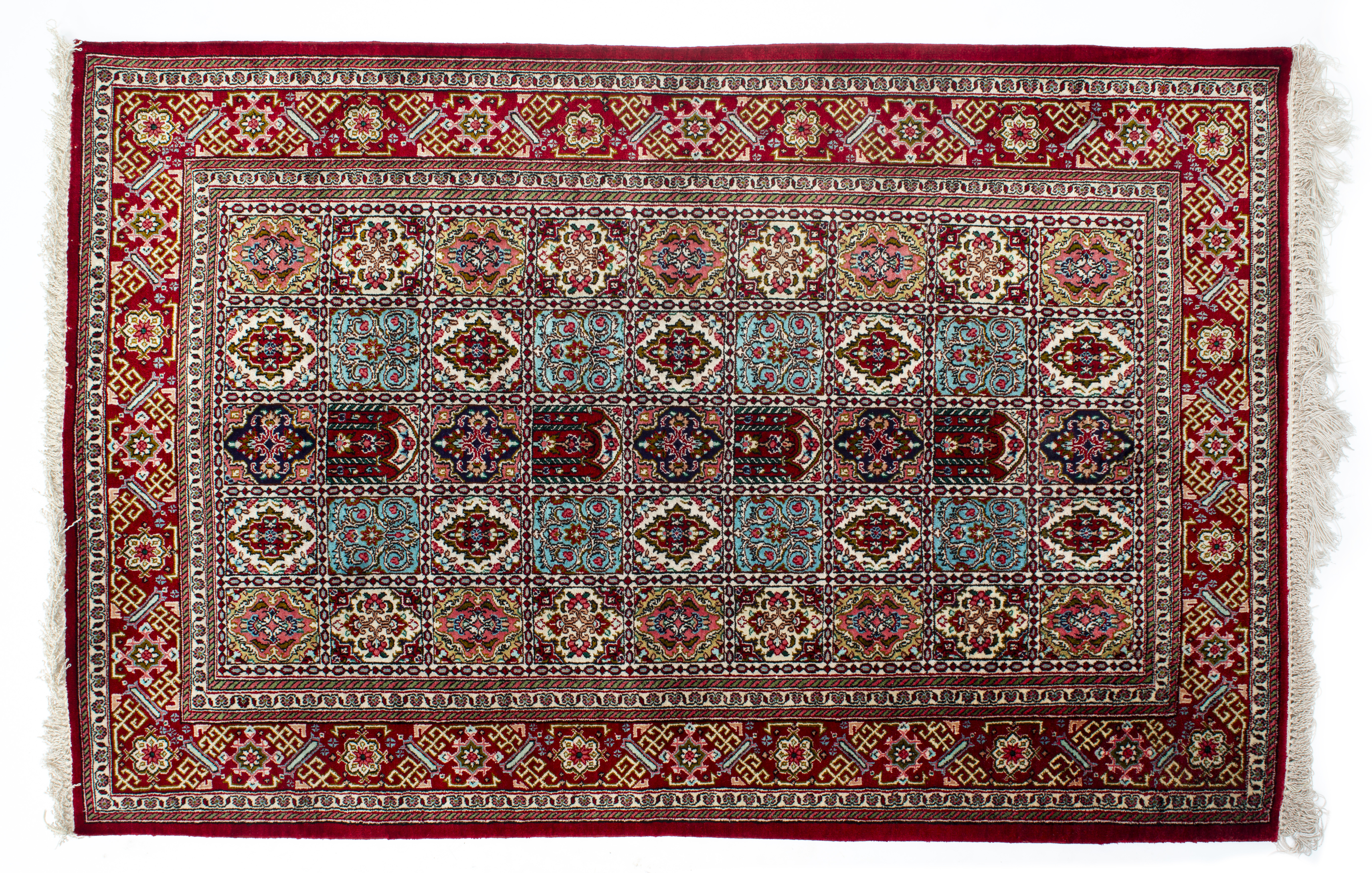 TURQUIE - Tapis de jardin en soie à caissons. Bordure principale d'une frise florale sur champ rouge.