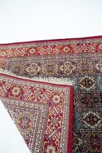 TURQUIE - Tapis de jardin en soie à décor principal de caissons. Bordure principale d'une frise florale sur champ rouge.