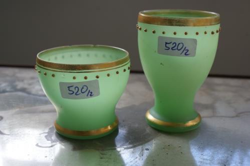 2 gobelets en opaline verte mati sur l'extérieur à surdécor avec raie de perles et dorures H. 11.5 cm, D. 8 cm. pour l'un, H. 7.9 cm. D. 9.5 cm. pour l'autre ( petites ébréchures et imperfections d'usage )