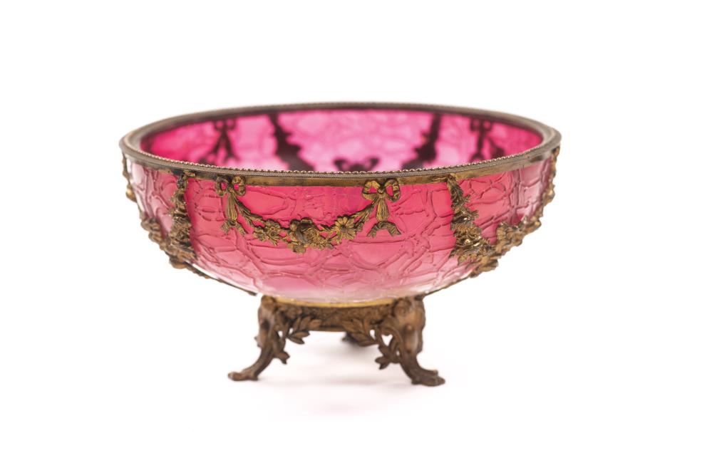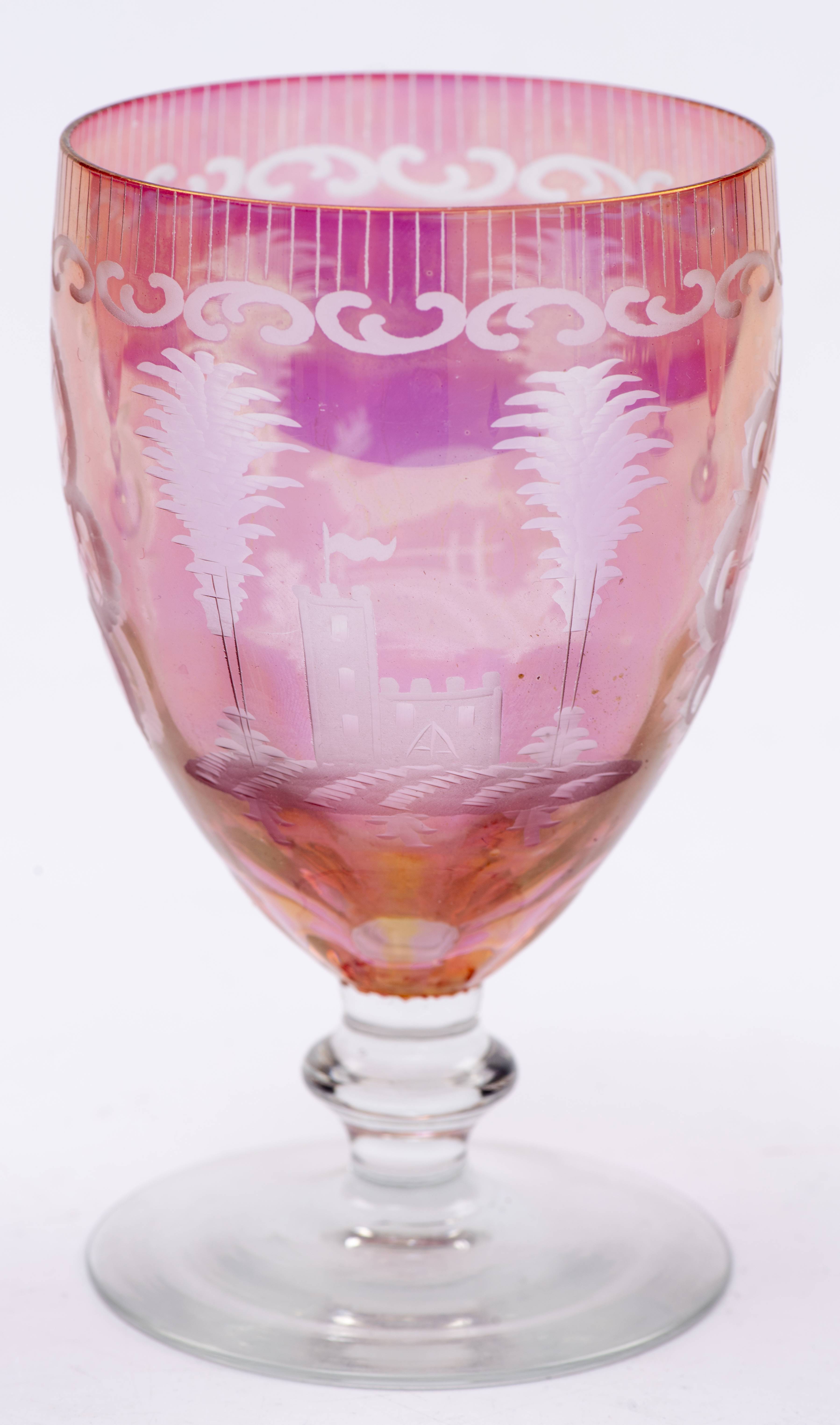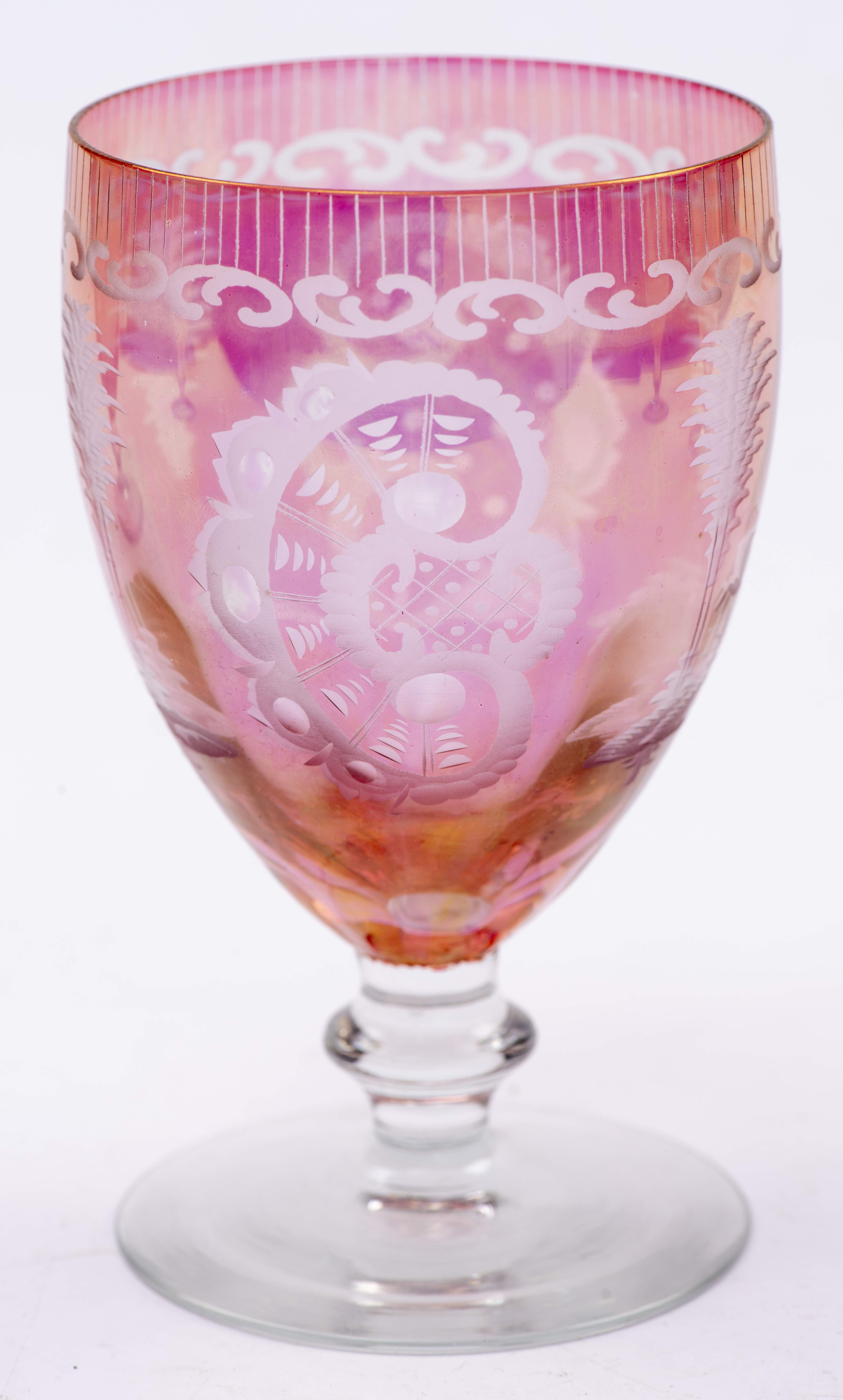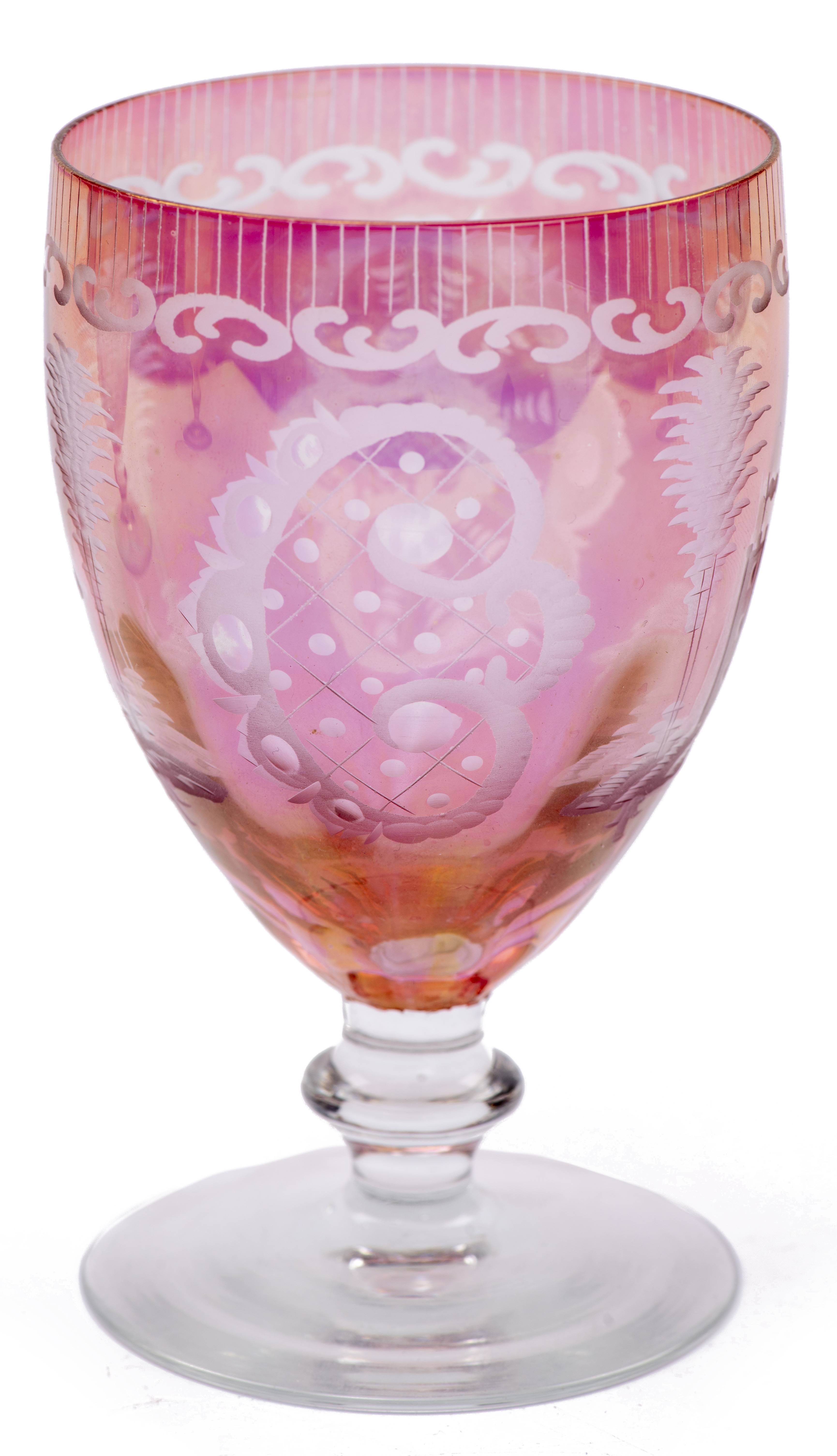 5 verres en cristal de Bohême bicolore rose et incolore gravés sur le contenant de coquilles, cerfs et châteaux XIXe.