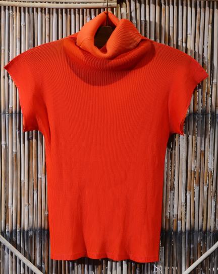 haut plissé Issey Miyake, made in Japan, en polyester de couleur rouge-orange, à manches courtes et col montant. Taille 5.