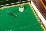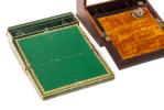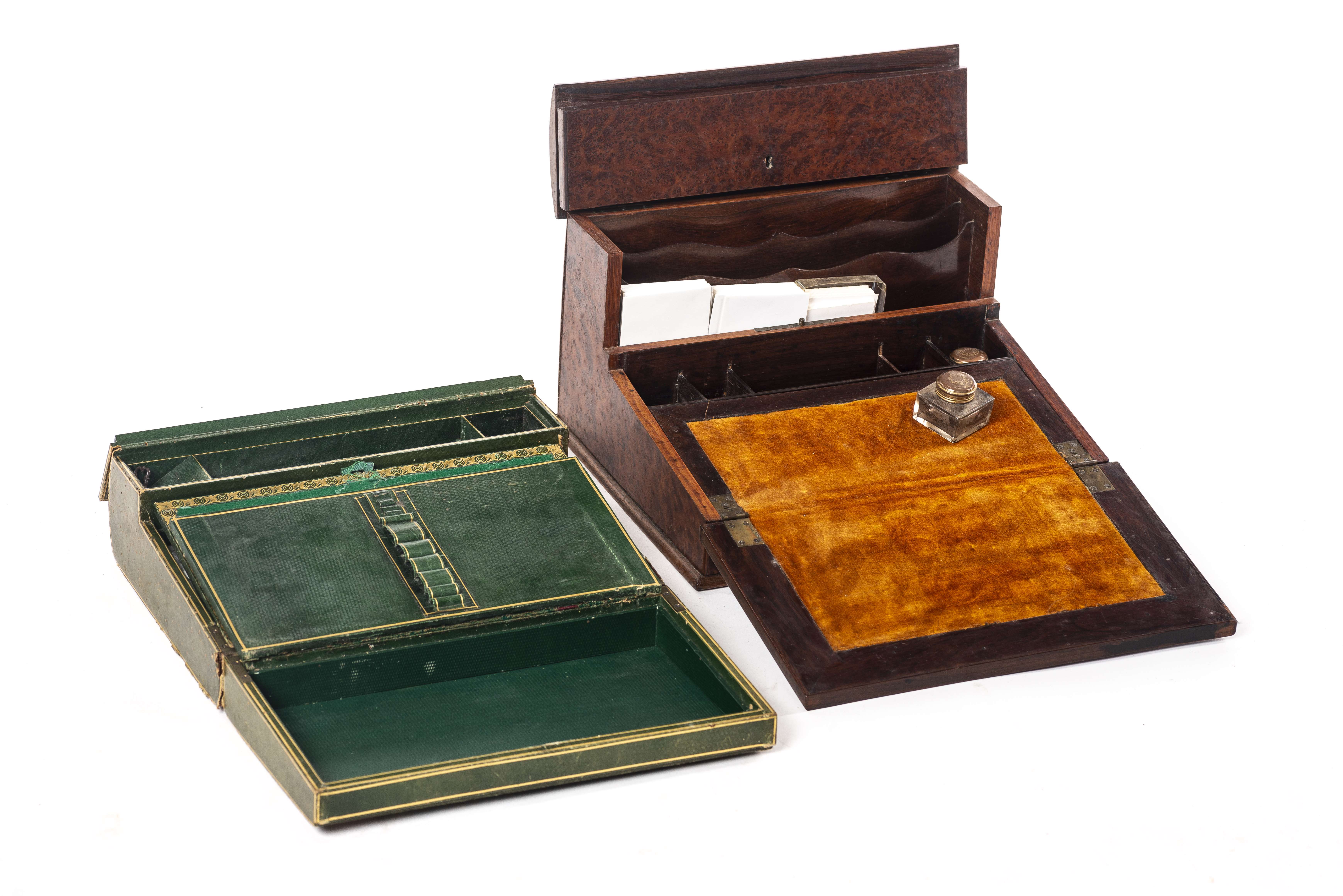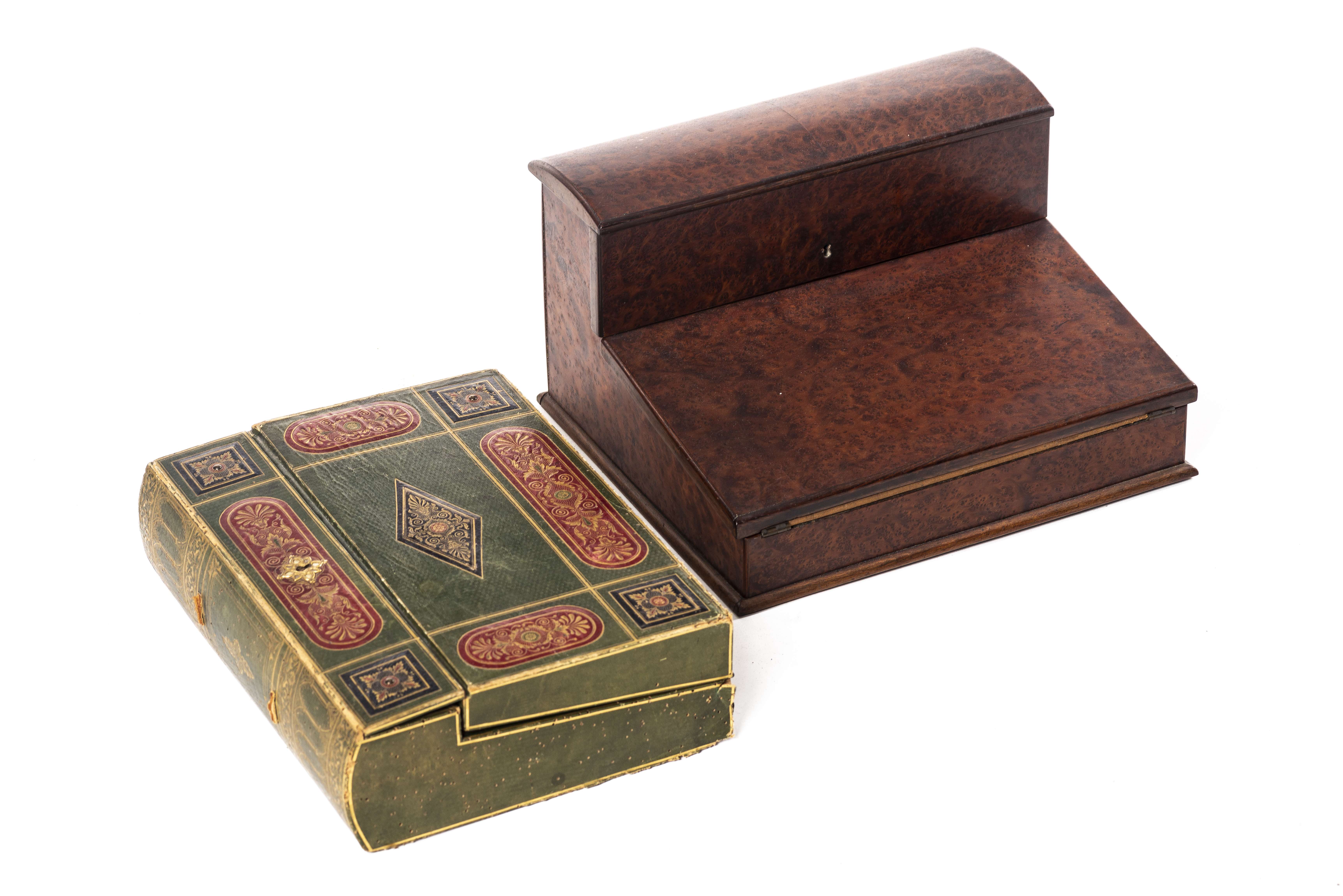 écritoire en acajou : possède sa clé ; écritoire livre : possède sa clé, manque une lanière sur le dos, trous de vers, bords abîmés