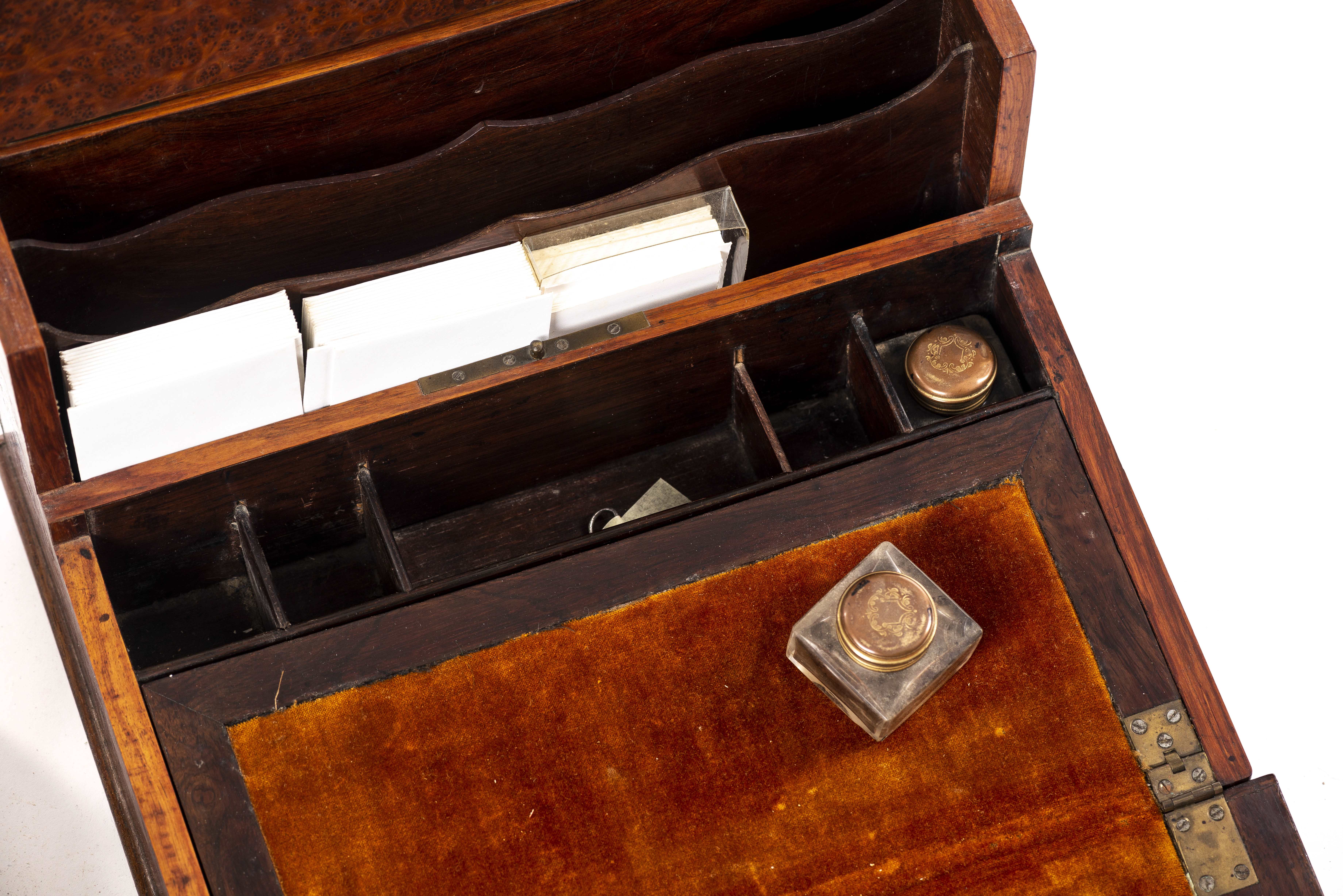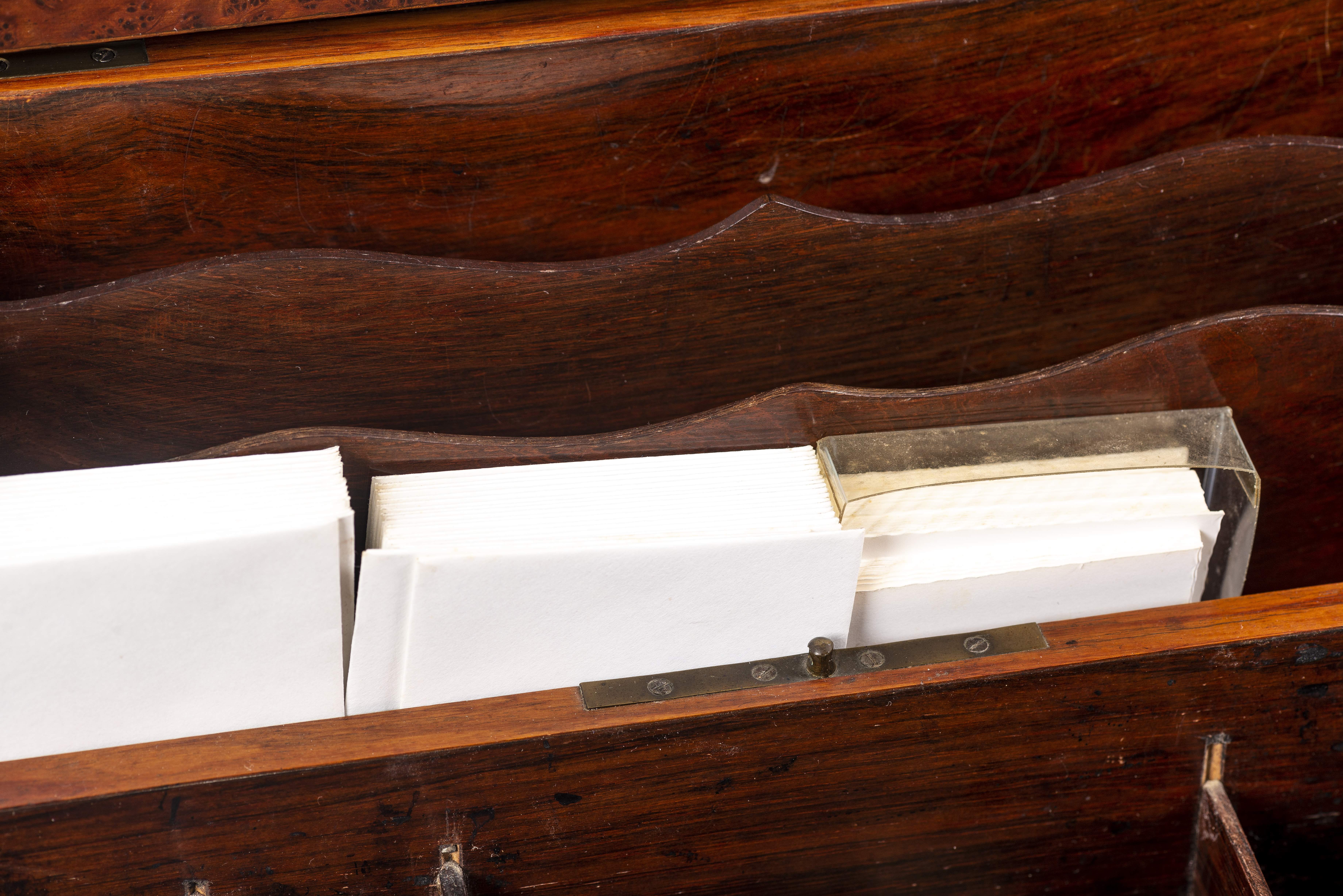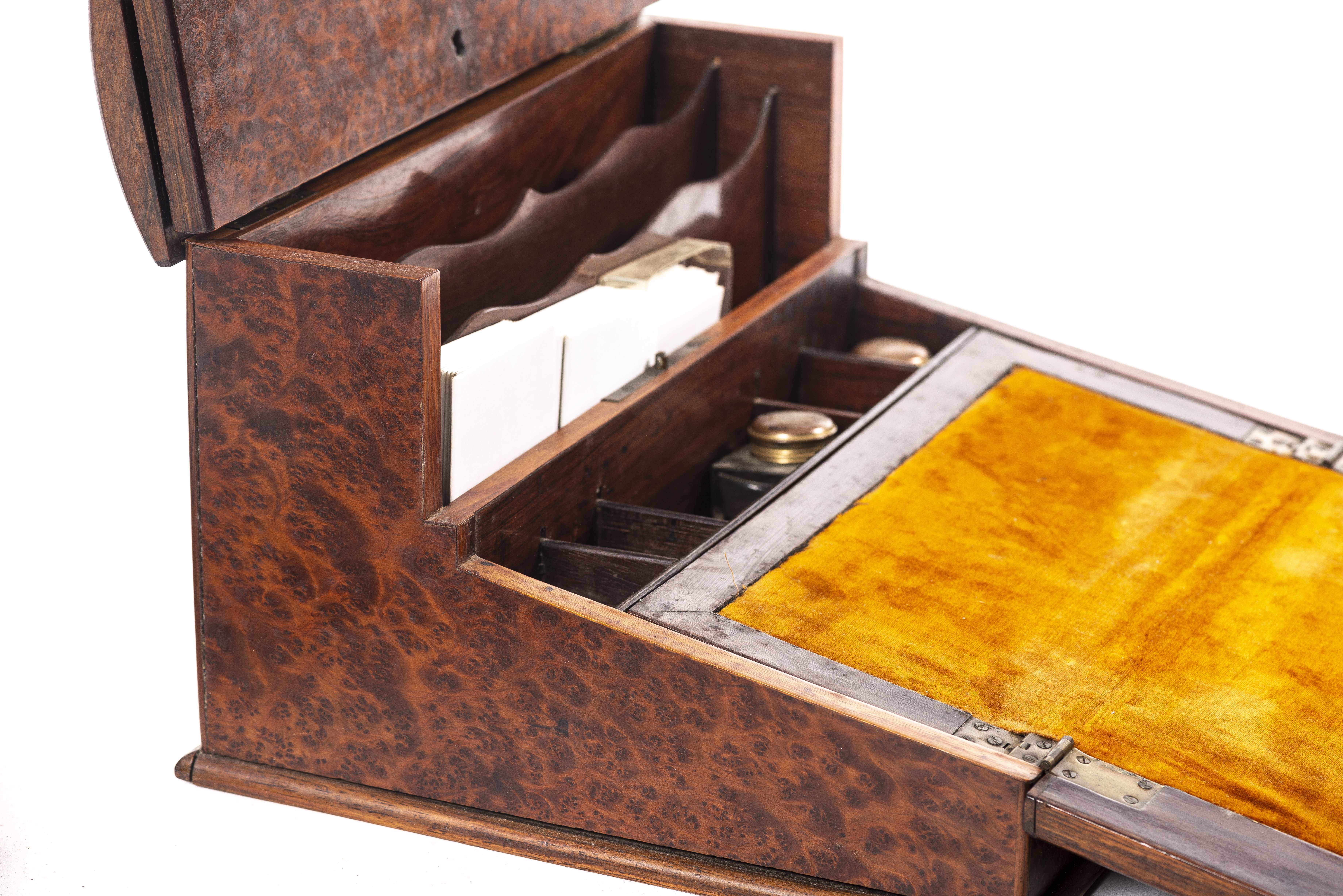 Écritoire en acajou, avec plateau interne recouvert de velours orange, deux encriers en verre et petites enveloppes gliséées dans des casiers à parois mouvementées.
