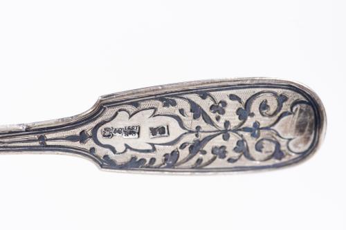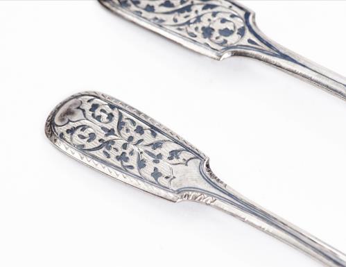 Service personnel en argent russe niellé de 84 Zolotnics de 1887, 1891 & 1893 comprenant une grande cuillère, une fourchette et une cuillère à dessert.