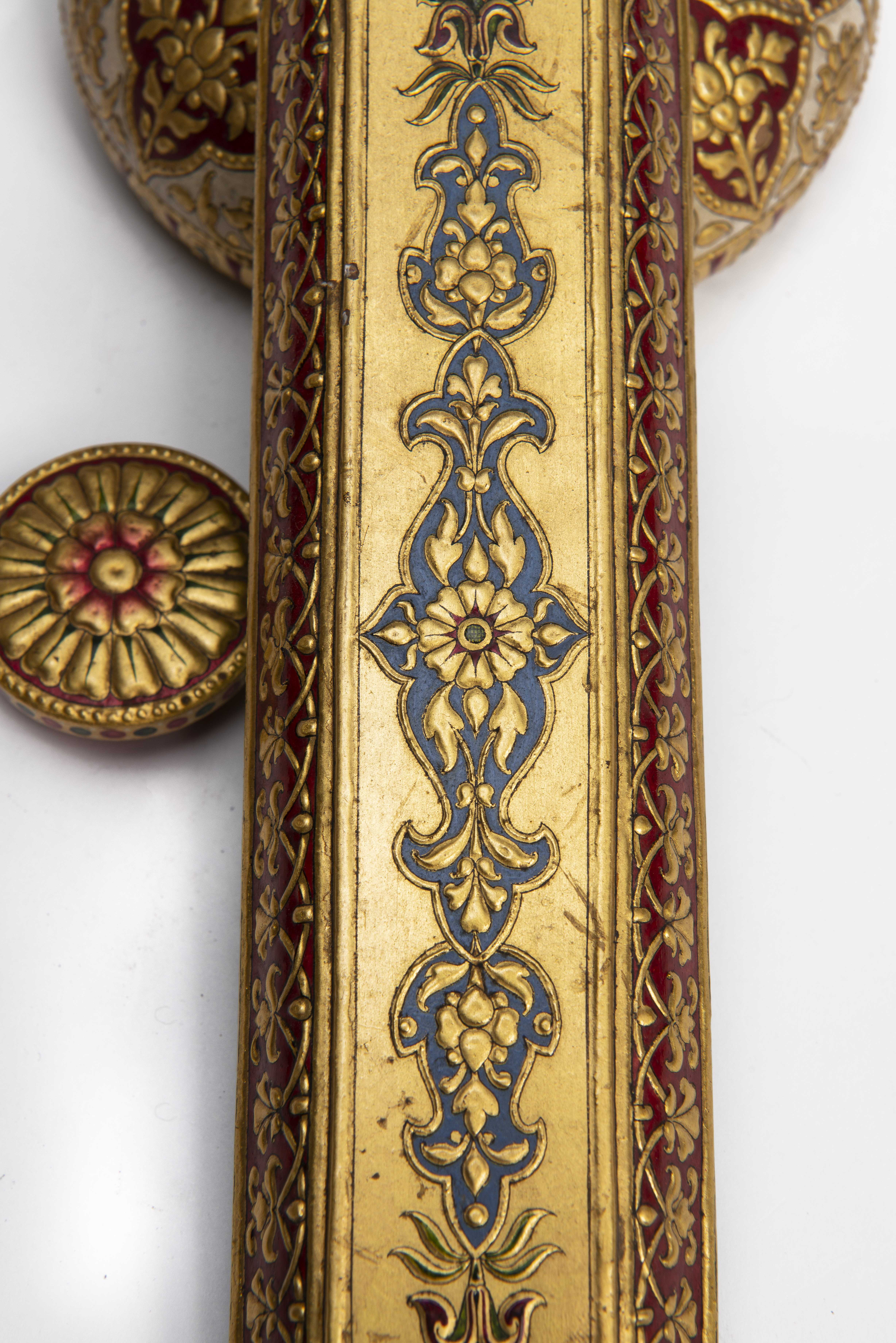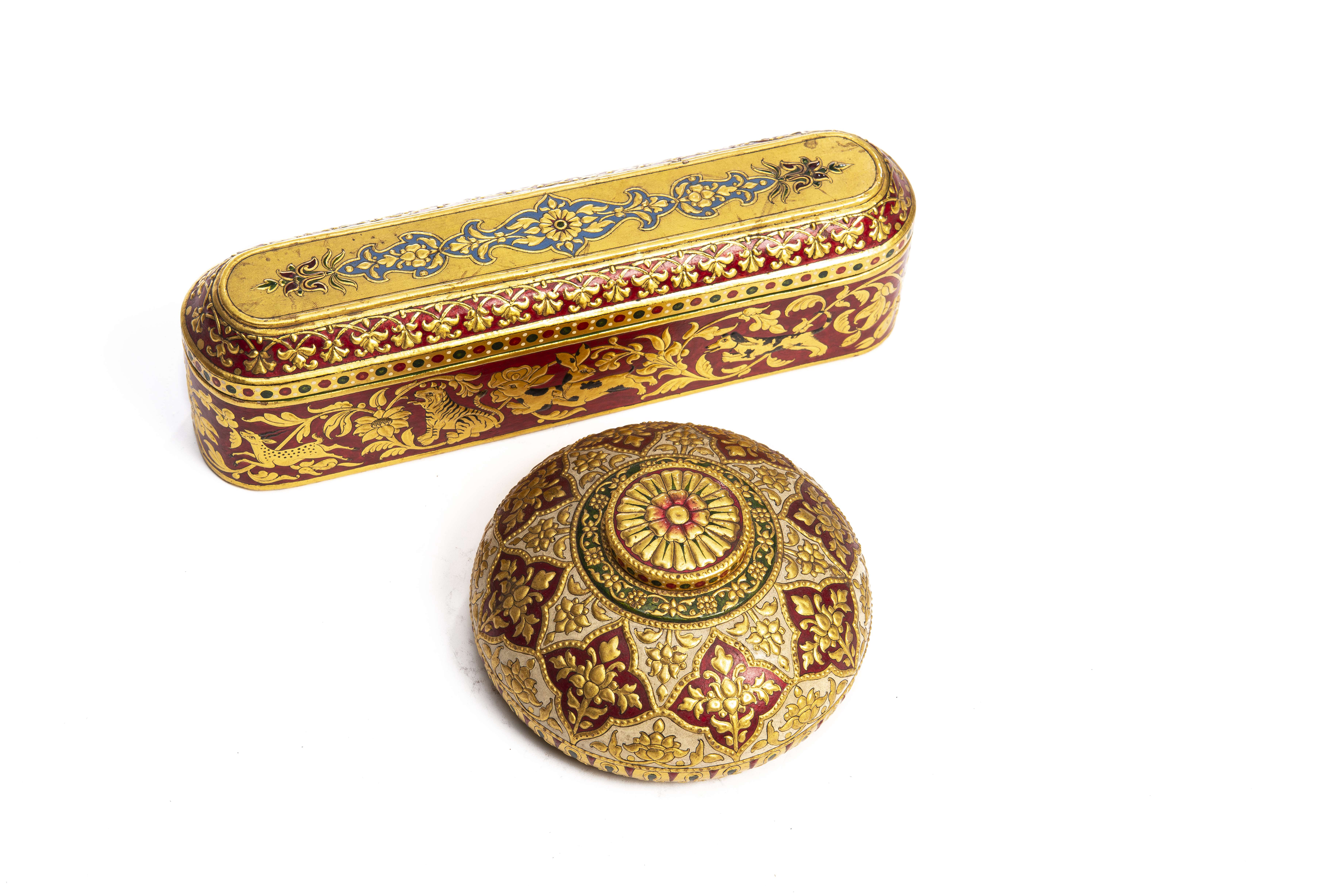 Boîte en laque du Rajasthan à décors dorés sur fond rouge de feuillages et d'animaux comprenant ; un chien, deux lièvres, un tigre et une gazelle. Couvercle décoré de motifs floraux dorés dans des médaillons bleus, sur fond or. Intérieur vert.