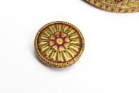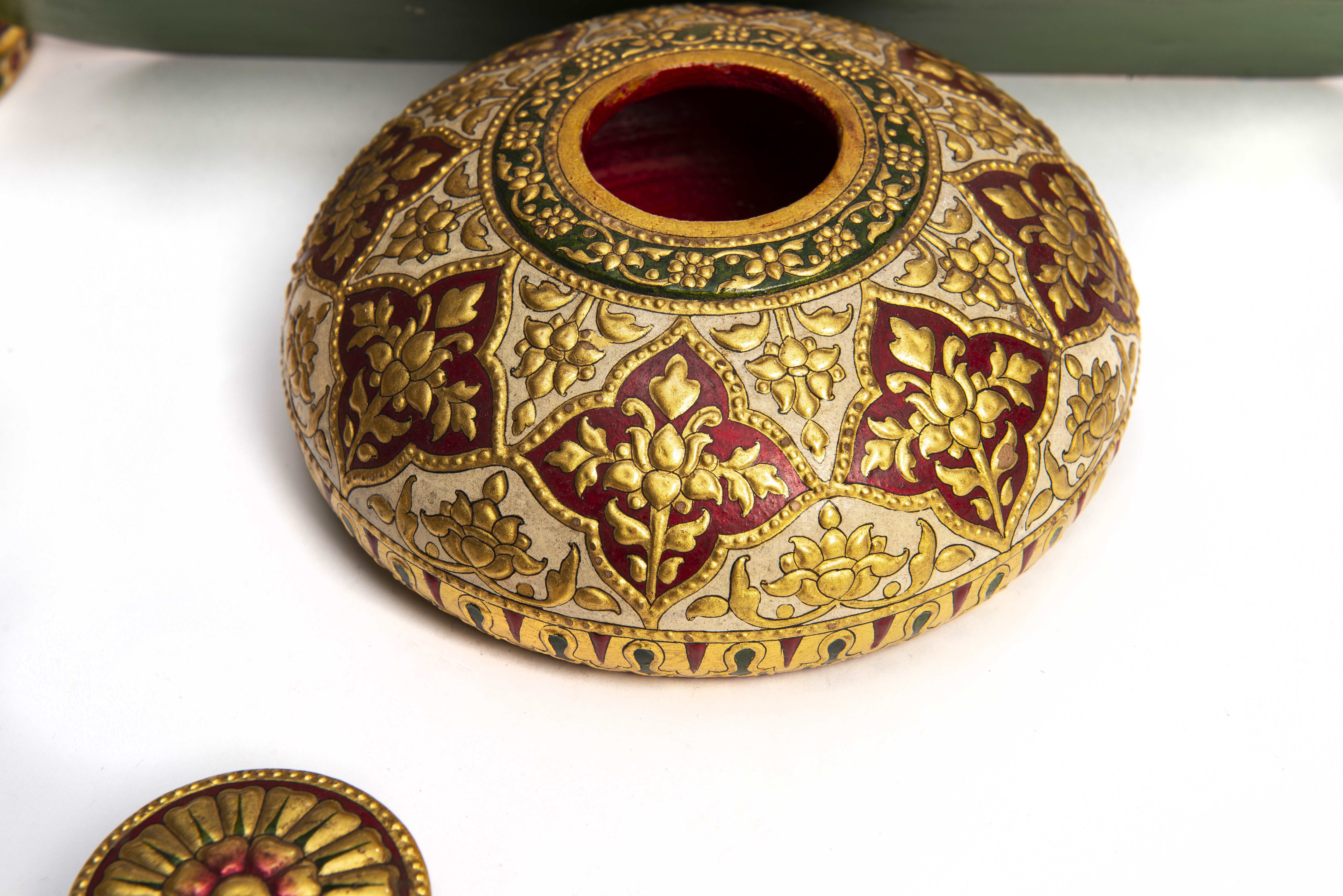 Boîte en laque du Rajasthan à décors de 8 médaillons rouges à quatre pétales contenant des lotus en or, sur fond gris. Avec petit couvercle rond orné d'une fleur à deux rangées de pétales.