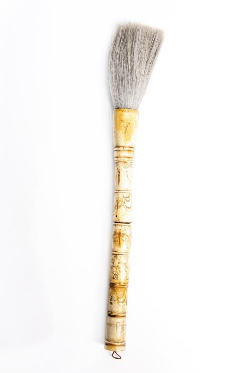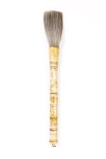Deux chasse-mouches en ivoire et crin à décor de carpe koï pour l'un et de scènes de vie pour l'autre.