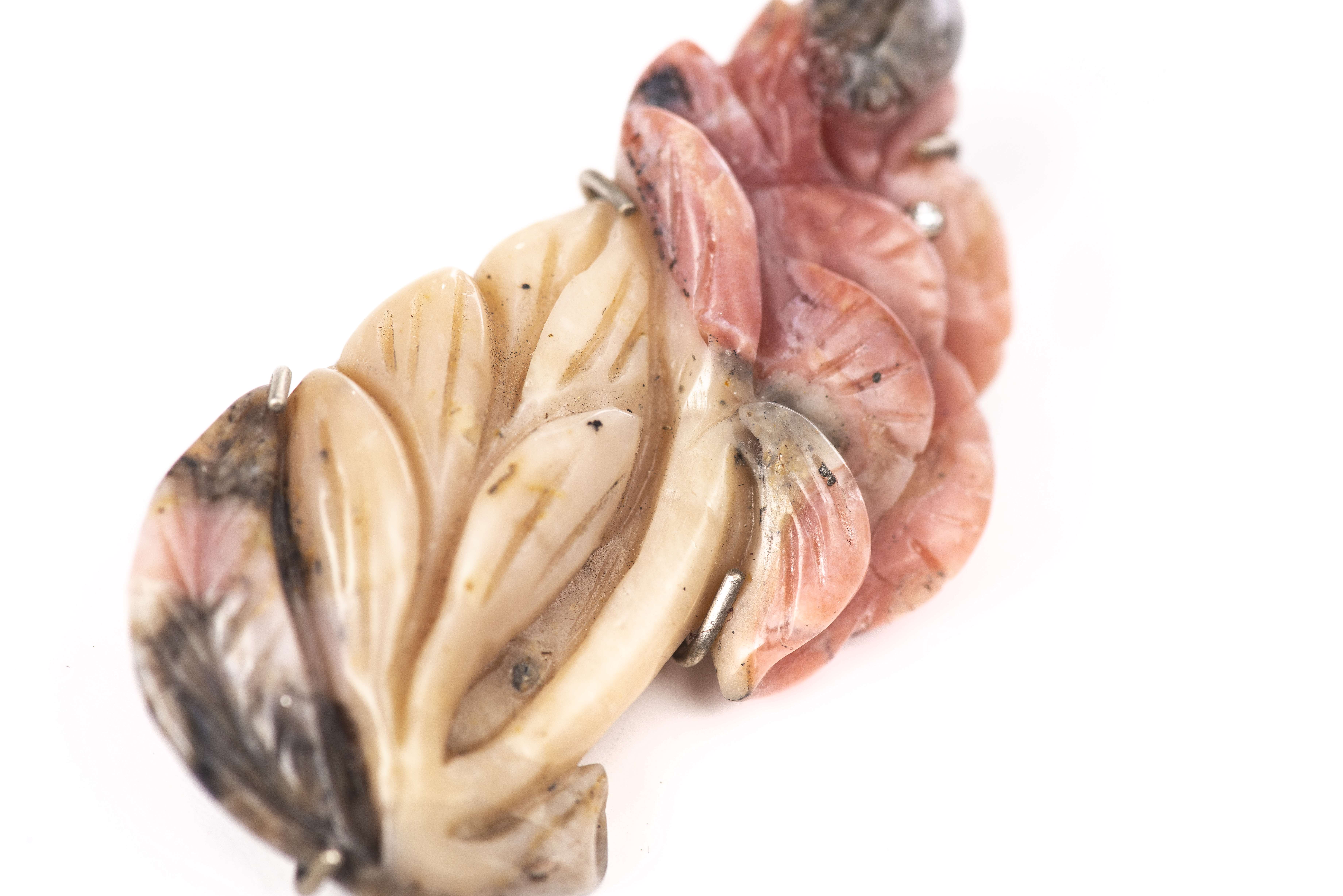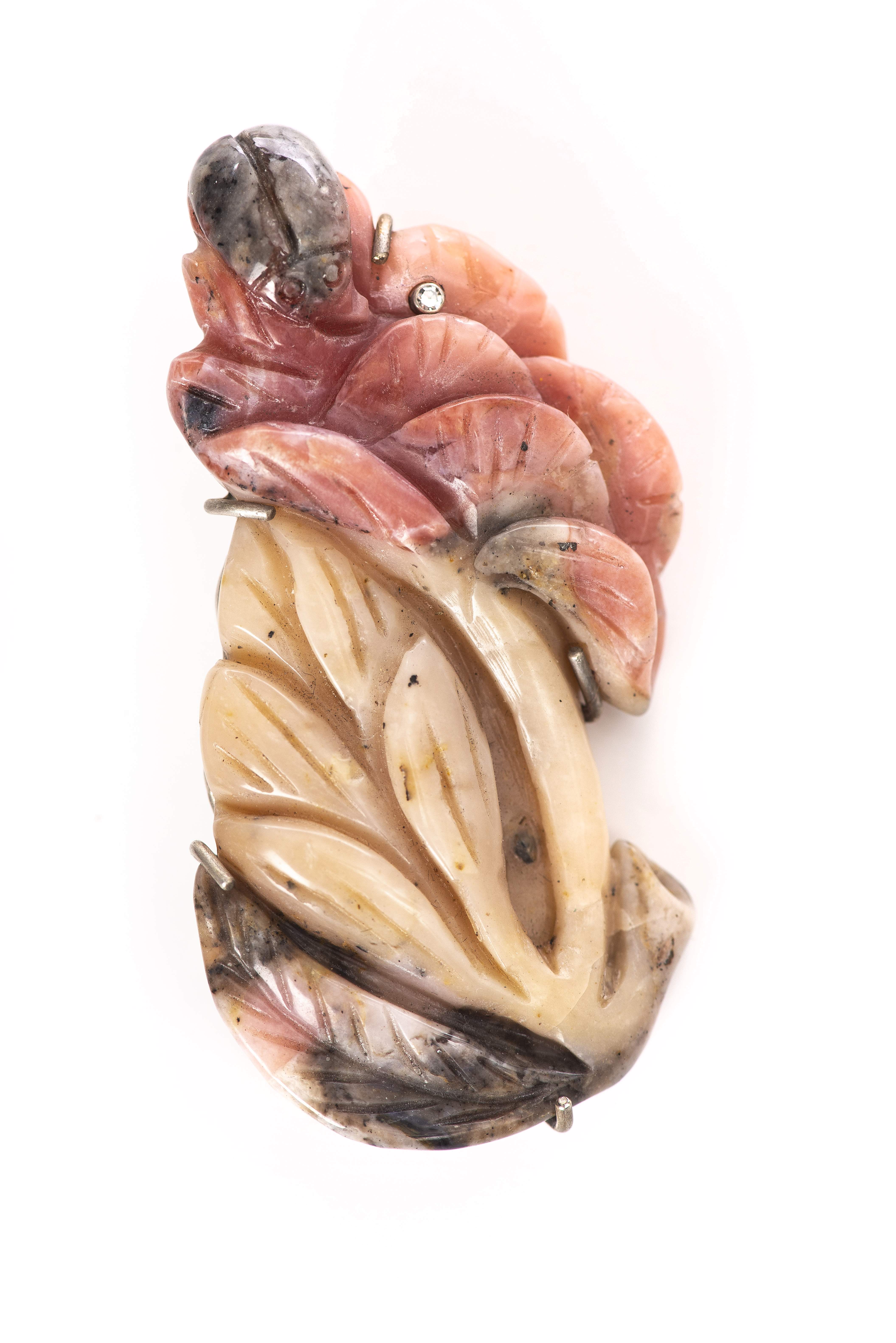 Broche en rhodonite sculptée représentant une branche fleurie et une coccinelle avec monture en argent .925, Chine.