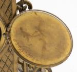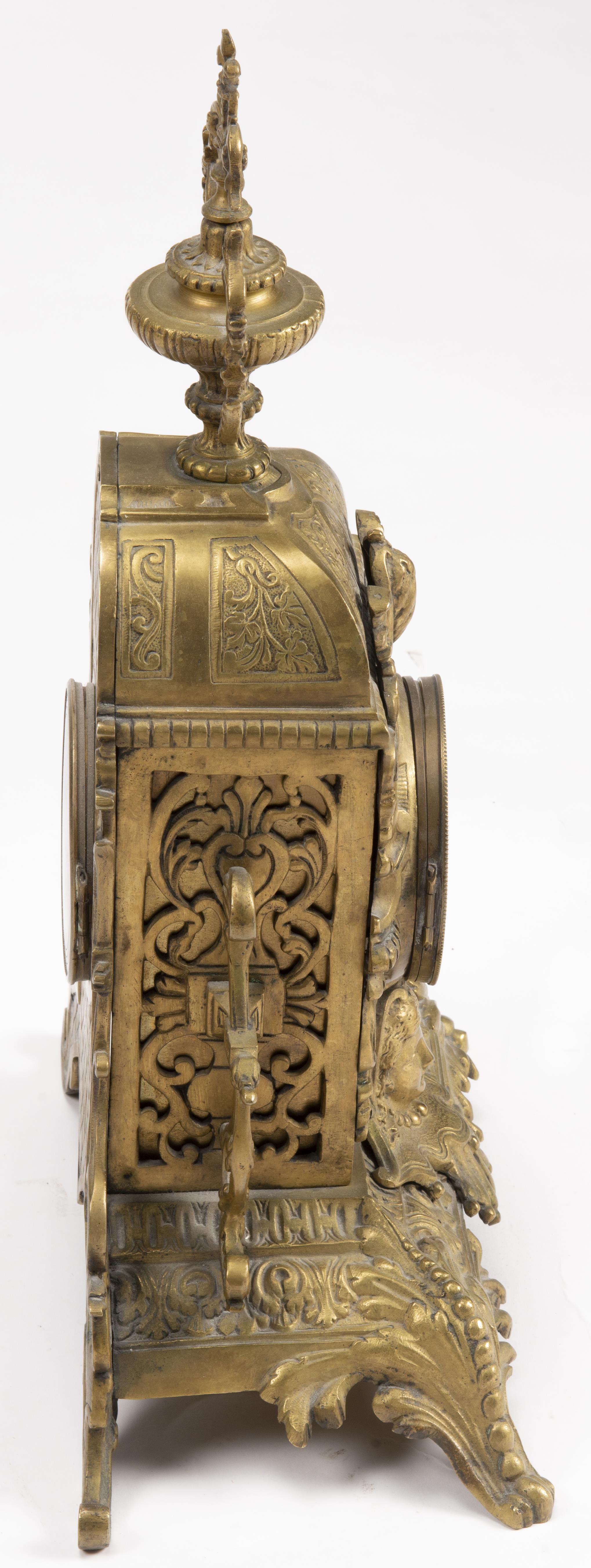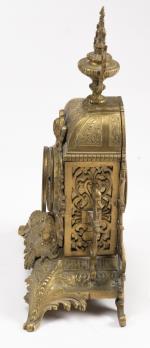 Pendule parisienne de style Napoléon III en bronze doré sur quatre pieds ornés de feuilles d'acanthe, surmonté d'un vase à deux anses présentant une fleur de lys, avec cadran en émail blanc et chiffres arabes.