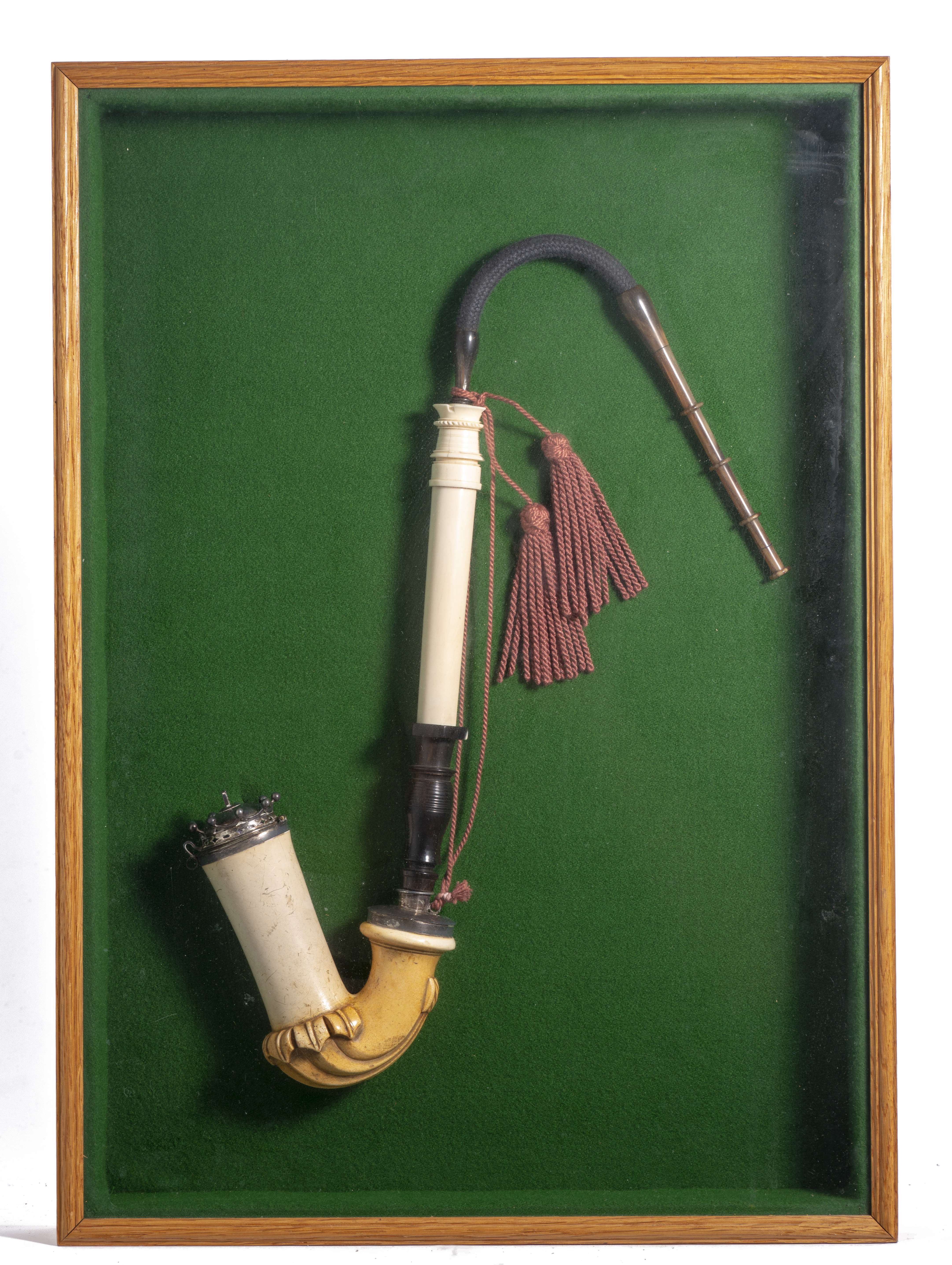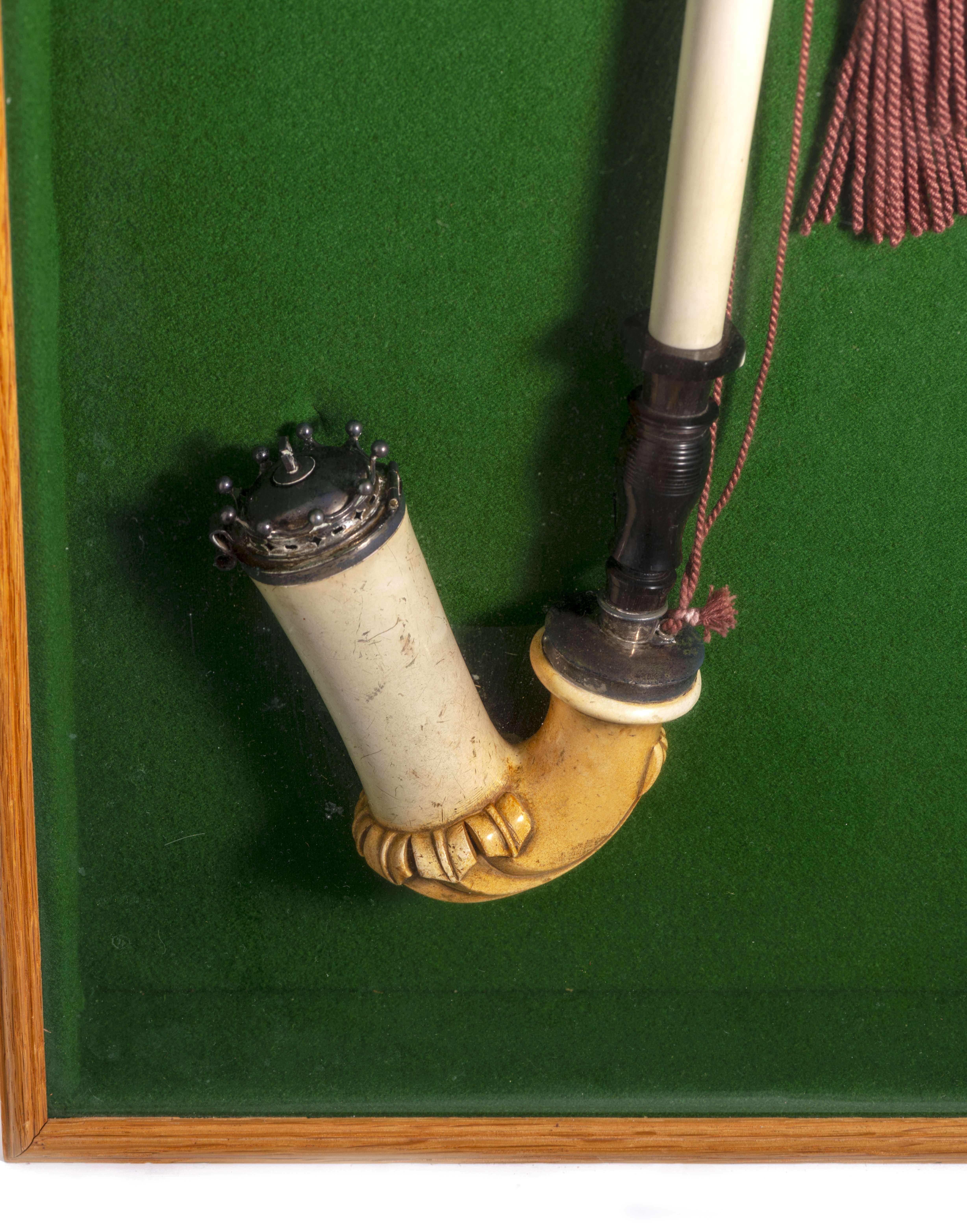 Grande pipe en écume de mer sculptée d'un motif feuillagé, couvercle surmonté d'une croix probablement en argent, fût en bois noirci et ivoire et embout en corne, tuyau en tissu.