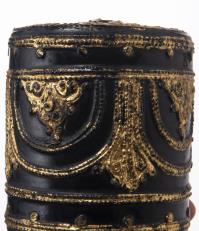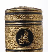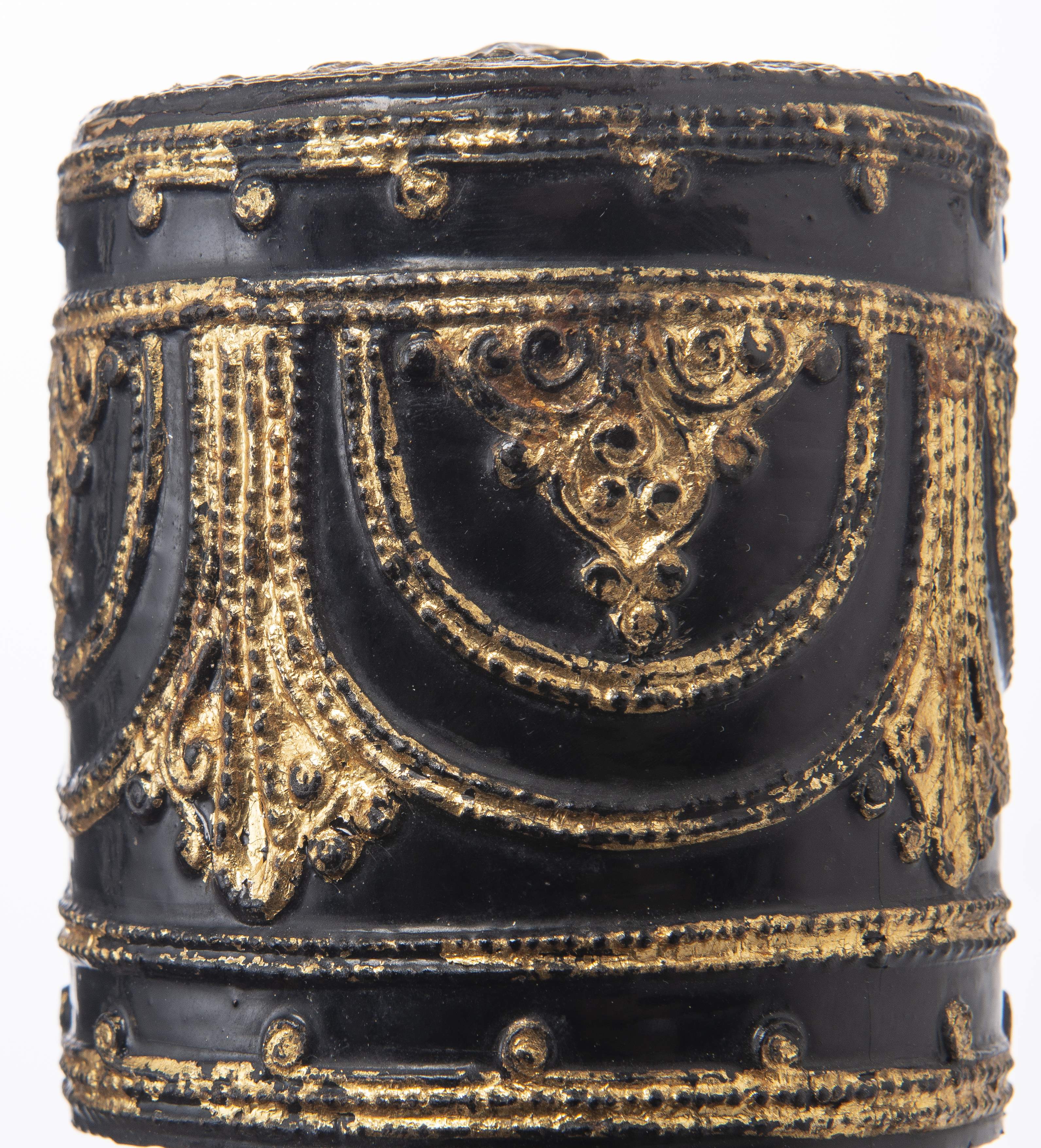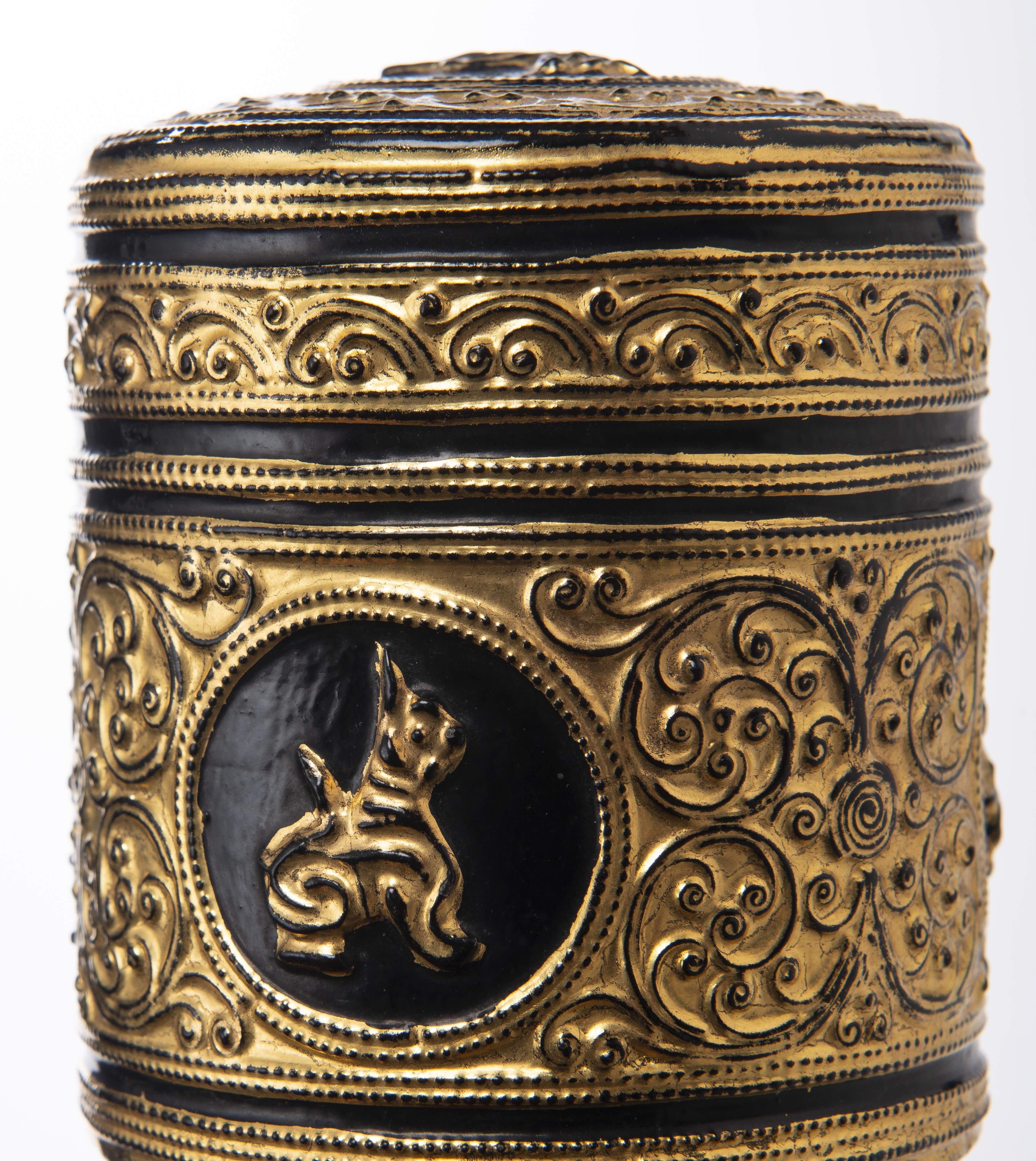 Boîte en laque noire de Thaïlande à décor doré de guirlandes et d'un chien sur le couvercle, de forme cylindrique et tripode.