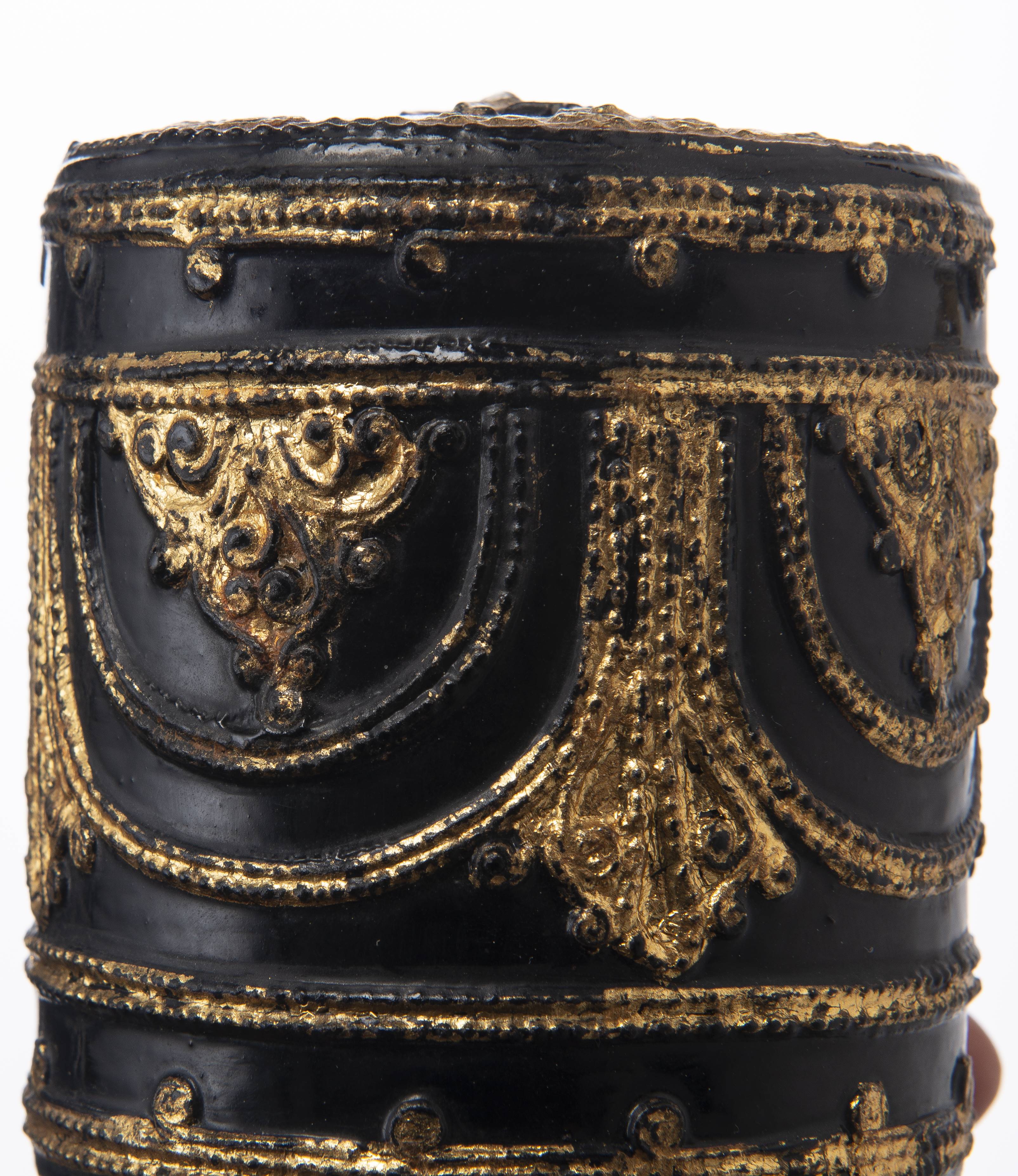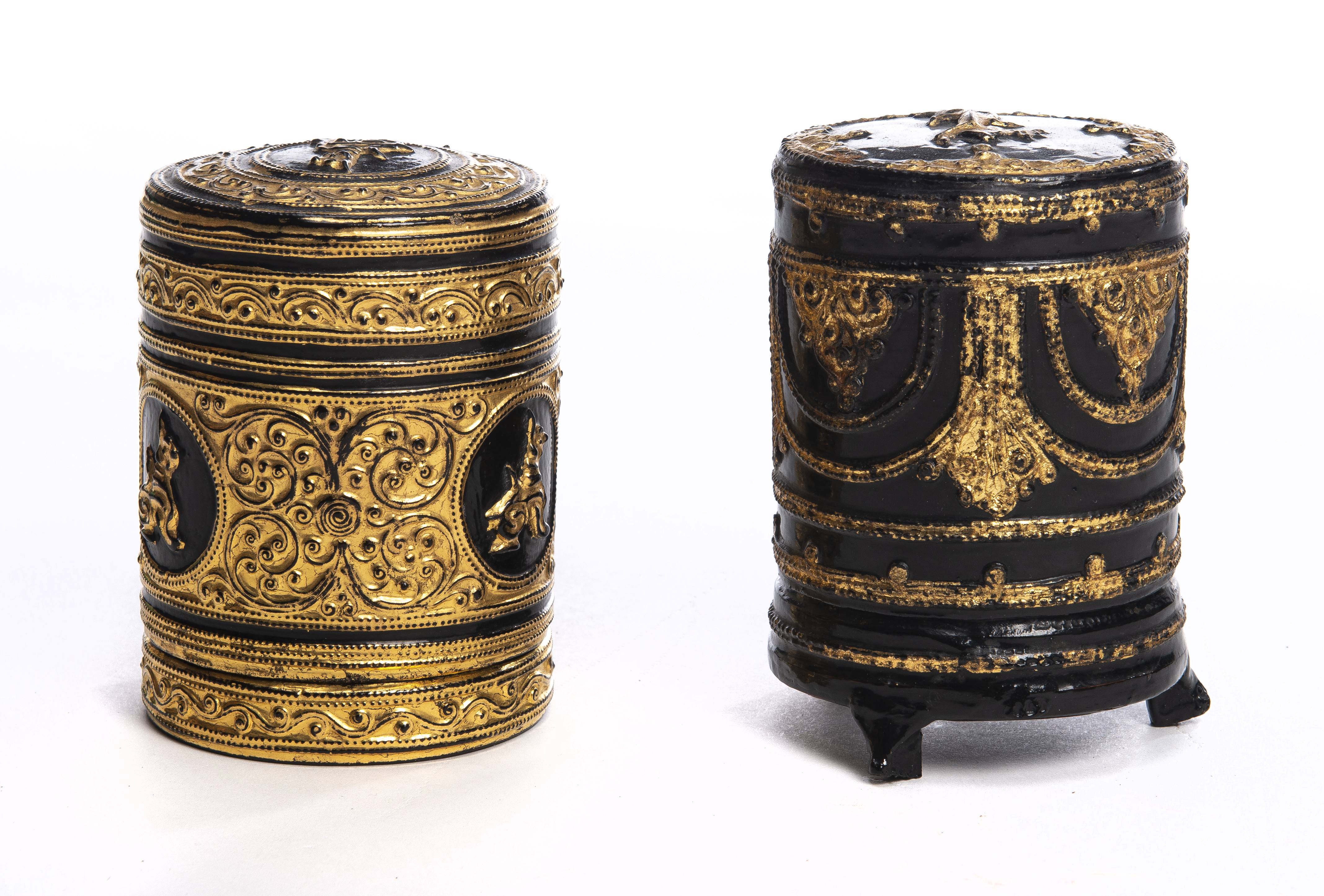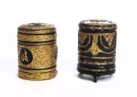 Boîtes en laque noire de Thaïlande à décor doré de petits chiens et d'arabesques, de forme cylindrique.