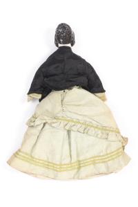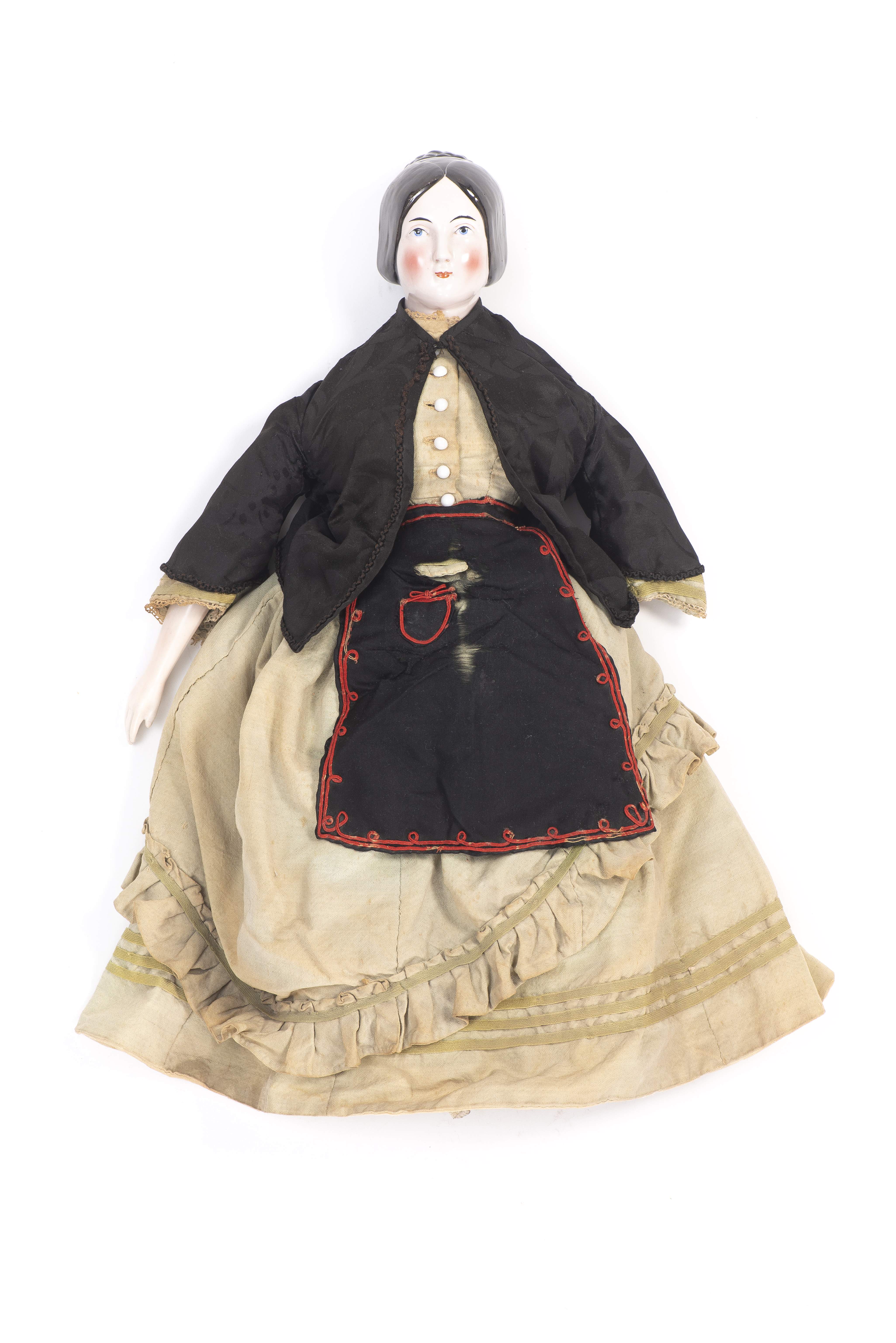 Poupée en céramique du XIXe habillée d'une robe verte et d'un tablier noir