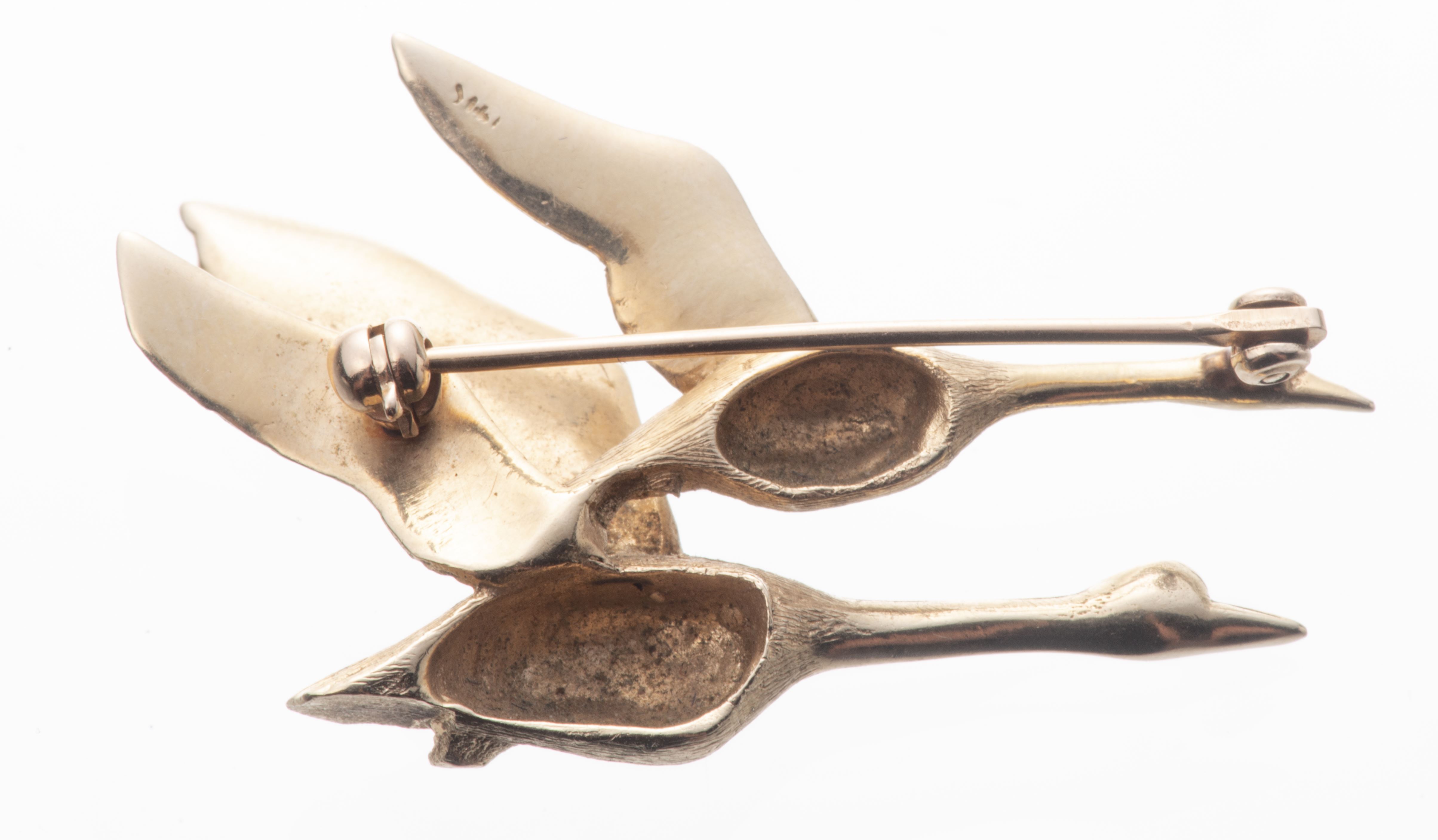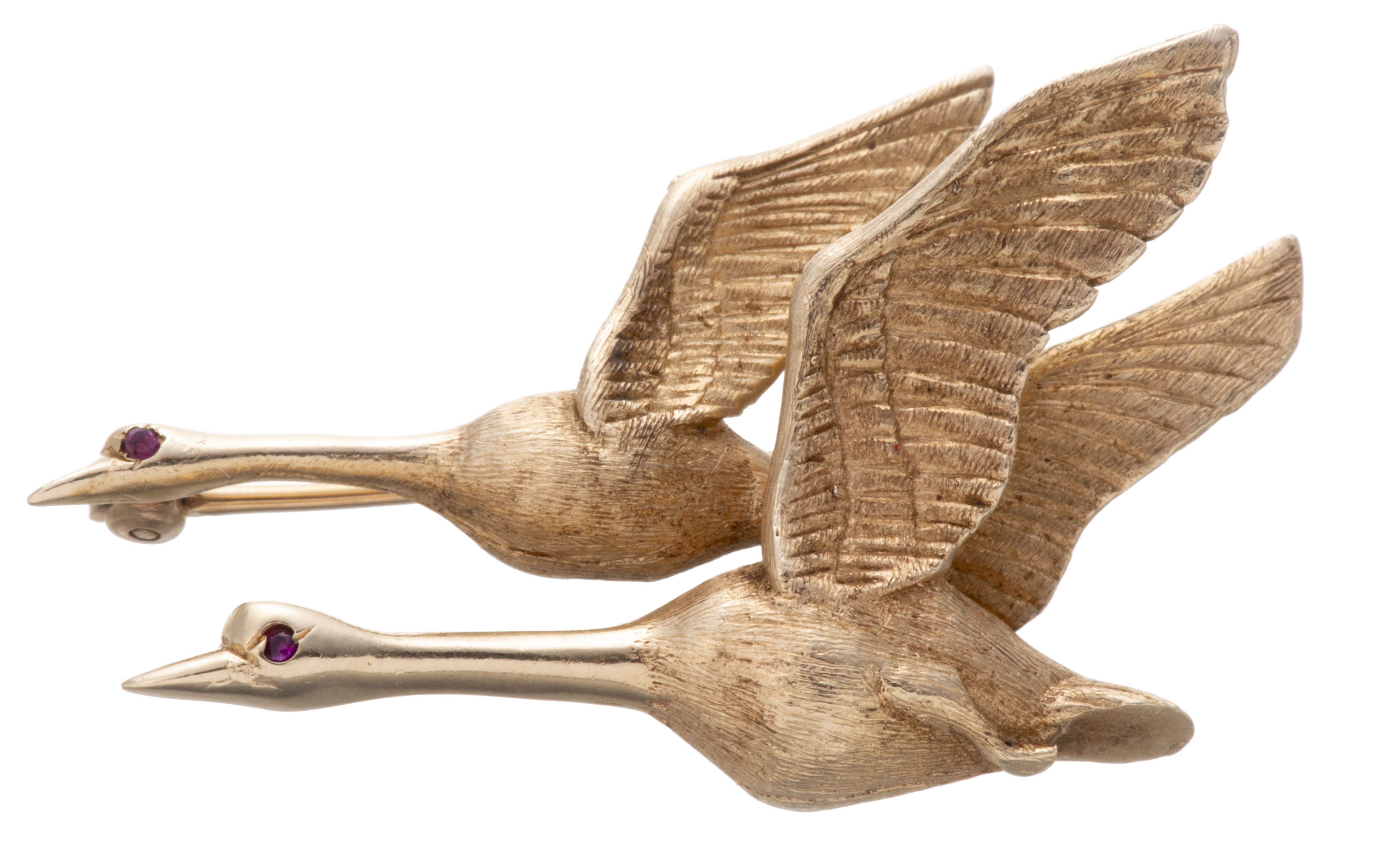 Broche représentant deux oies en vol en or jaune .585, yeux en rubis
