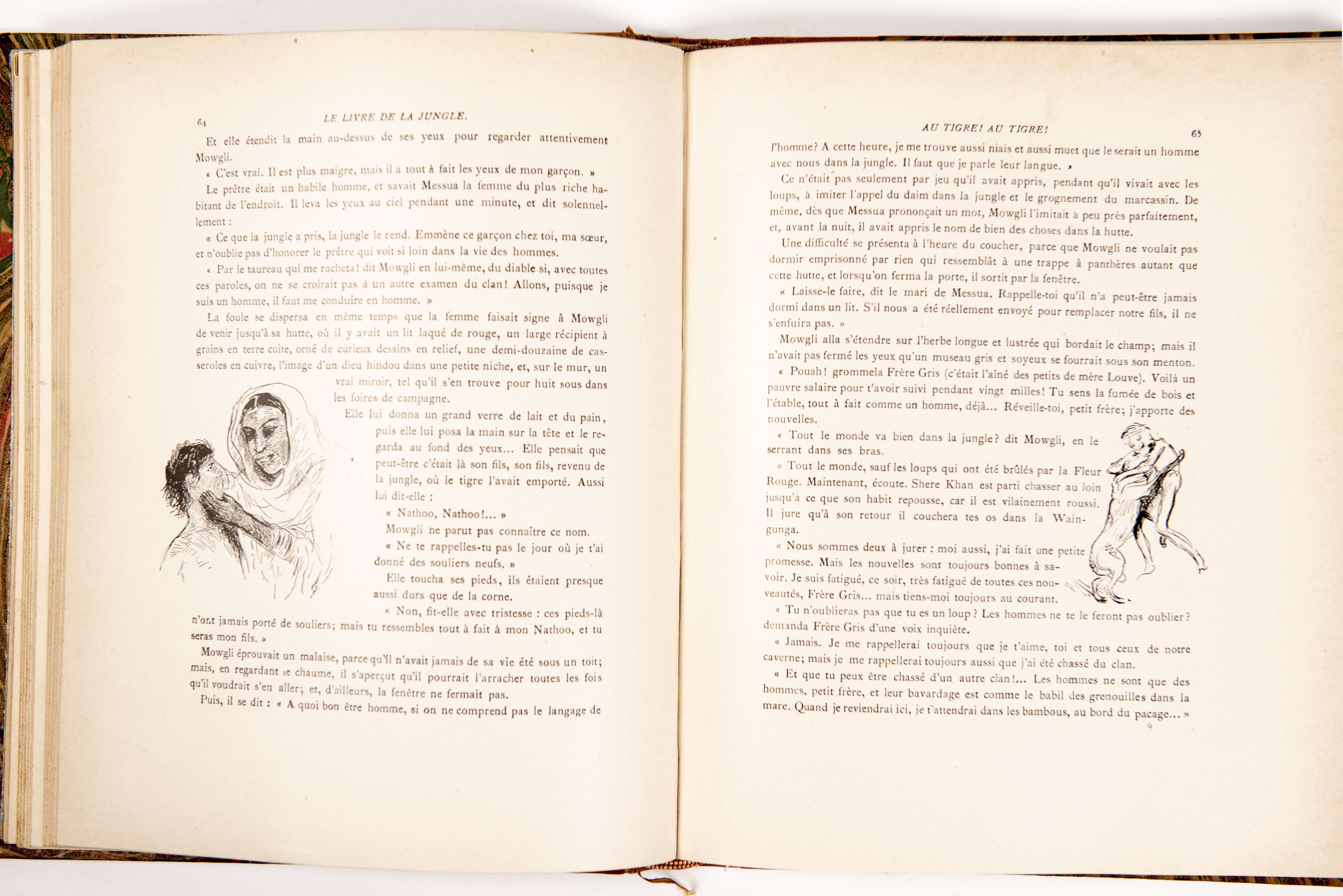 Rudyard Kipling, "Le second livre de la jungle", Illustrations de Roger Reboussin, quatrième édition. Librairie Delagrave, 15 rue Soufflot, Paris, 1925. In-4 demi-veau, papier marbré.