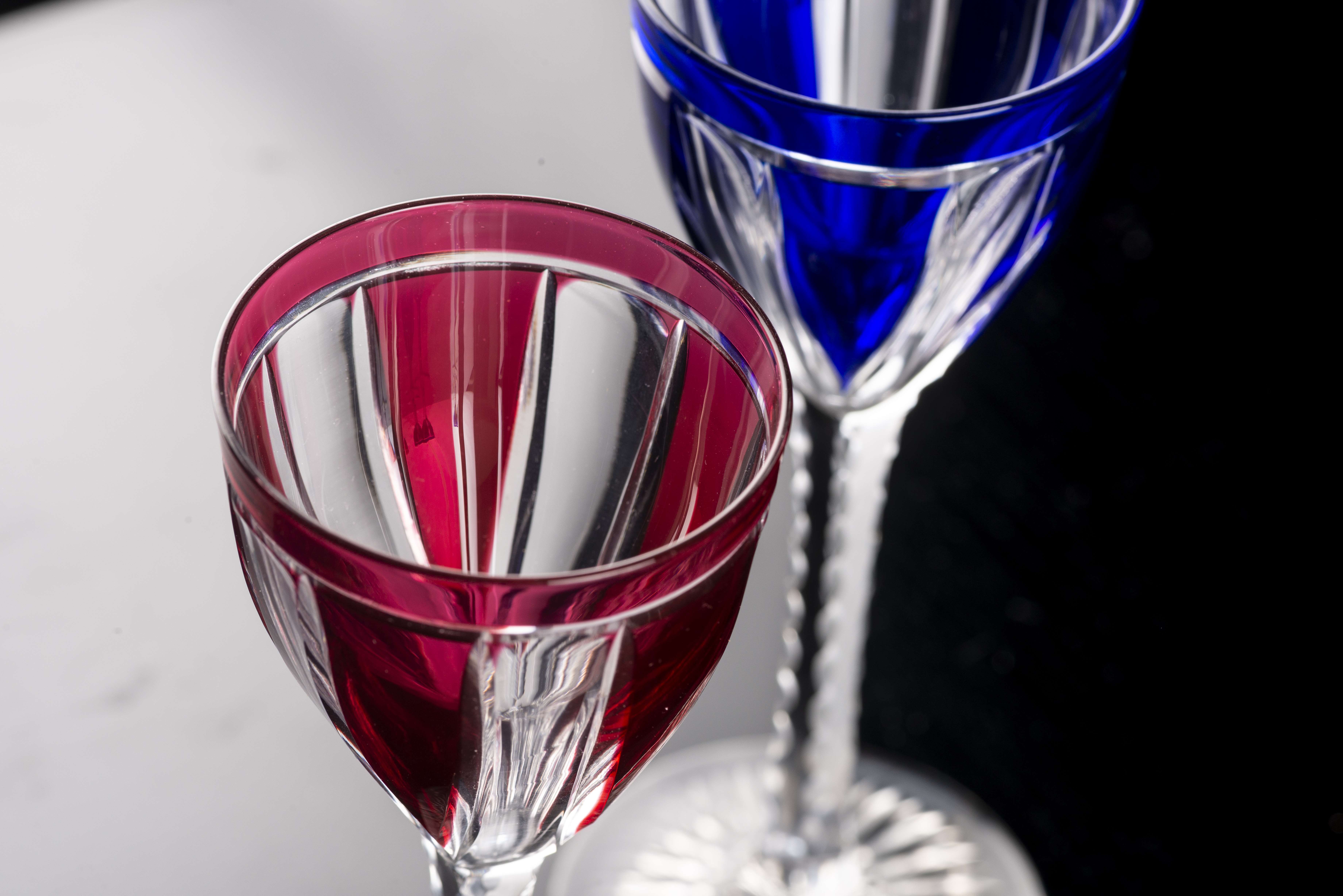 - 4 verres à pieds torsadés et calice teint en rouge, H. 16.5 cm & Diam. 6 cm