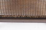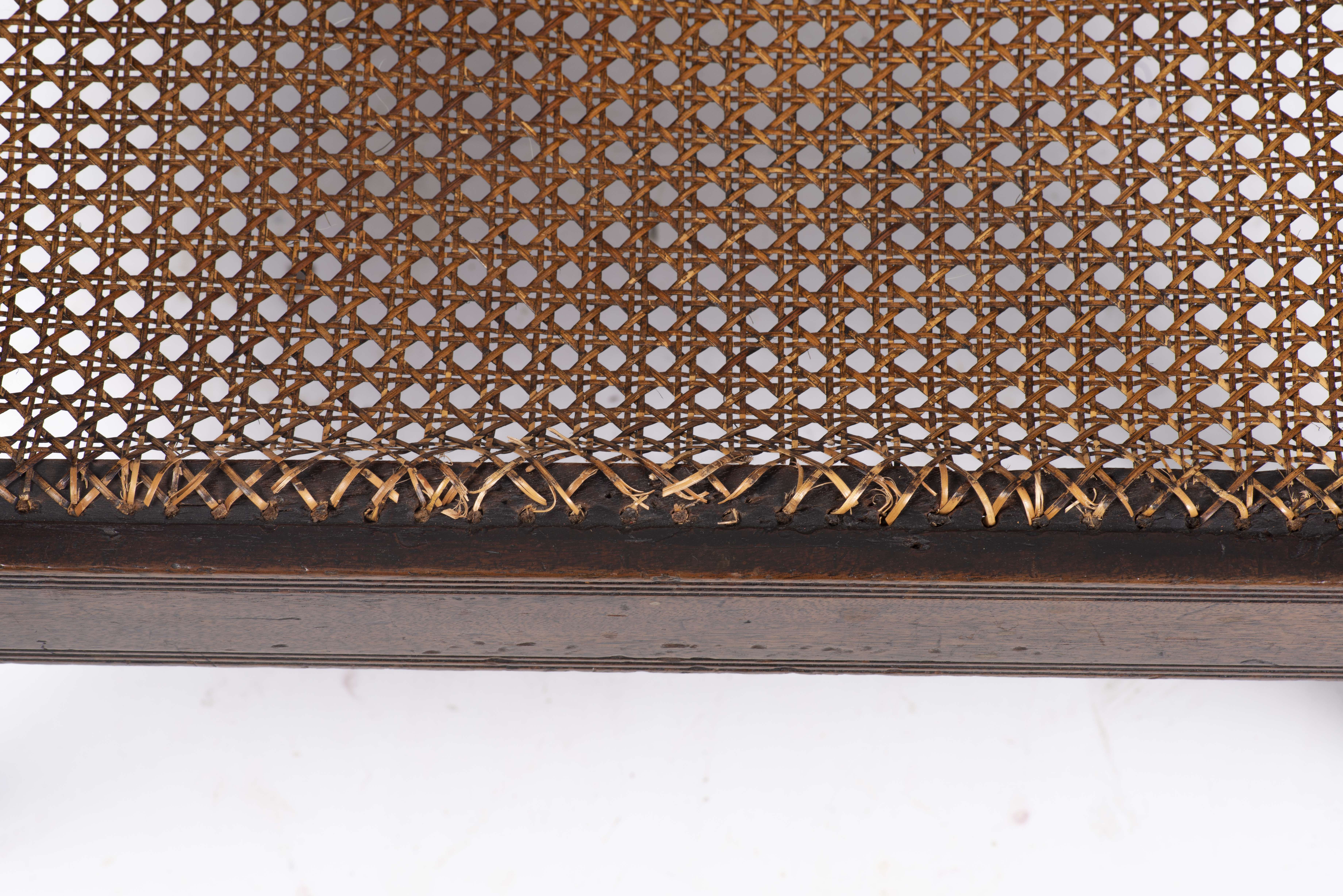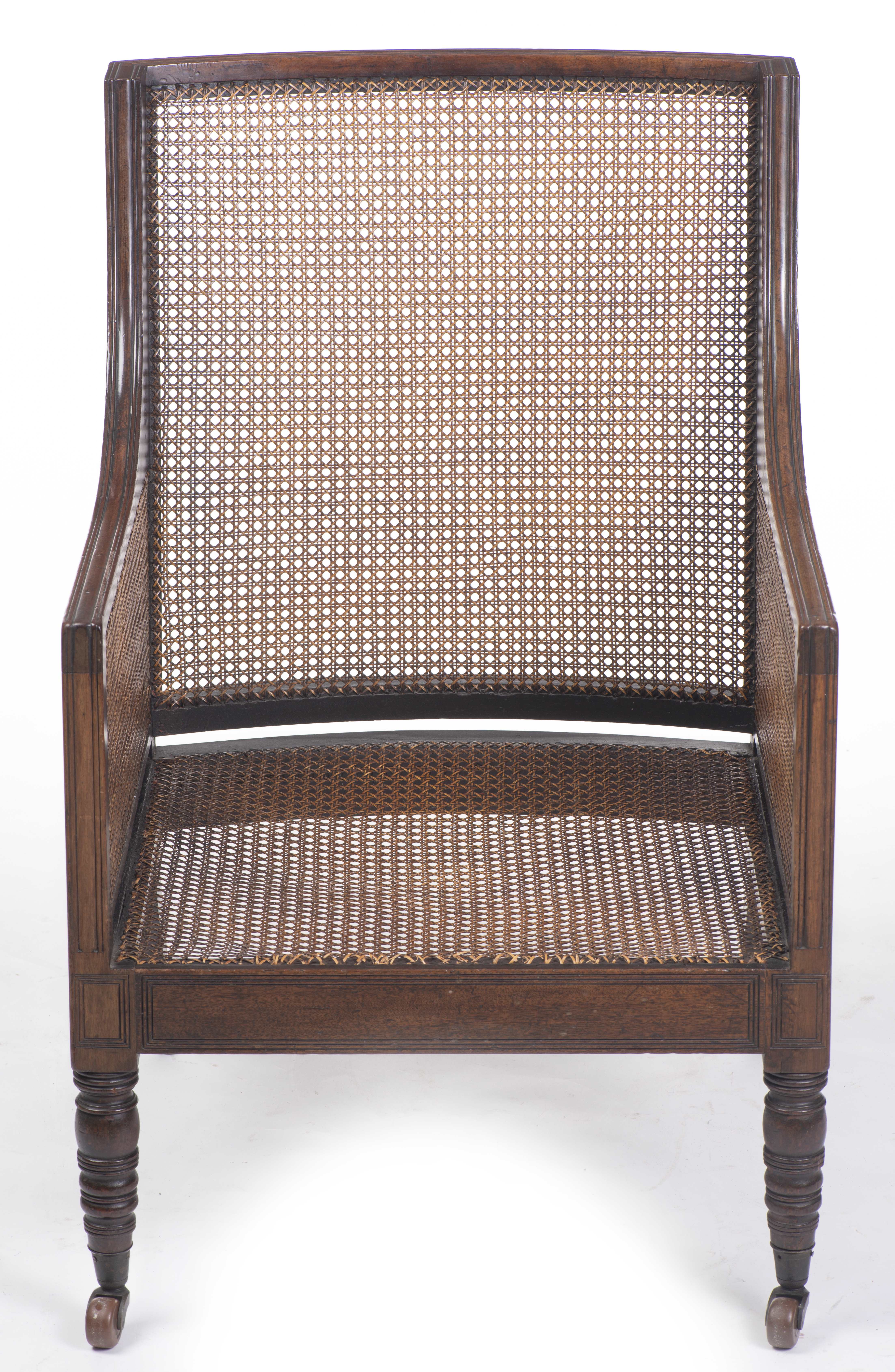 Bergère en acajou anglais ou américain d'époque Georges III à accotoirs à tablettes, assise et dossier cannés recouverts de coussins de cuir naturel.