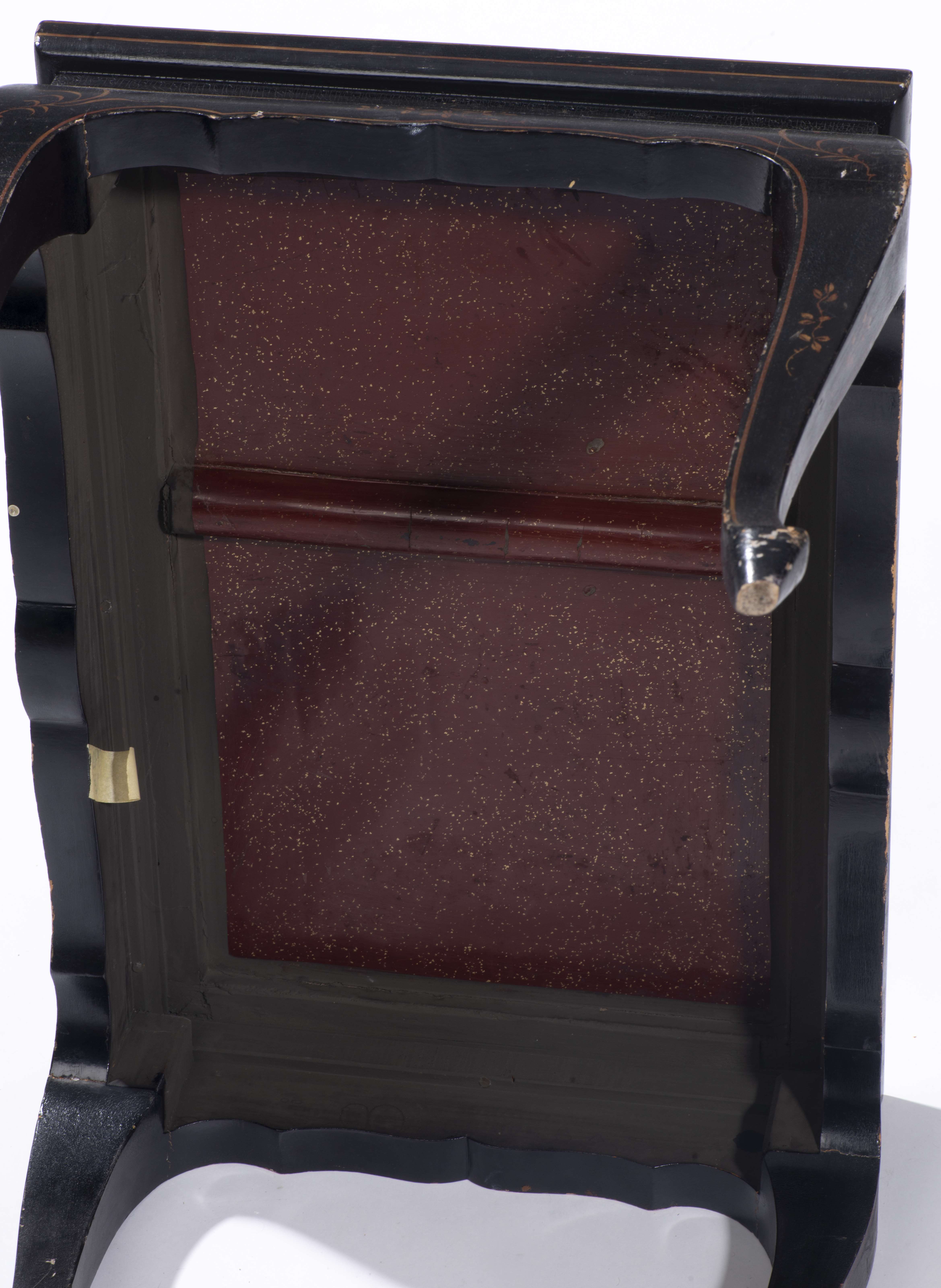 laque très abîmée, manques et éclats, plateau en verre sur le dessus