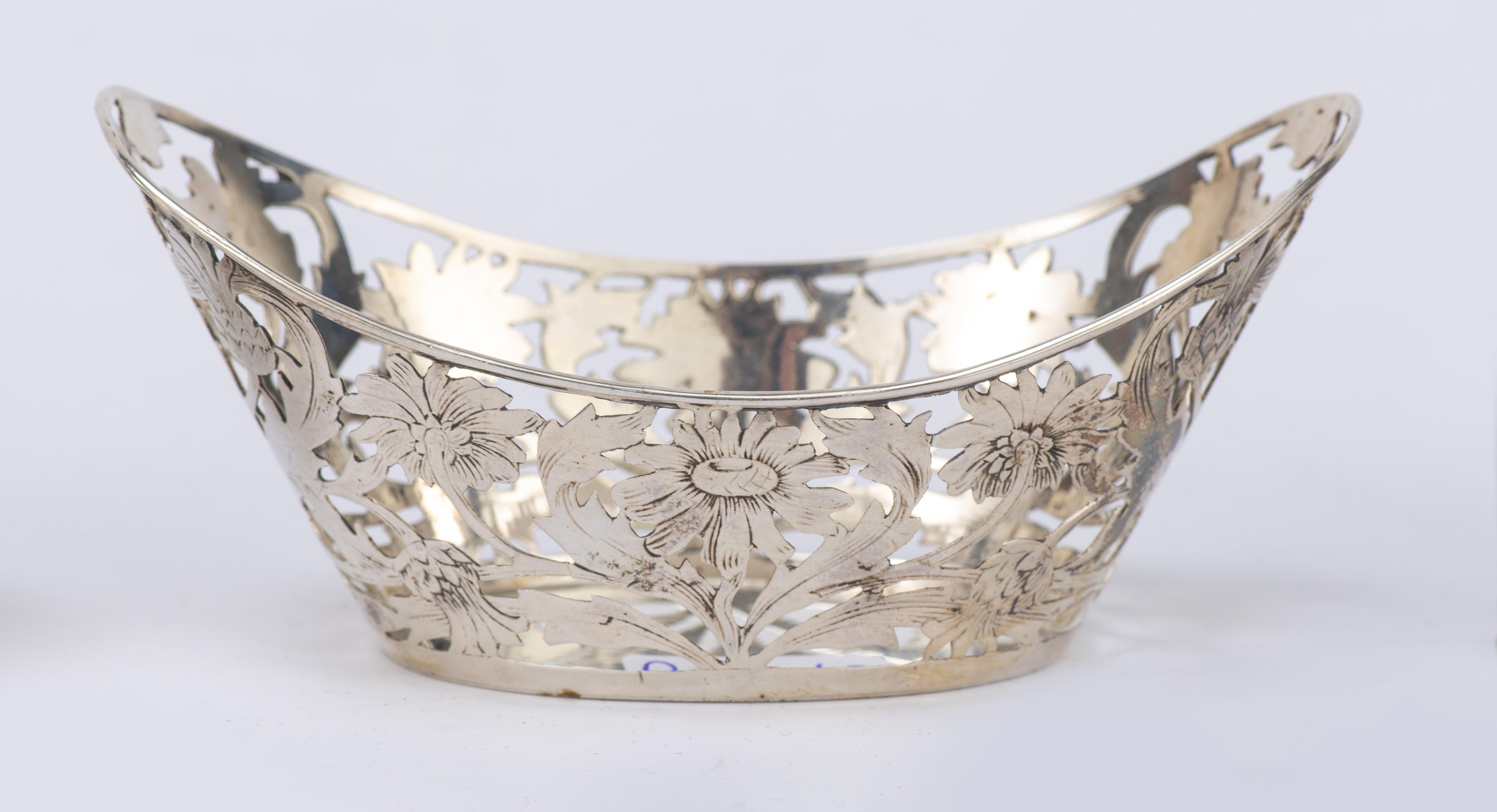 - 1 vide-poche de forme sabot en argent .830 allemand à marli ajouré à décor de fleurs. H. 6.3x12x6.2 cm