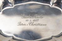 - 1 plateau ovale en argent allemand .830 à bordure mouvementée inscrit Gisela + Carlo du 10.2.1957 Peter + Christiane. H. 2.5x22.5x14.5 cm