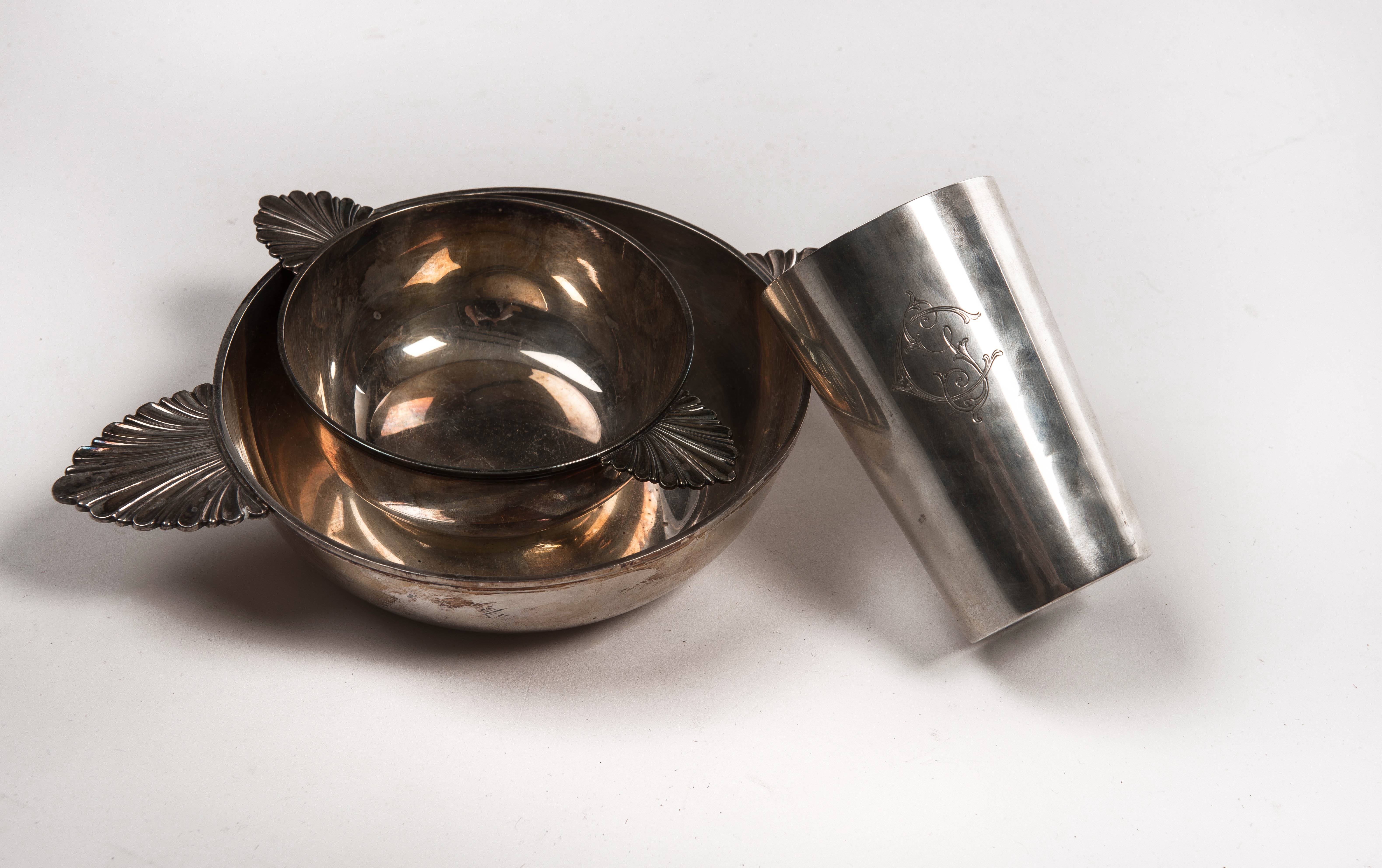 Deux écuelles et une timbale monogrammée C en argent .800 Jezler