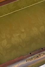 Petite table à ouvrage à pieds violonés, chutes de bronze doré, à décor sur le bandeau et les côtés d'un paysage lacustre en vernis martin, plateau ouvrant à bordure mouvementée à décor de deux personnages en vernis martin.