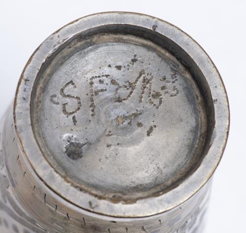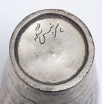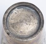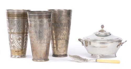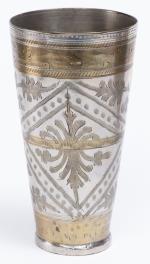 -trois grandes timbales en métal de Perse, dont deux à décor de losanges H. 17.5 & Diam. 9.2 cm et une à décor de feuillages et lignes dorées H. 17.8 & Diam. 9.5 cm. Poids : 1320 g