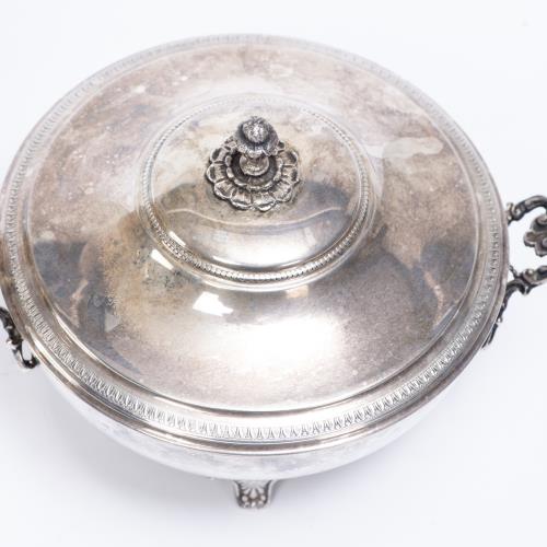 -une bonbonnière couverte en argent .800 anses rocailles et prise à décor floral. H. 12.5 & Diam. 15 cm Poids : 285 g.