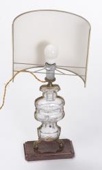 Lampe de table à pied en cristal et laiton sur un socle en porphyre avec demi- abat-jour.