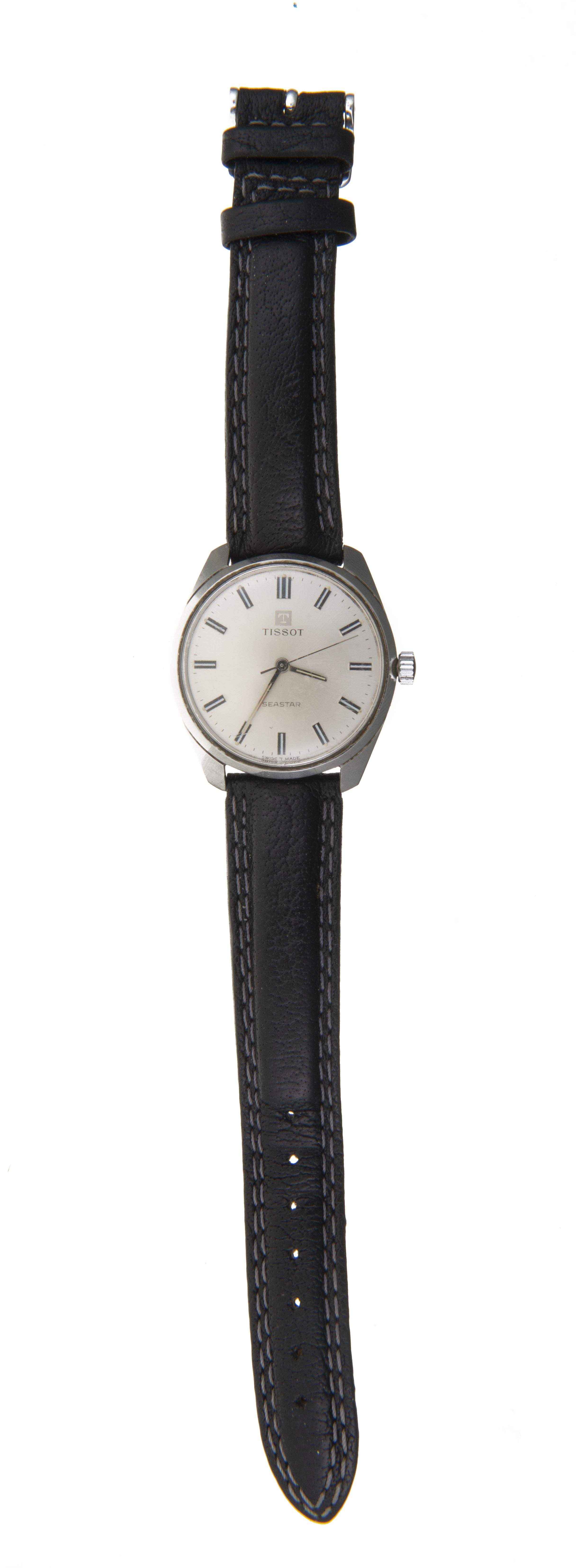 Montre-bracelet Tissot mécanique Seastar en acier chromé, cadran acier, index et aiguilles bâton fluorescents, aiguille des secondes centrale. Verre acrylique. Circa 1968.