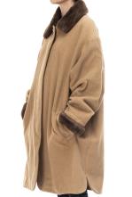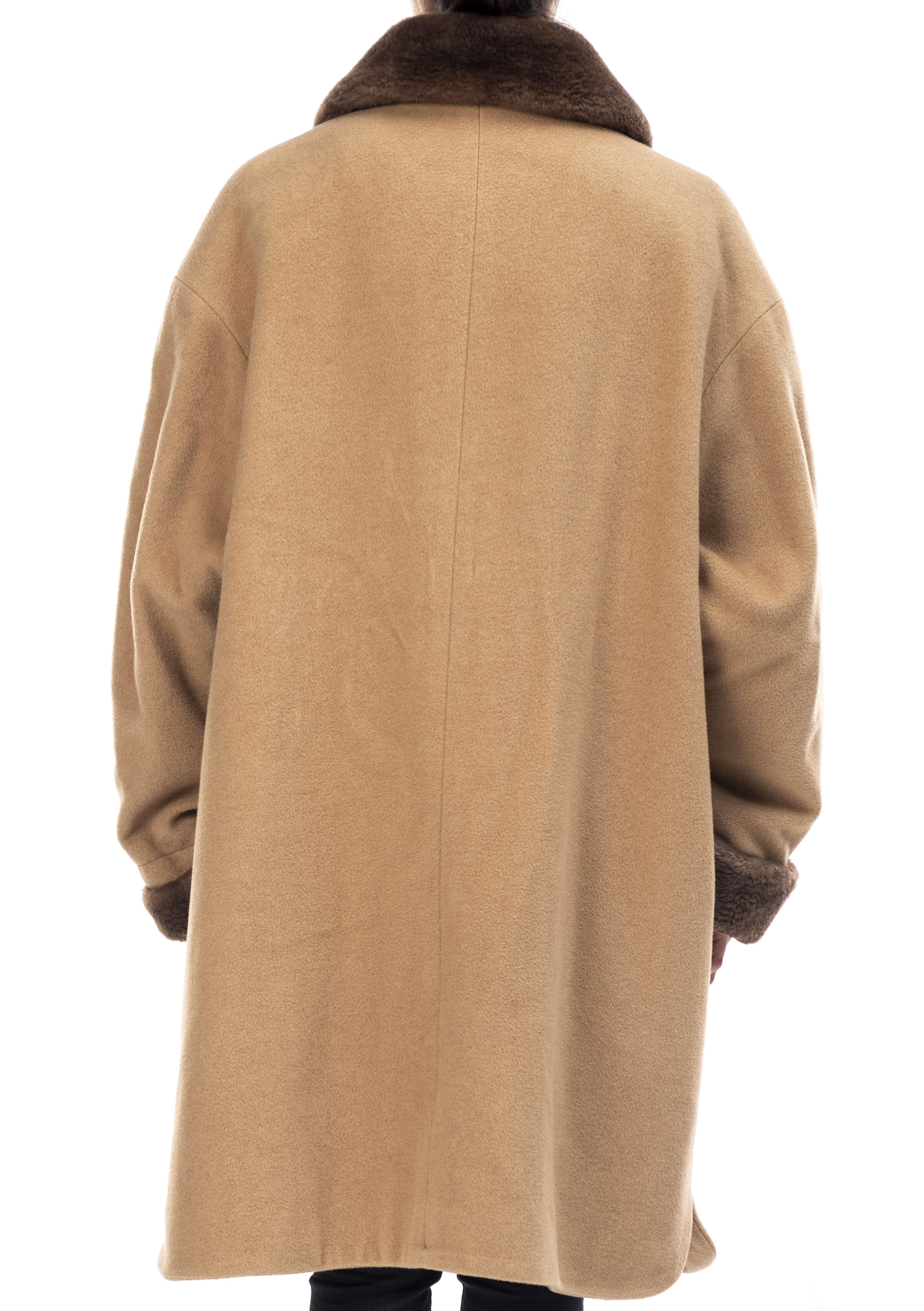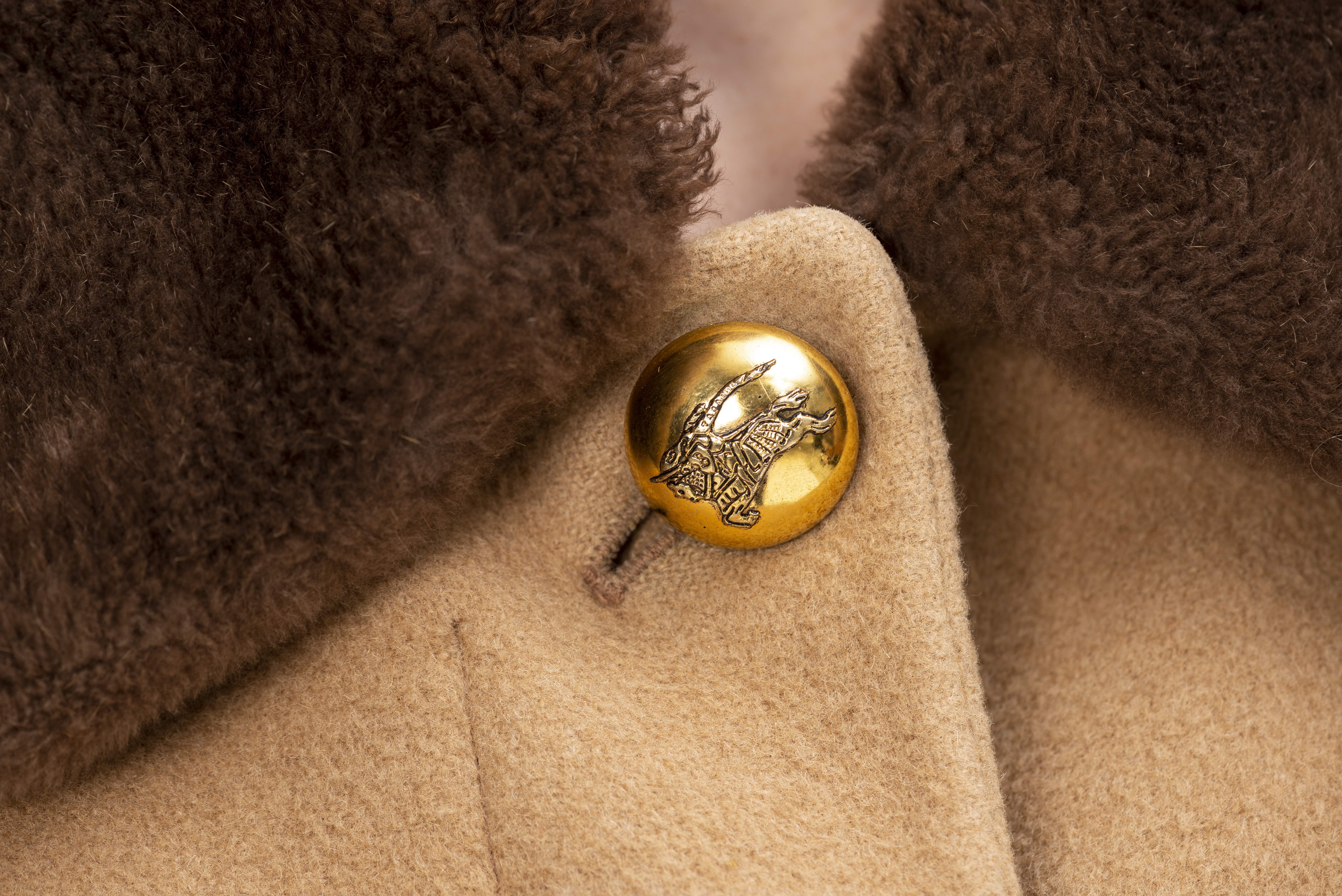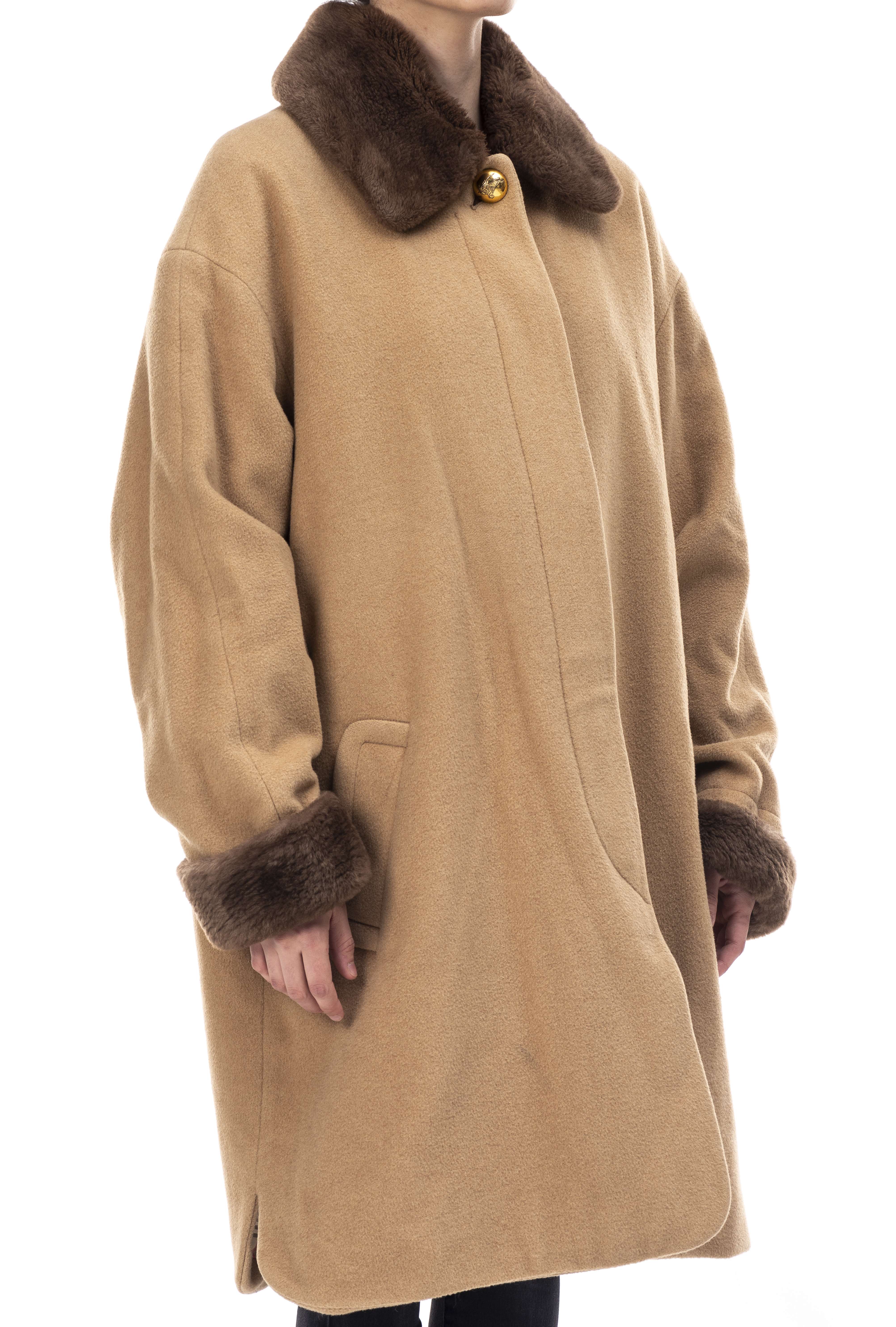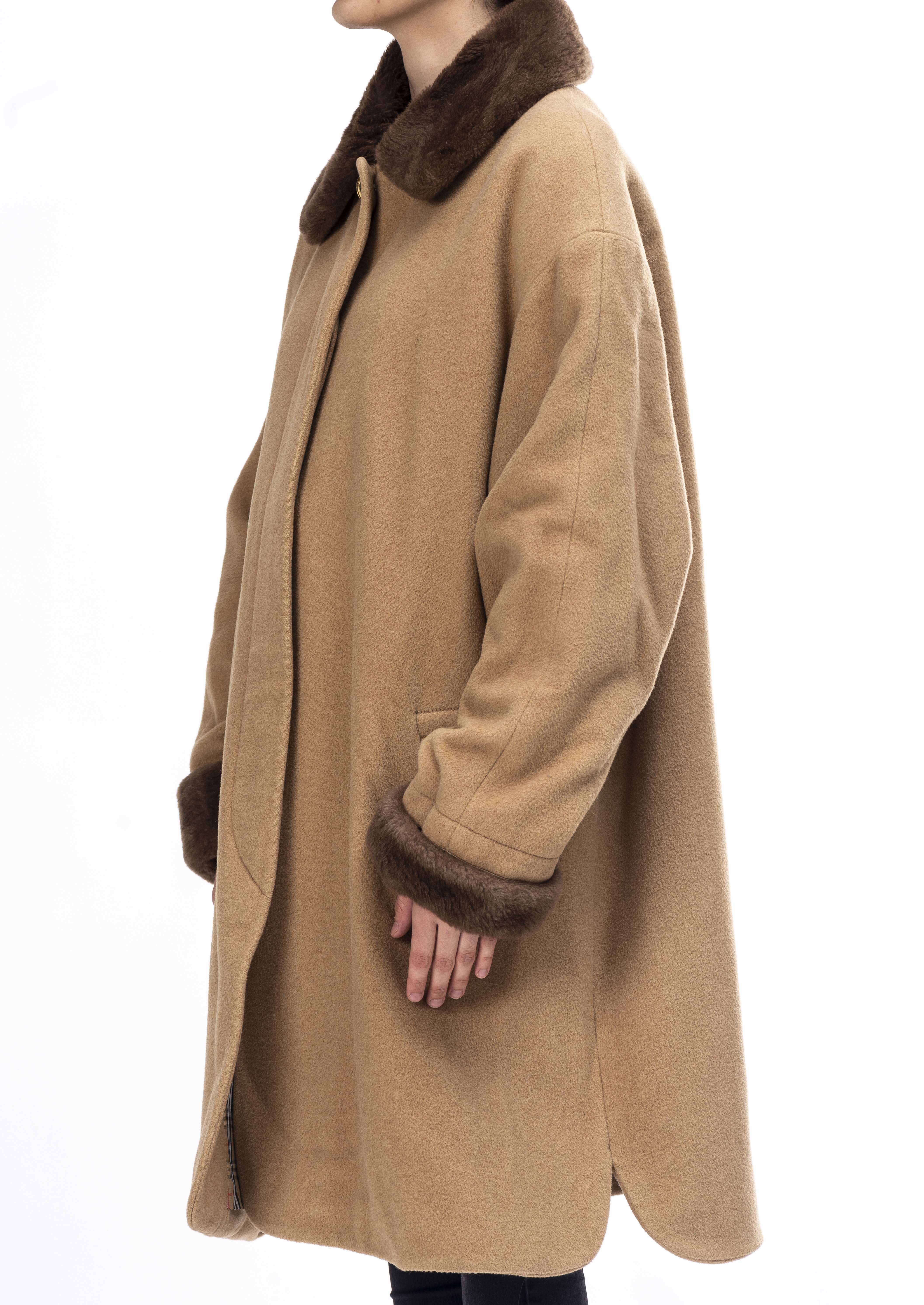 Burberrys, monteau long en chameau beige, col et bordures de manche en fourrure marron et intérieur tartan beige.