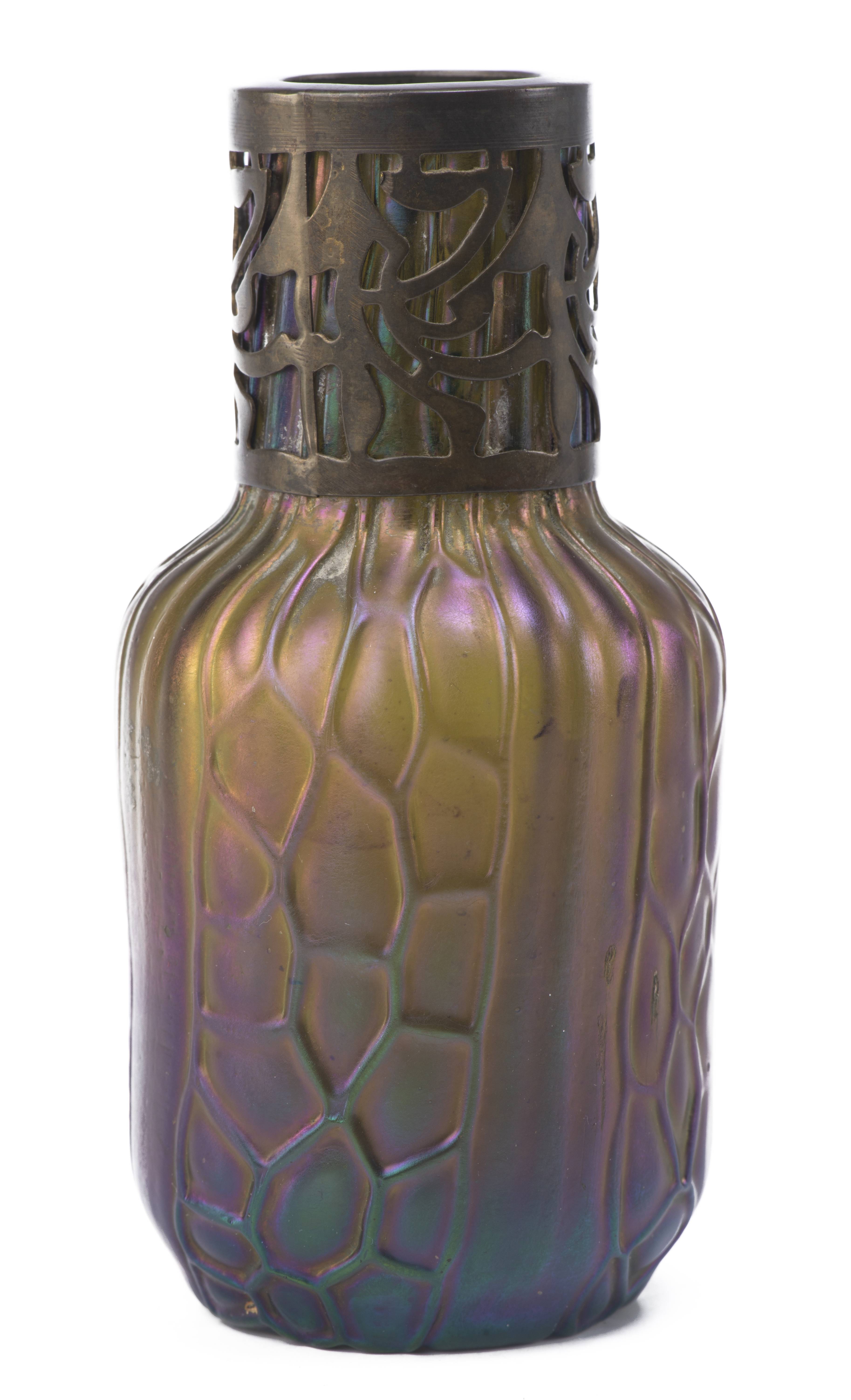 - vase cylindrique en verre irisé et nervuré à col étroit, H. 11.5 cm & Diam. 5 cm