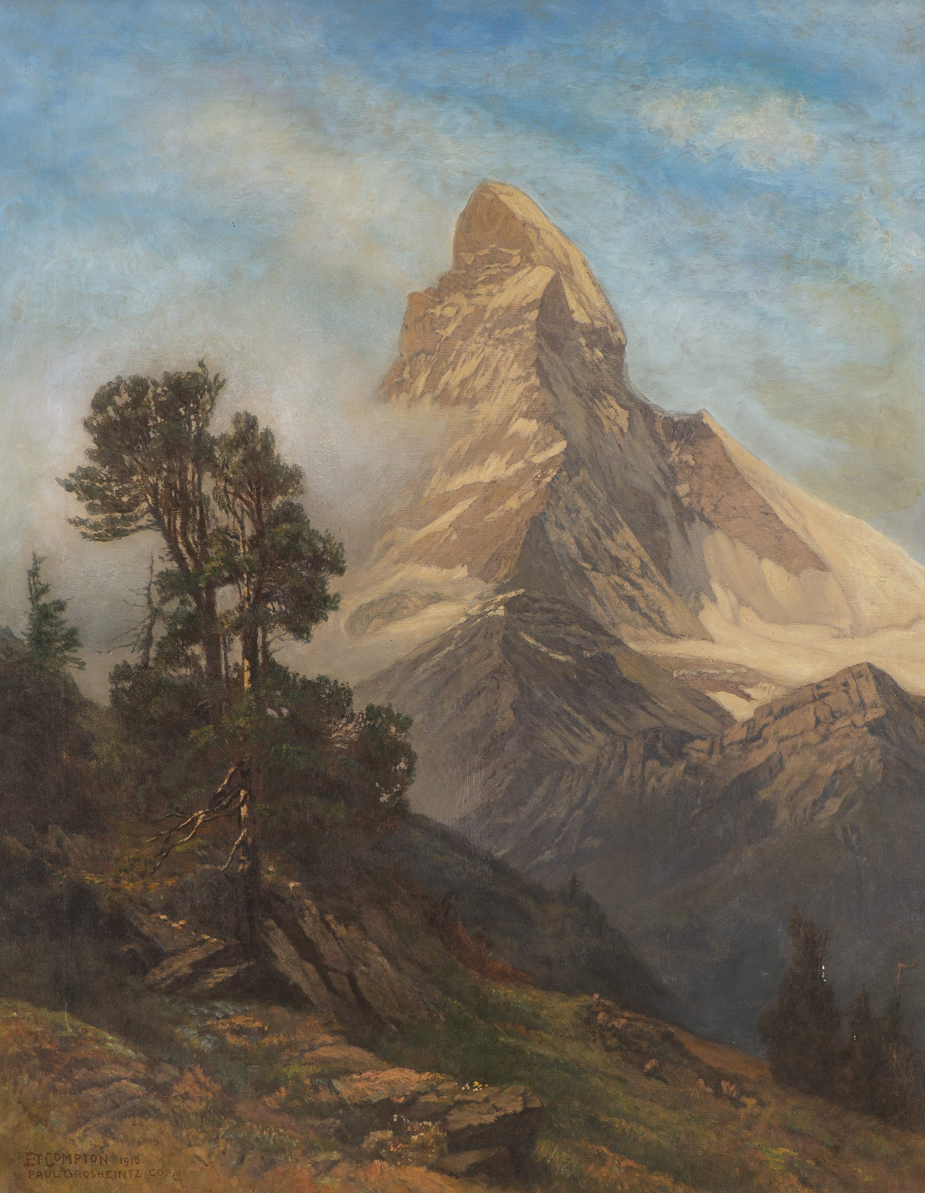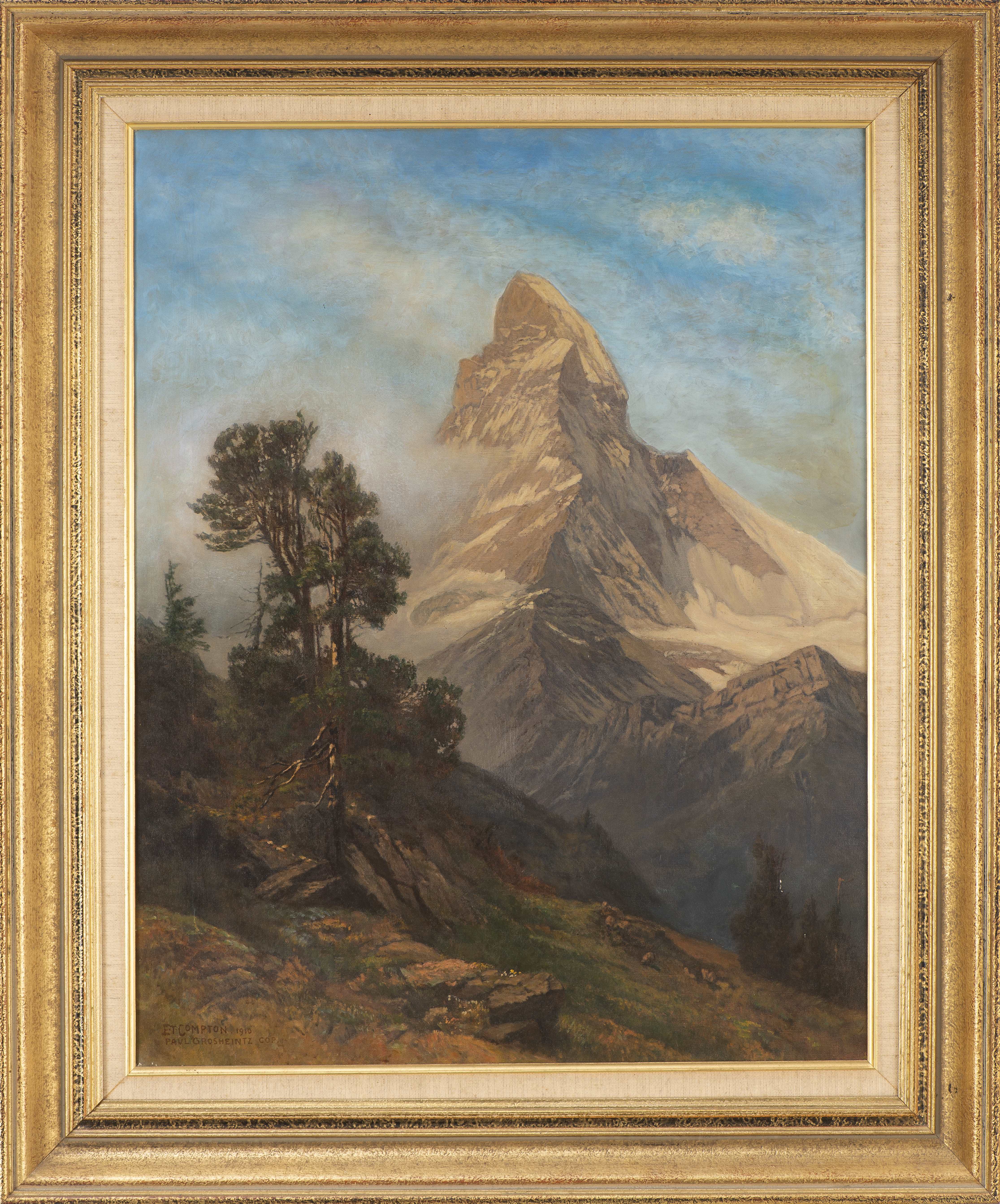 Paul Grosheintz (XXe), "Matterhorn". Huile sur toile, sbg du copiste, tirée d'une composition de Edouard Théophile Compton, historique familial de l'œuvre au dos.