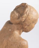 Sculpture en plâtre peint en imitation terre cuite représentant une femme nue assise, s'appuyant sur ses bras, les jambes croisées et les cheveux tressés. Sur socle en bois.