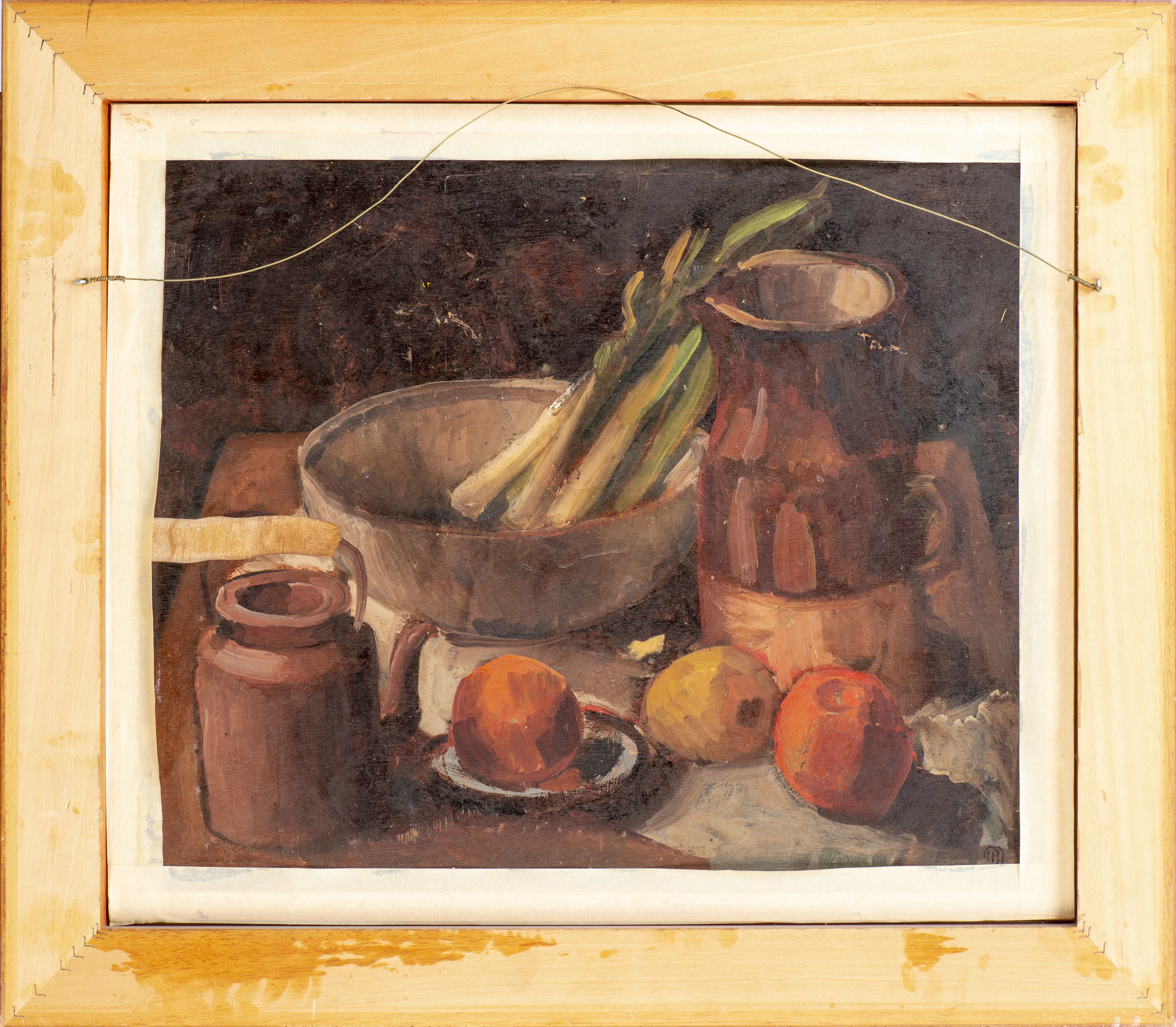 Huile sur panneau peint au recto et au verso, monogrammée en bg, avec au dos une représentation d'une nature morte aux poireaux et fruits, monogrammée H.B. en bd