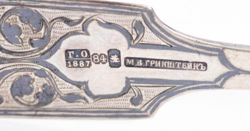 Service personnel en argent russe niellé de 84 Zolotnics de 1887, 1891 & 1893 comprenant une grande cuillère, une fourchette et une cuillère à dessert.