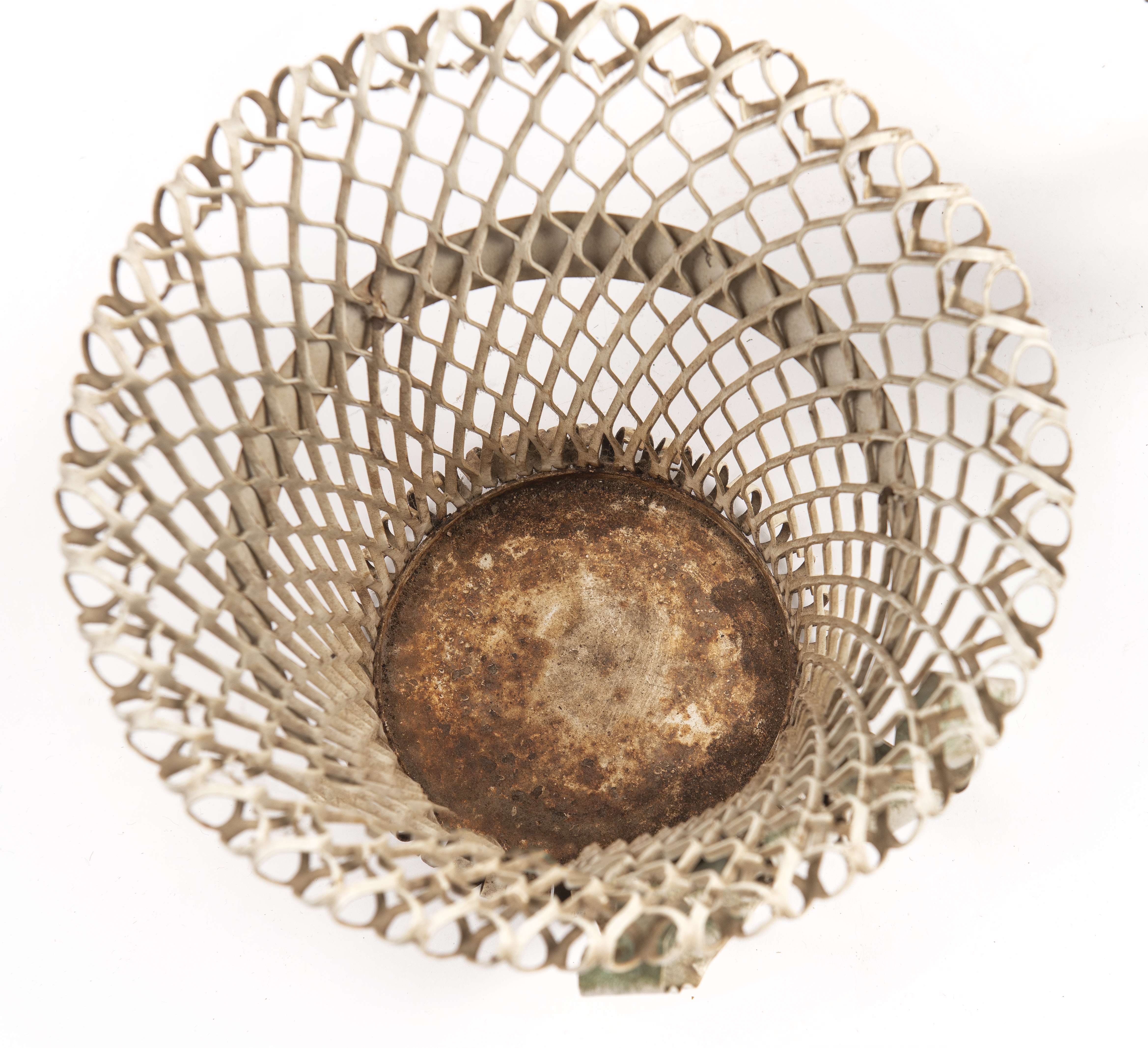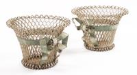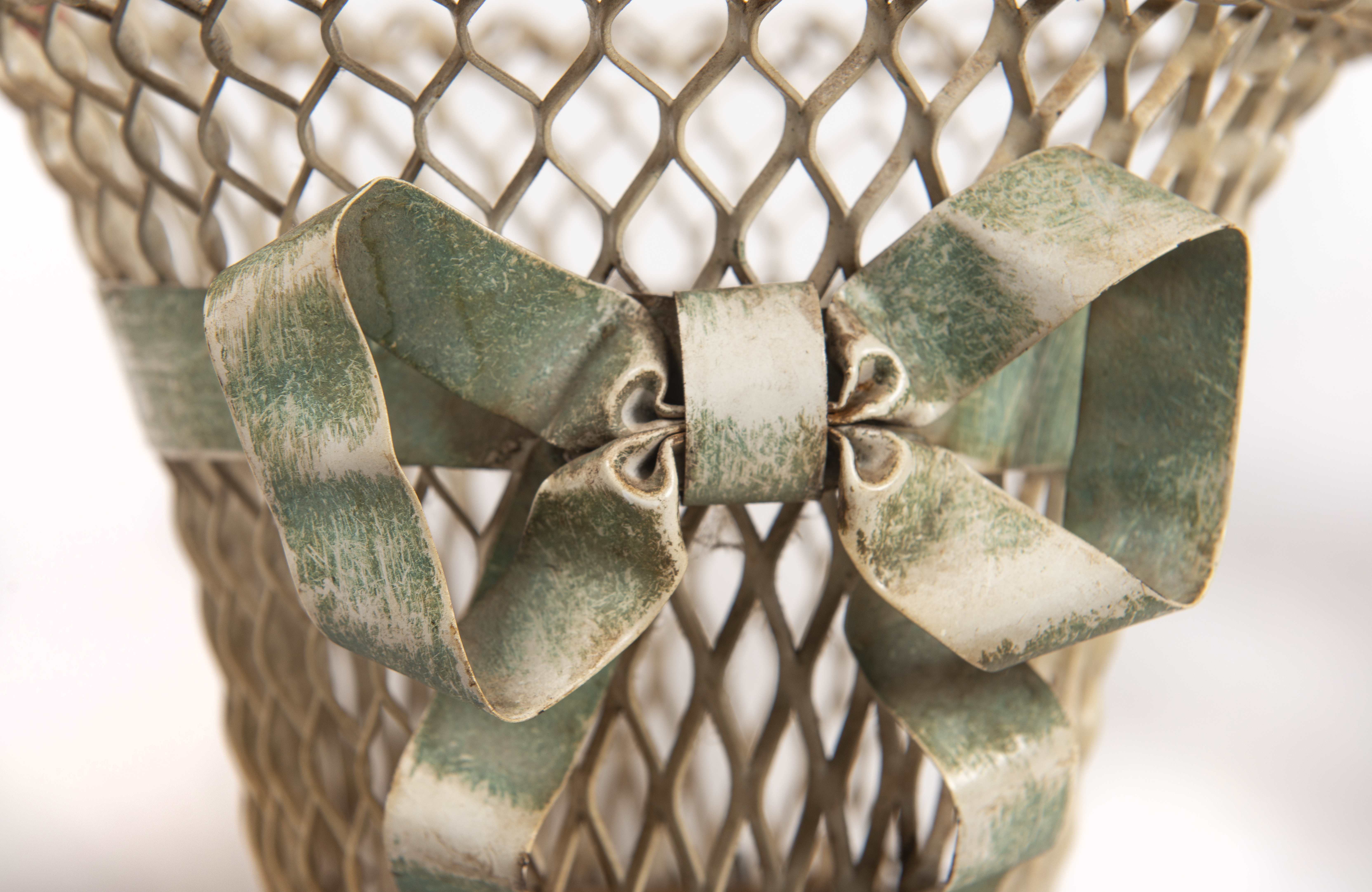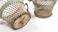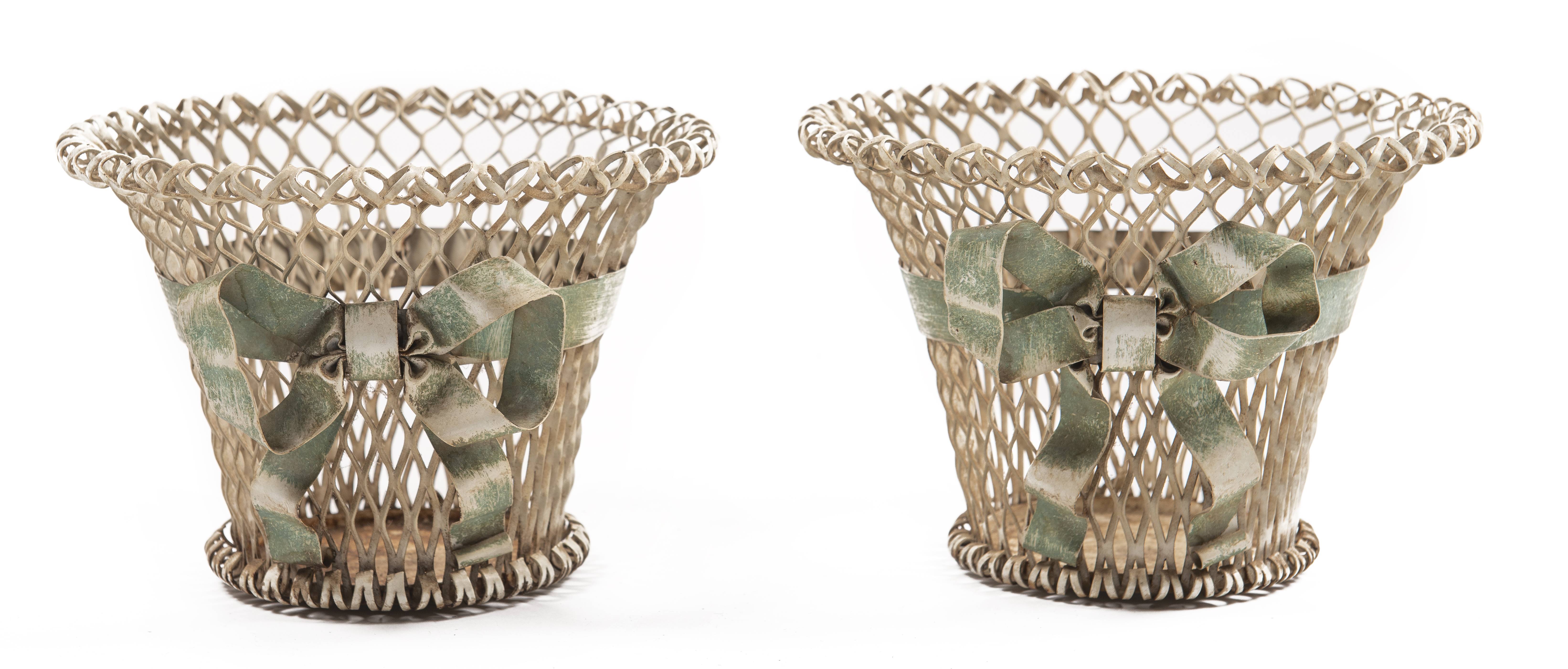Paire de corbeilles en fer tressé peintes en blanc, ornées d'un ruban noué en fer sur la panse, XIXe.