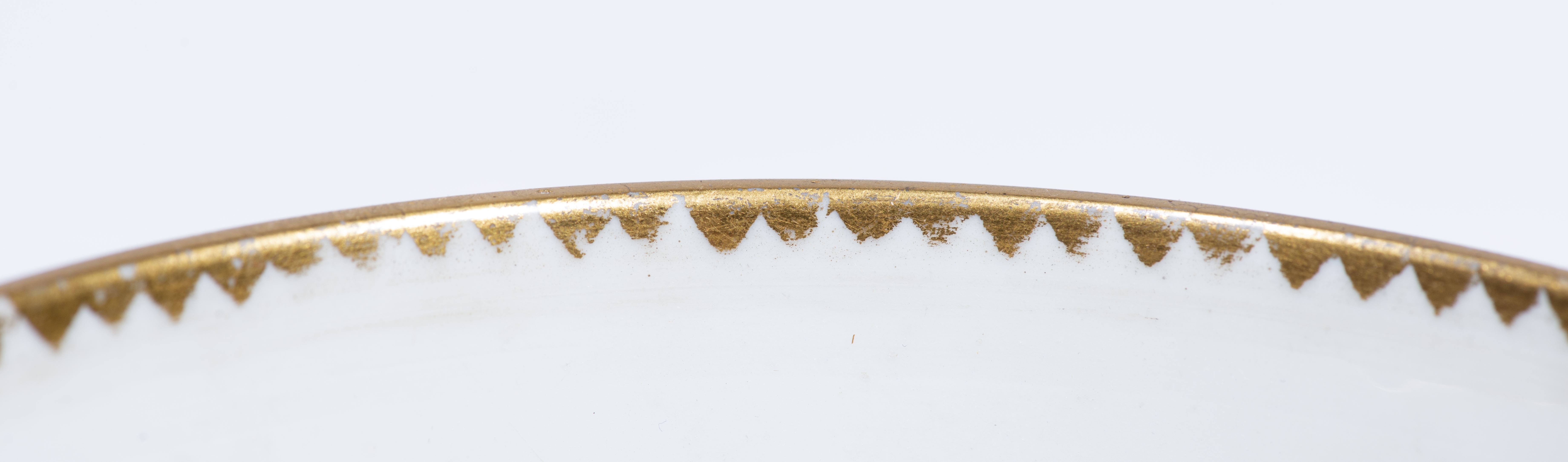 On y joint une tasse et sous-tasse en porcelaine russe par la manufacture Trapvevz Korinlovich inscrite sous la base, décor dans un médaillon en couleurs d'une statue sur piédestal, champ principal miel à frise néogothique.