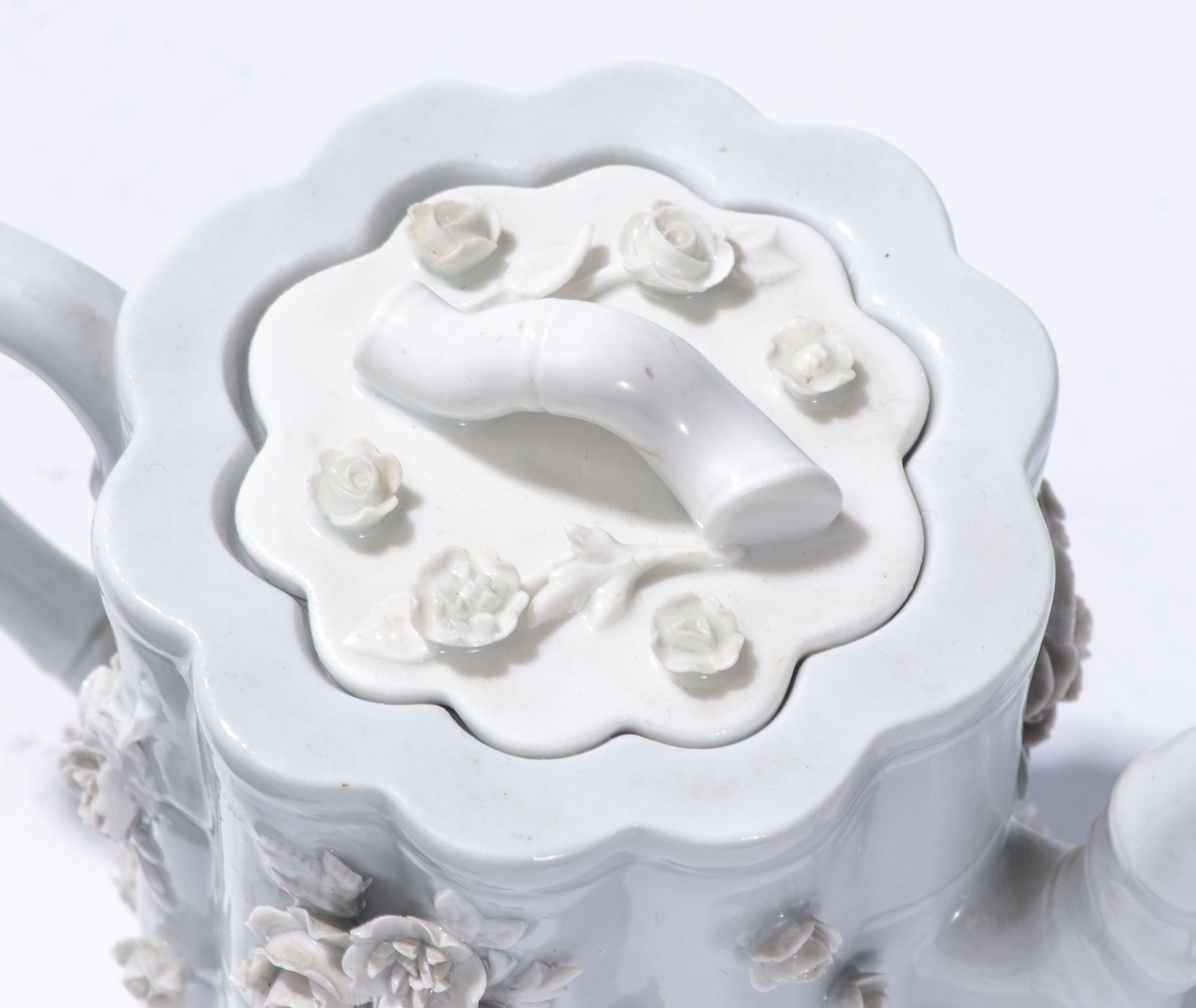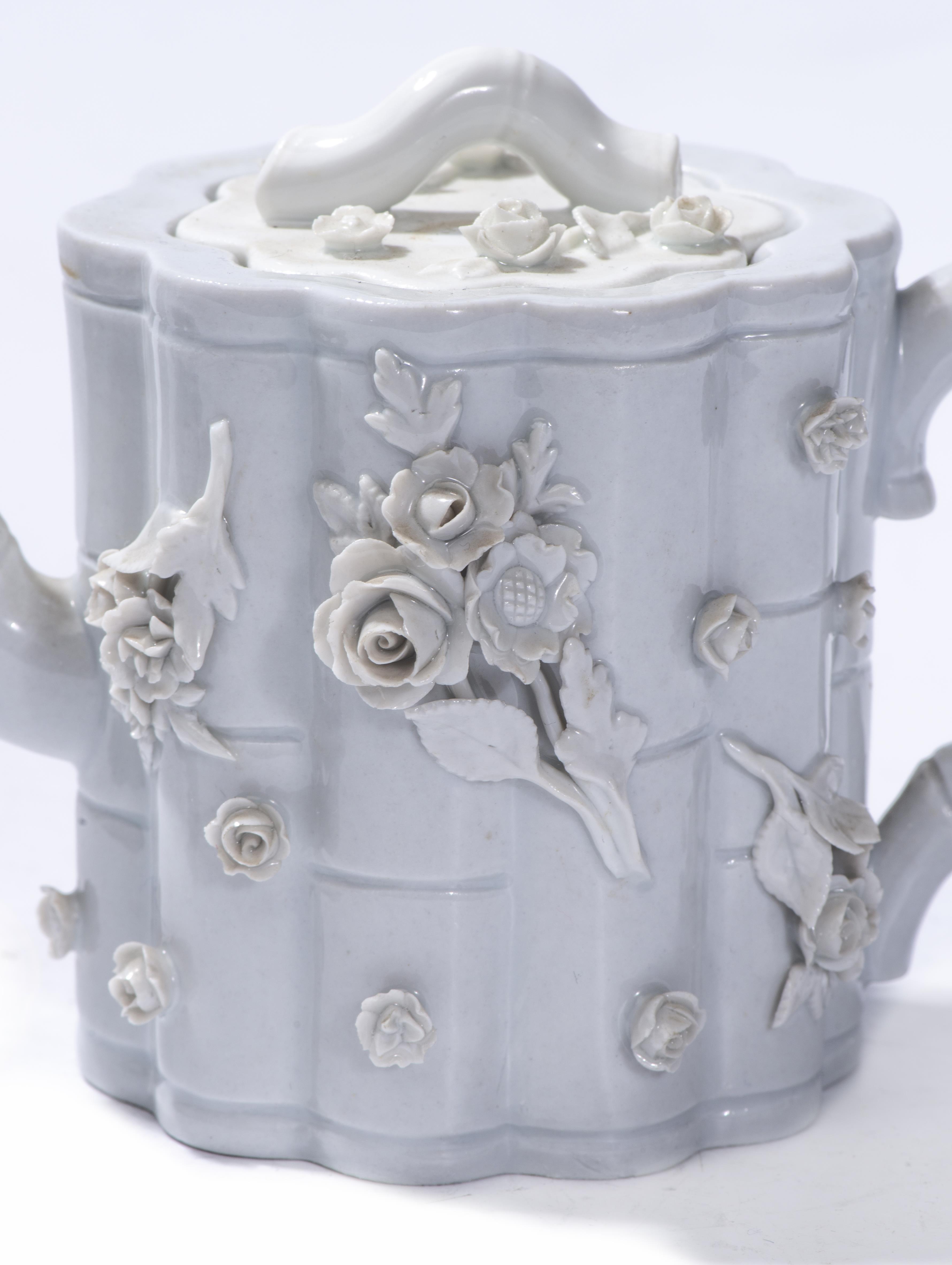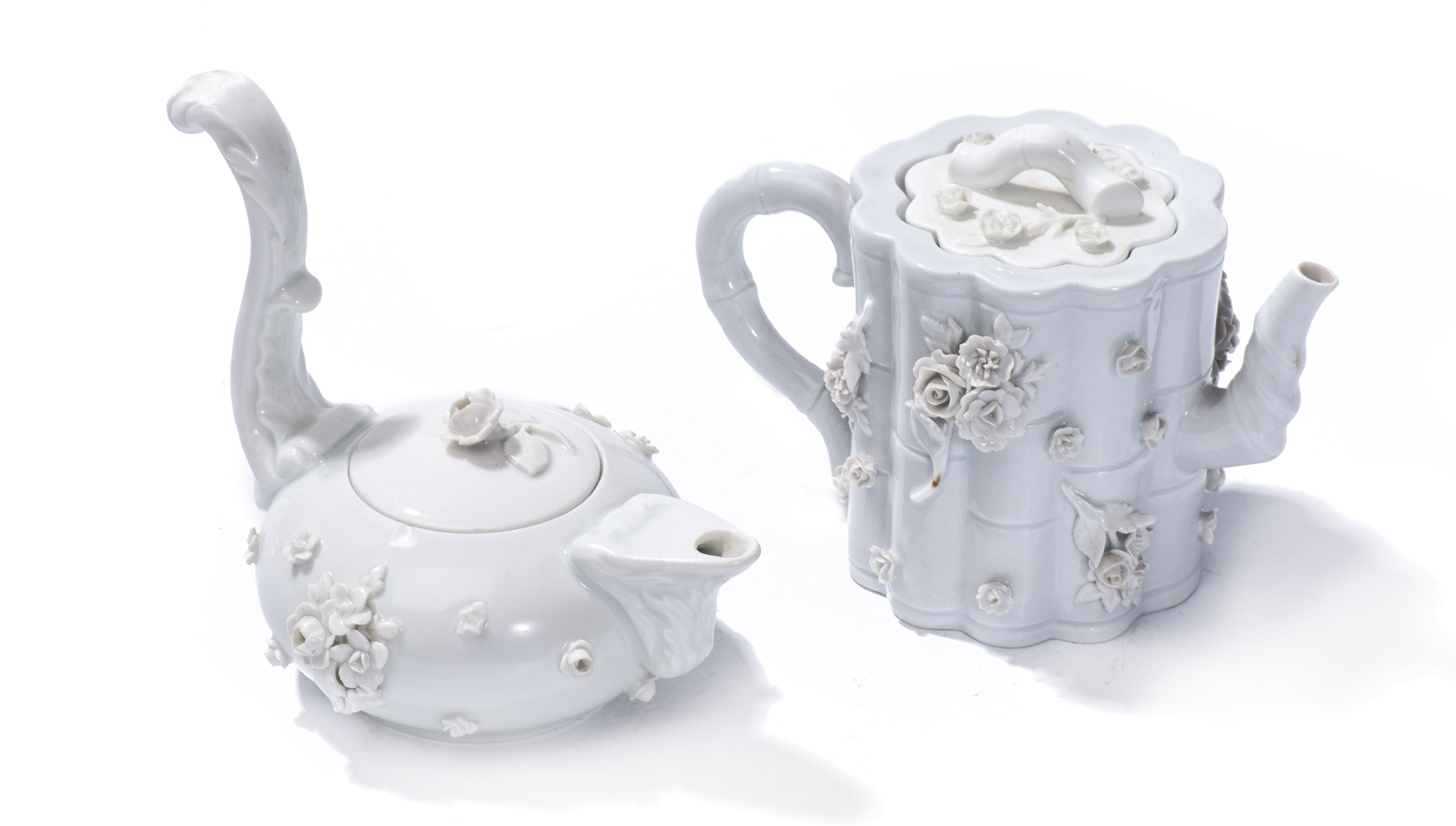 Meissen, deux théières imitant les blancs de Chine à décor en appliqué de roses et de branches de bambou.