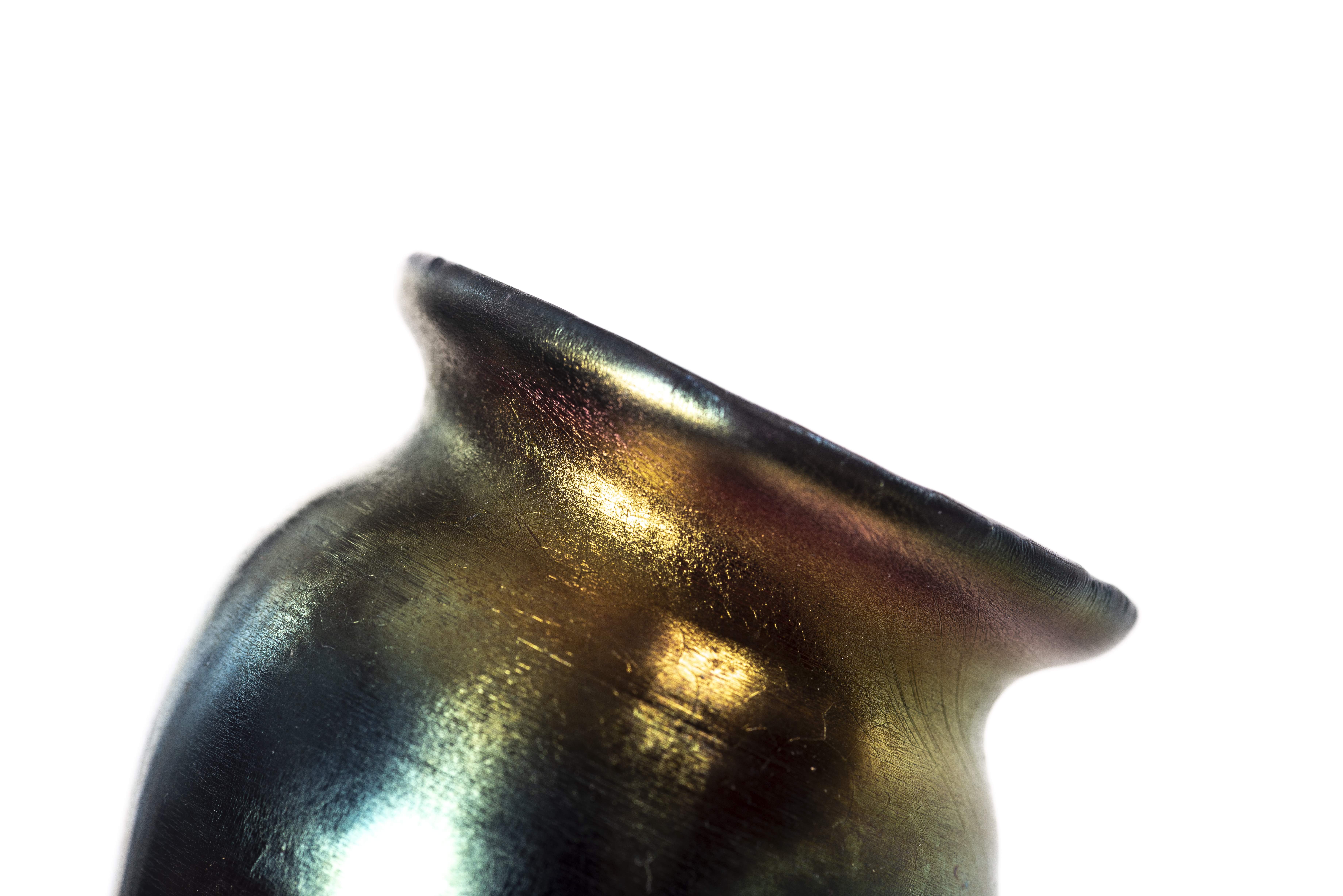 Johann Witwe Loetz, dans le goût de, vase en verre double irisé, à col circulaire en retrait. Couleurs verte et violette très contrastées à reflets métalliques intenses.