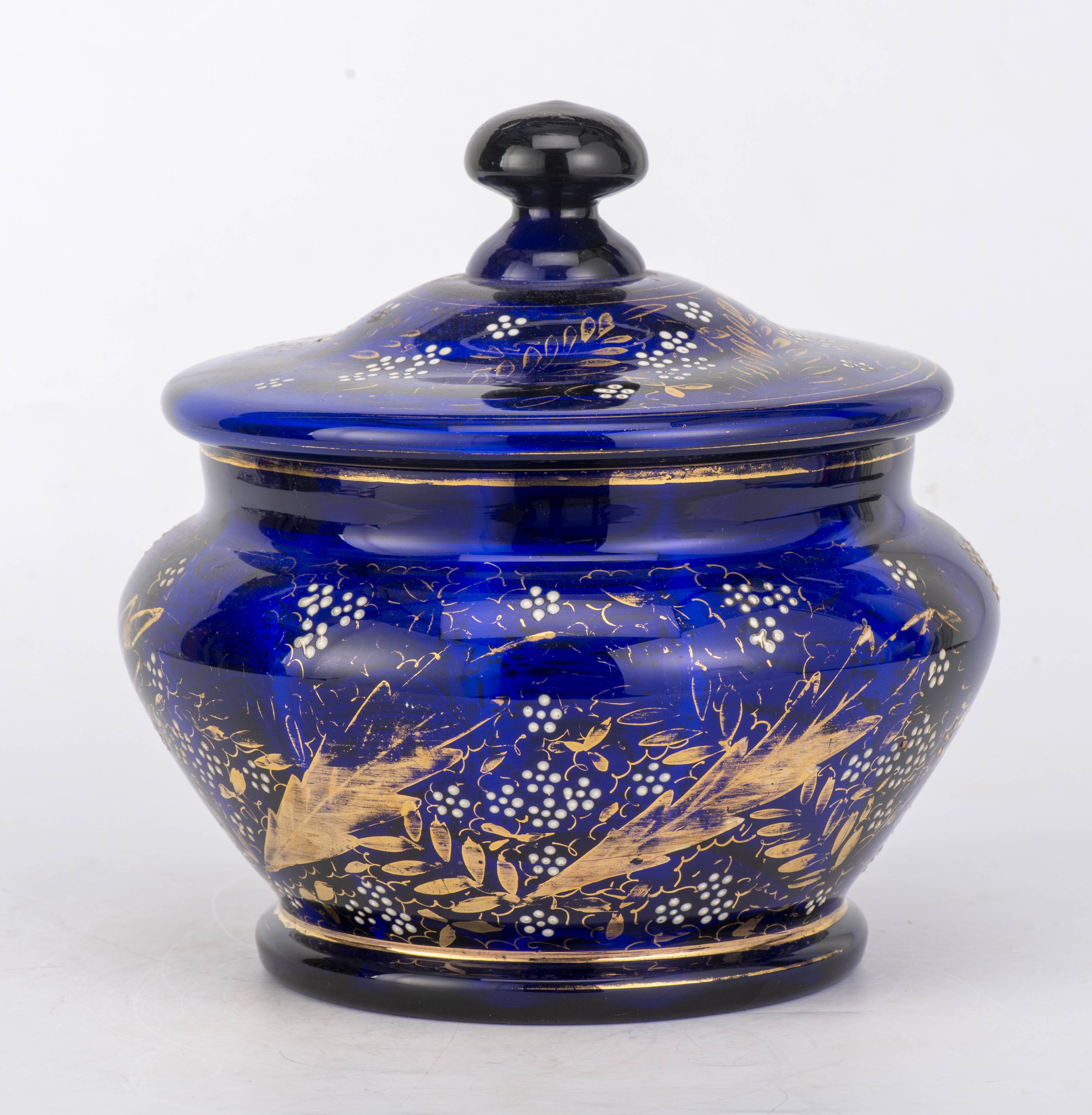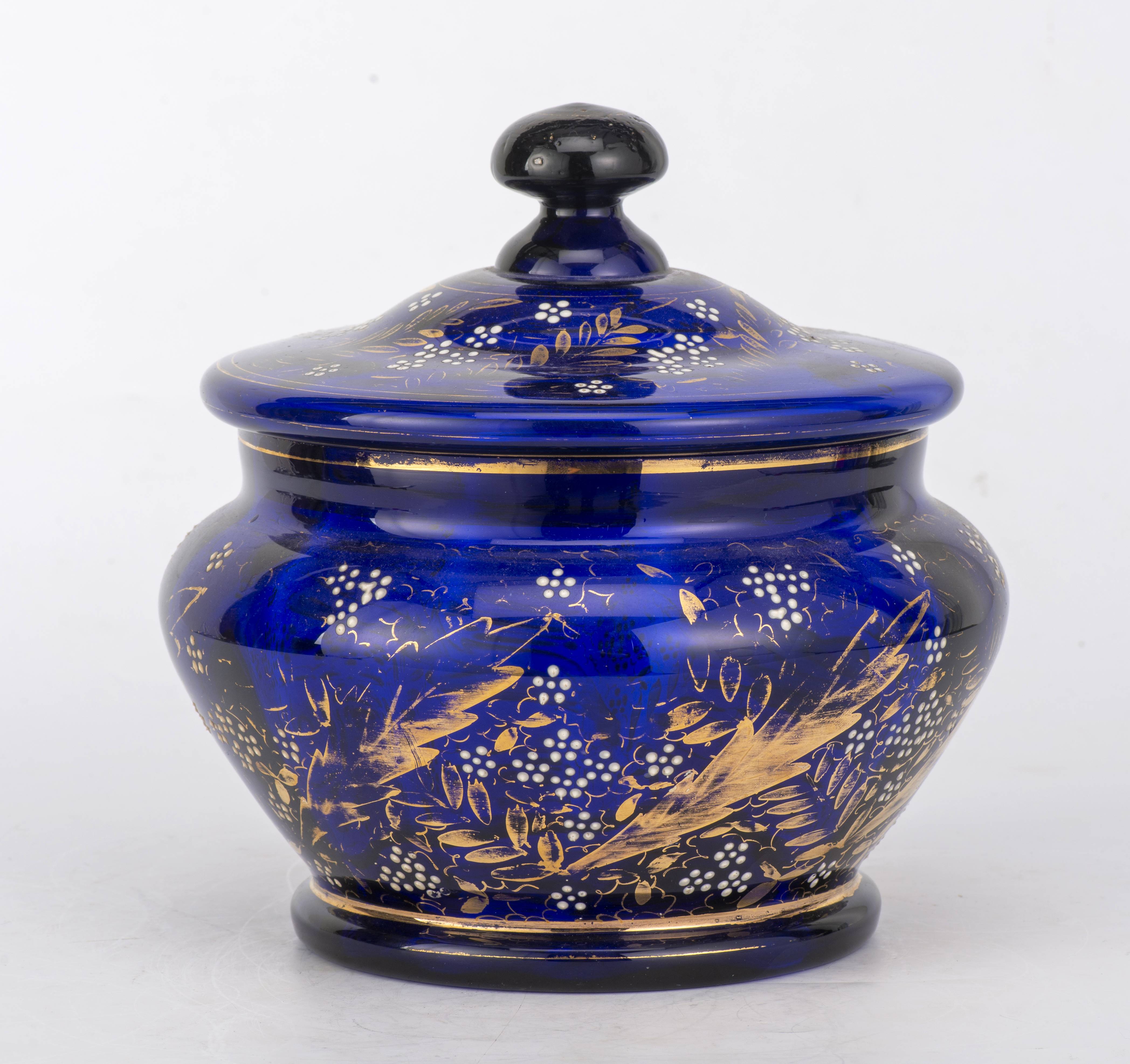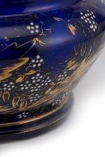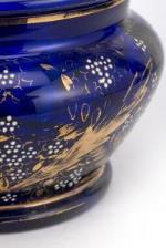 Bonbonnière en verre bleu à surdécor floral blanc et or, Italie, vers 1900.