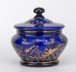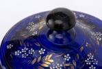 Bonbonnière en verre bleu à sur décor floral blanc et or