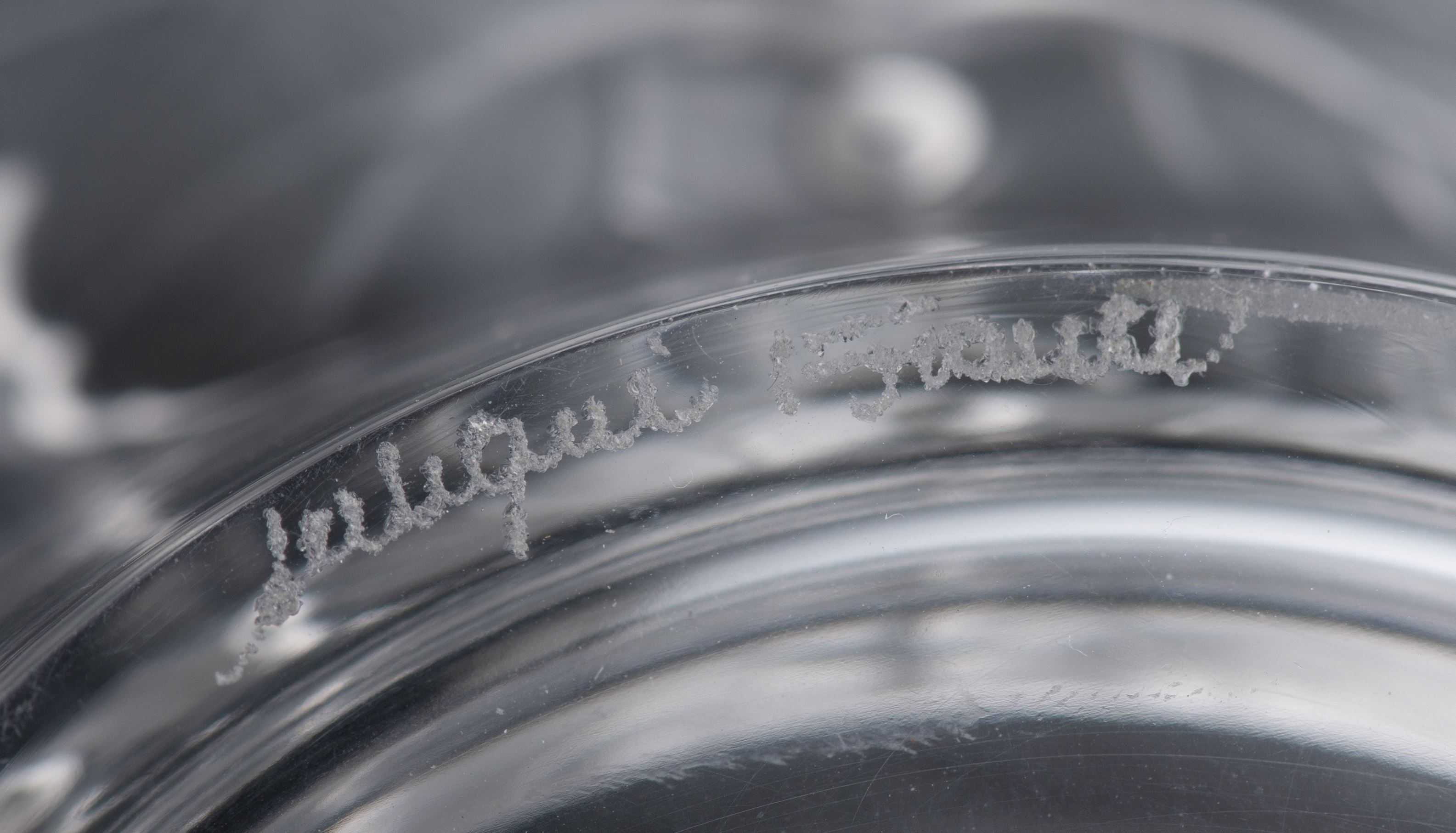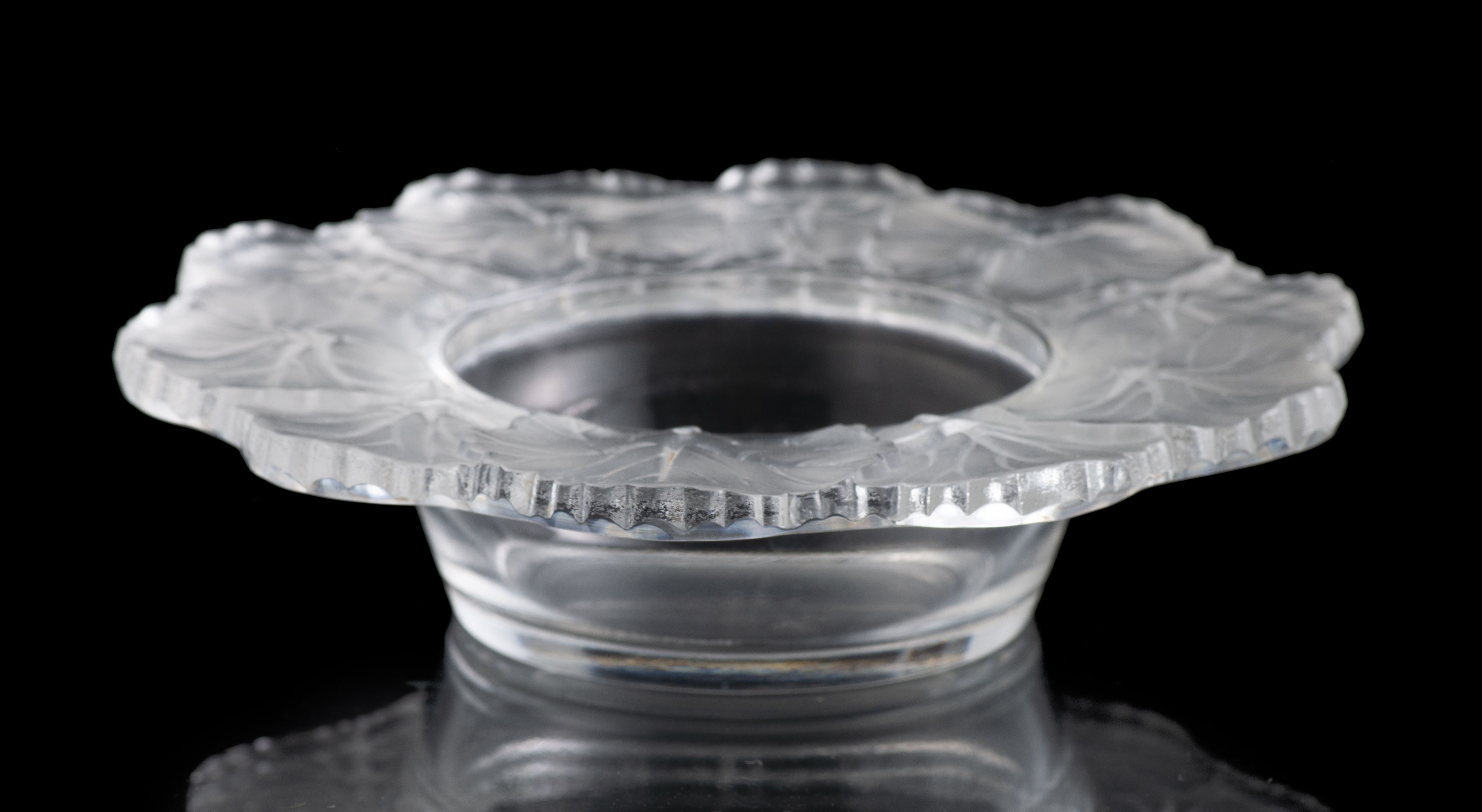 Lalique R. France, cendrier en verre moulé à décor de feuilles nervurées, signé au pointil Lalique ® France sous la base (depuis 1978).