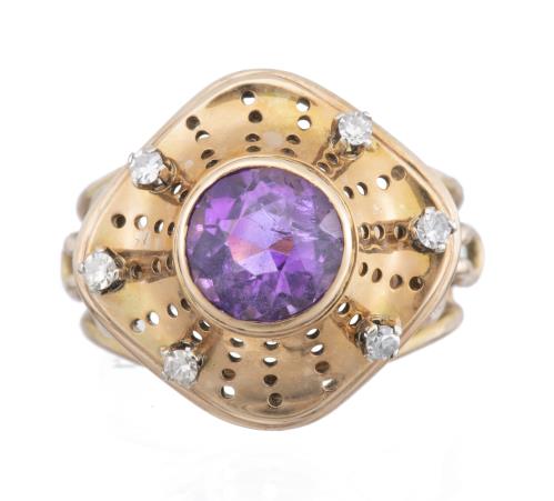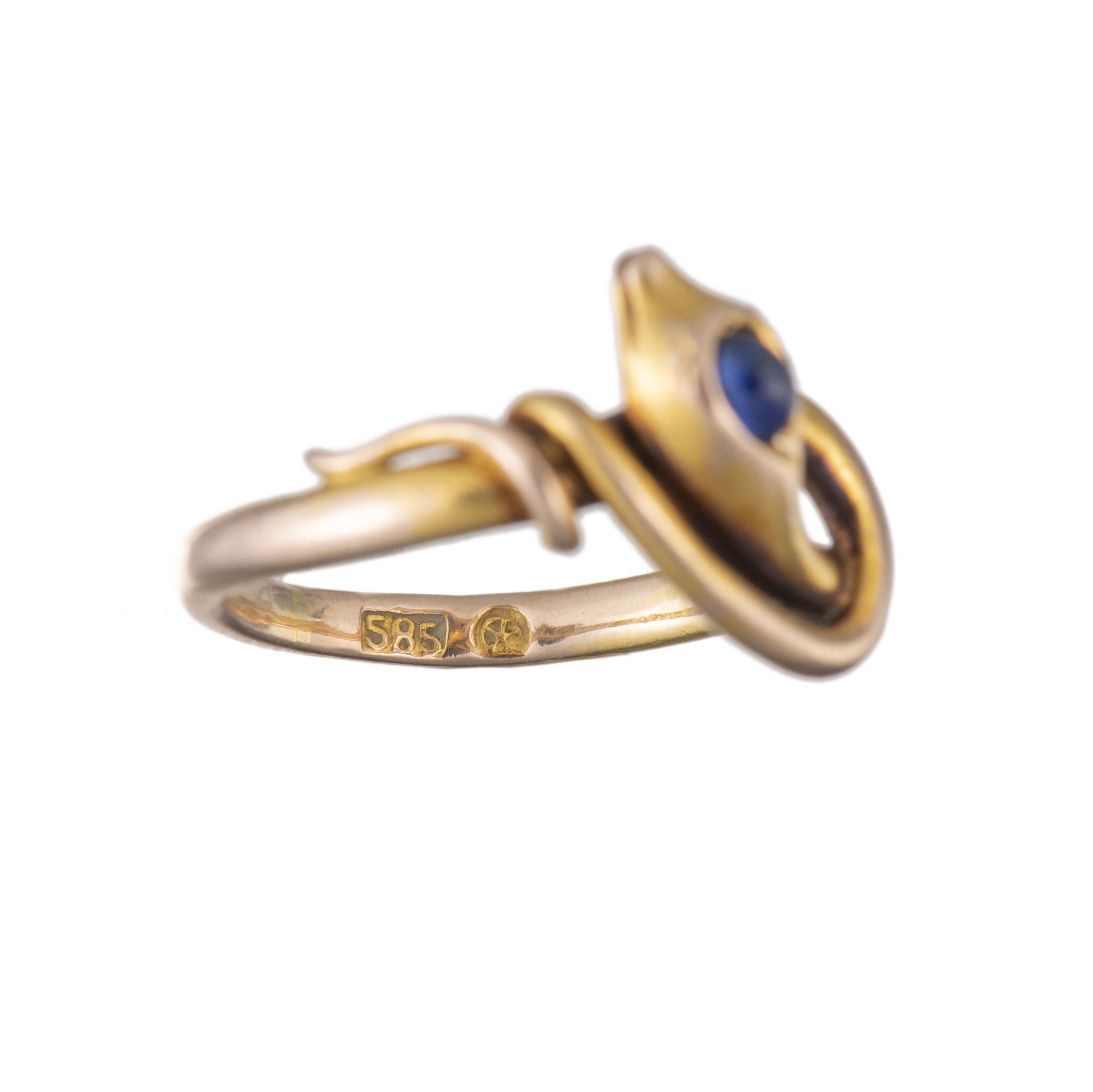 Bague en or jaune .585 en forme de tête de serpent surmontée d'un saphir cabochon.