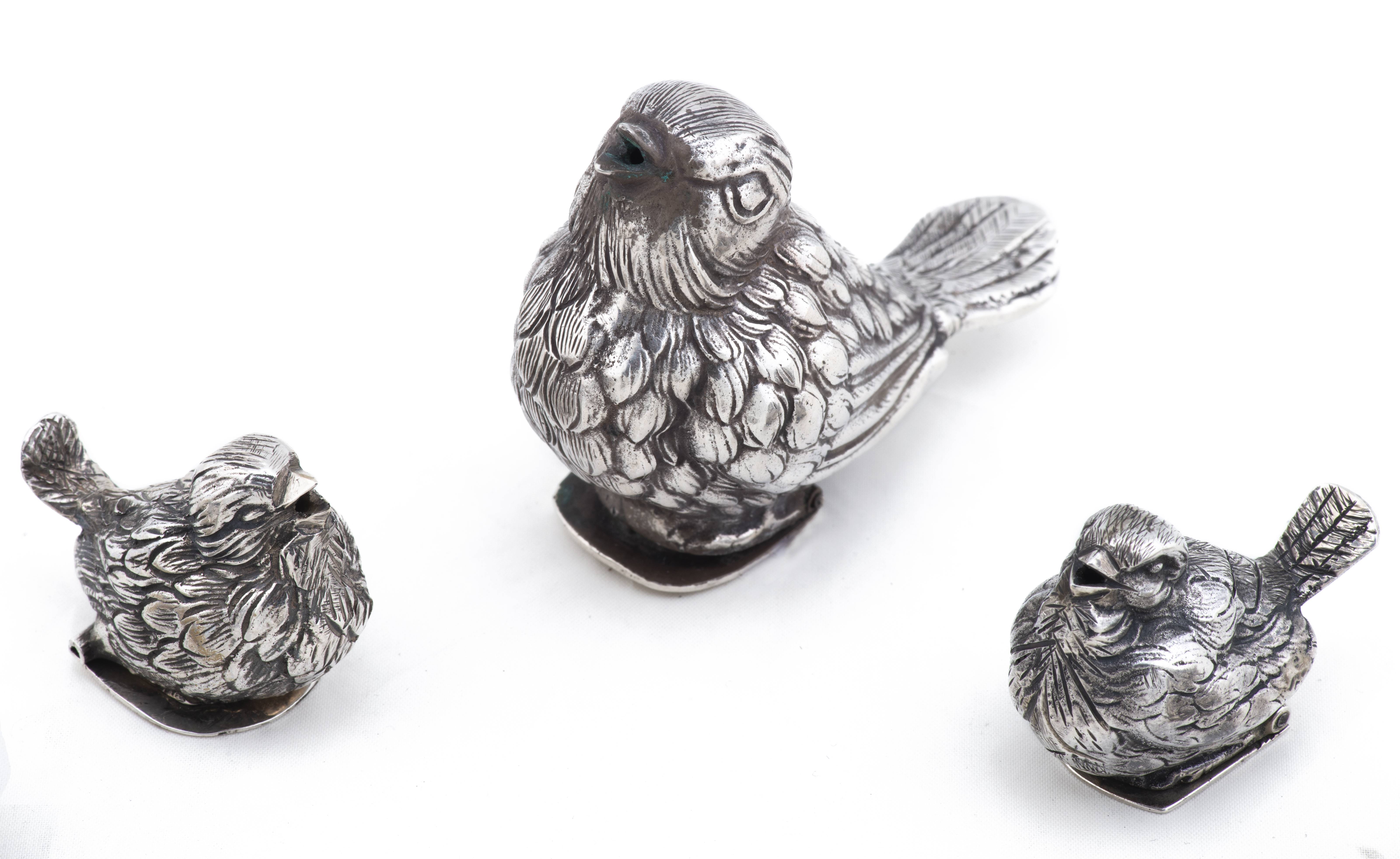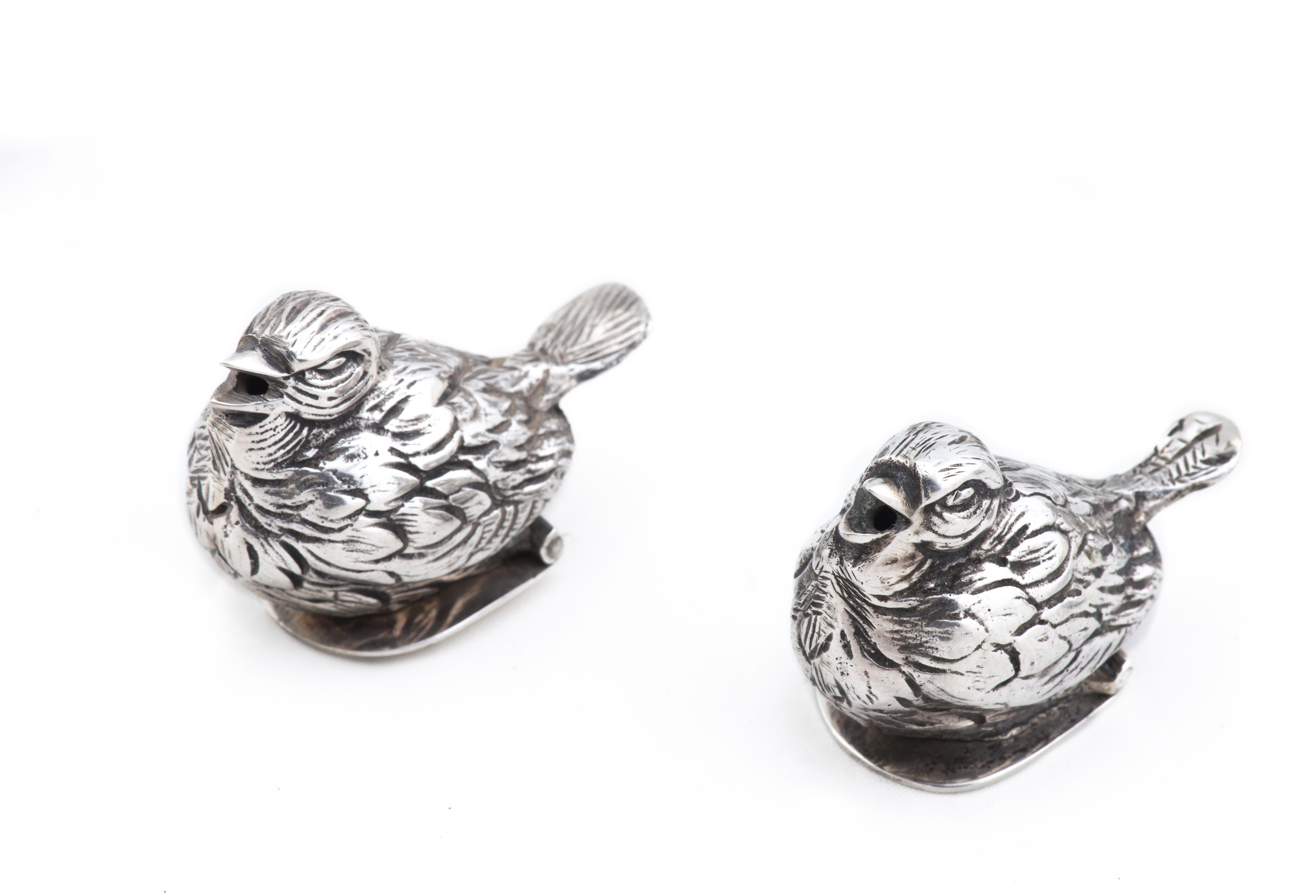 9 poivriers en argent .915 d'Espagne en forme de moineaux monogrammés GP.