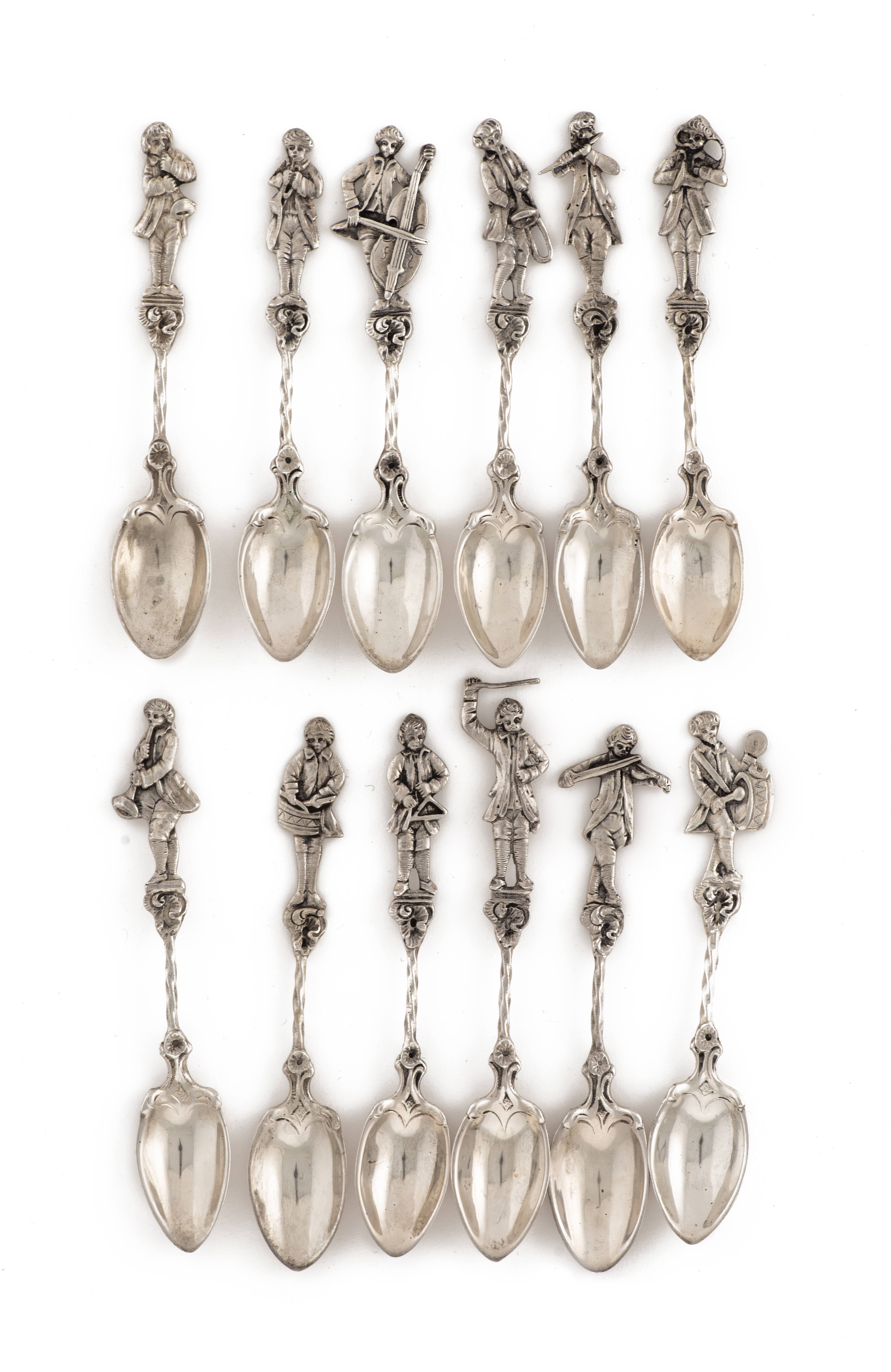 Douze cuillères à moka en argent .800 à manche terminé par un musicien
