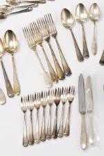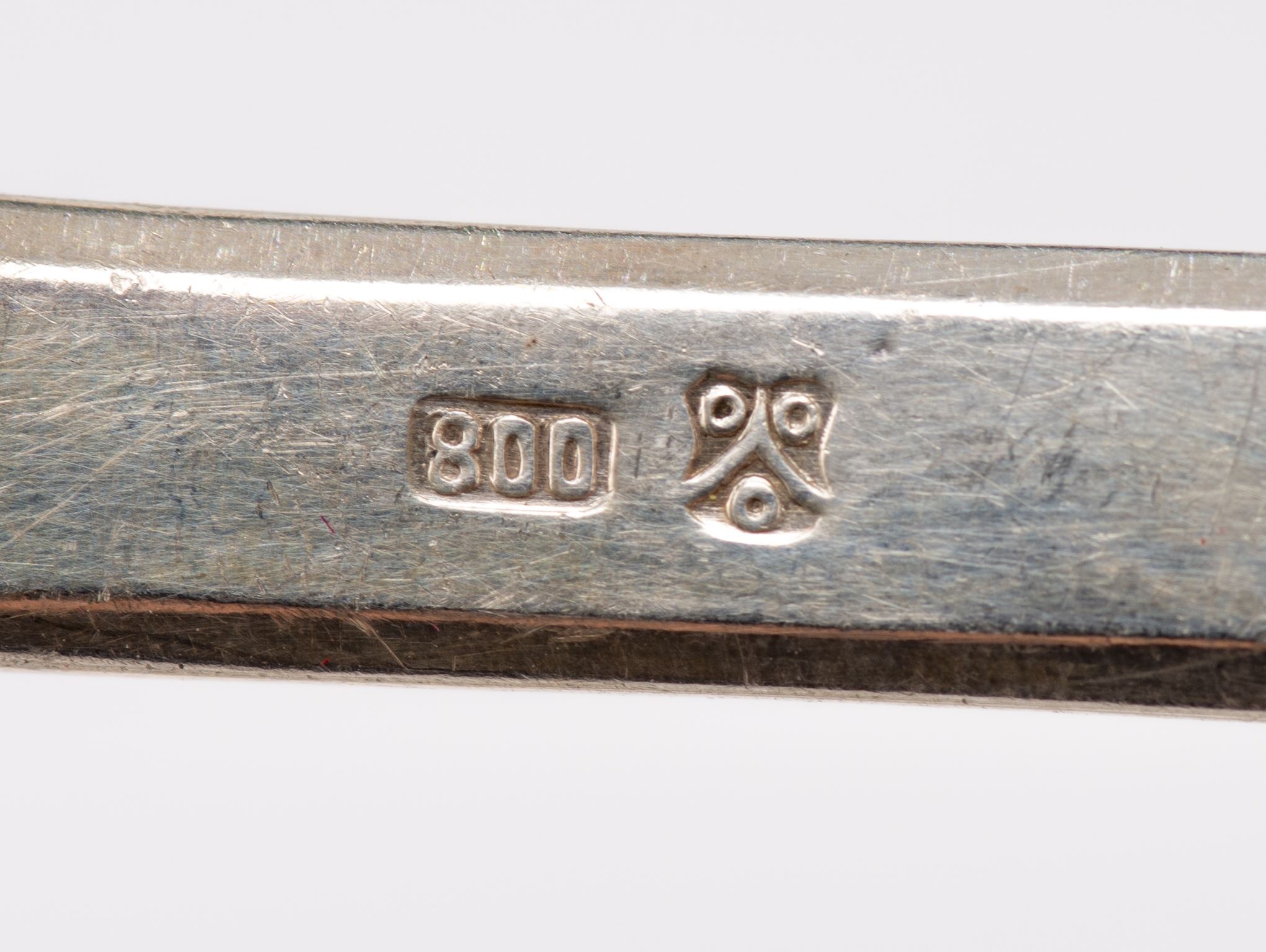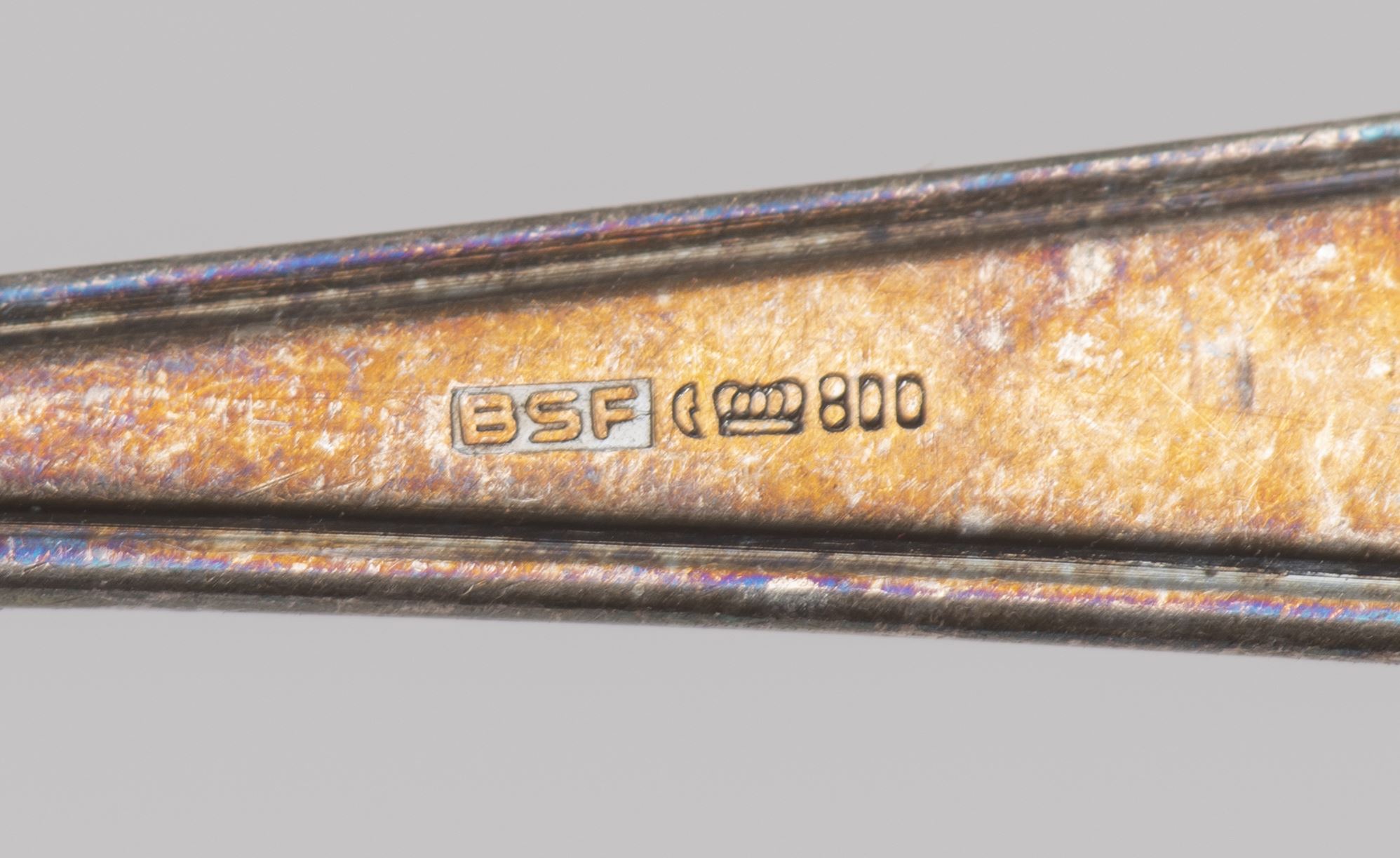 - couverts en argent allemand .800: 2 grandes cuillères: 21 cm, 2 grandes cuillères: 18 cm, 2 grandes fourchettes: 21 cm, 2 fourchettes: 18 cm, 8 fourchettes à dessert: 15.5 cm, 11 petites cuillères: 13 cm, 2 petites cuillères: 10.5 cm