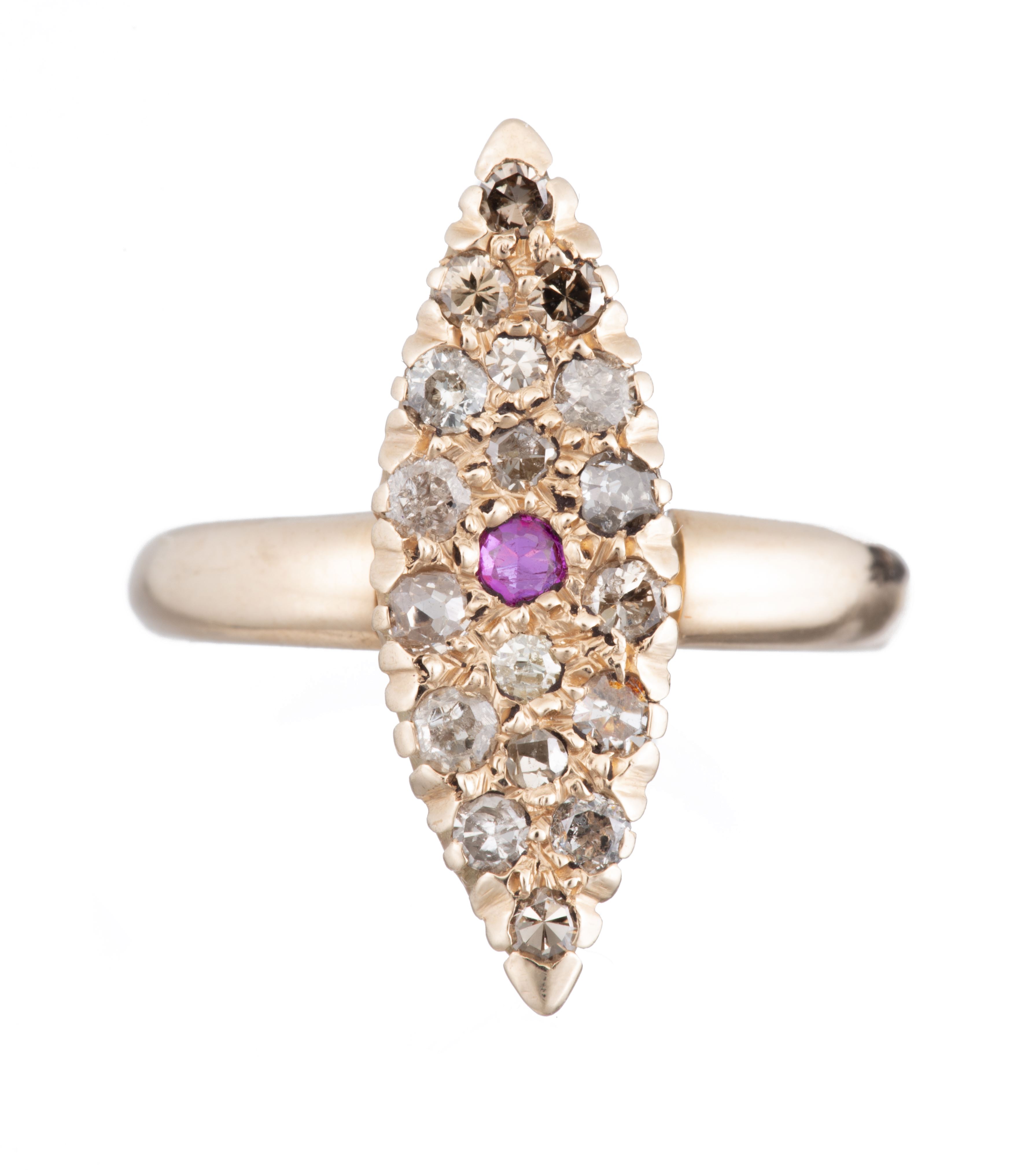 Bague en or rose .585 de forme marquise sertie au centre d'un rubis et pavée de 18 diamants de tailles différentes, 8/8, pleine taille et taille rose pour un total de 0.60 ct.